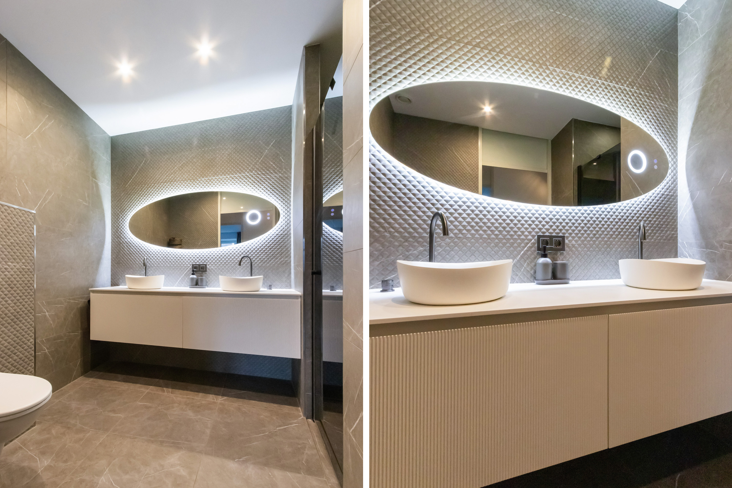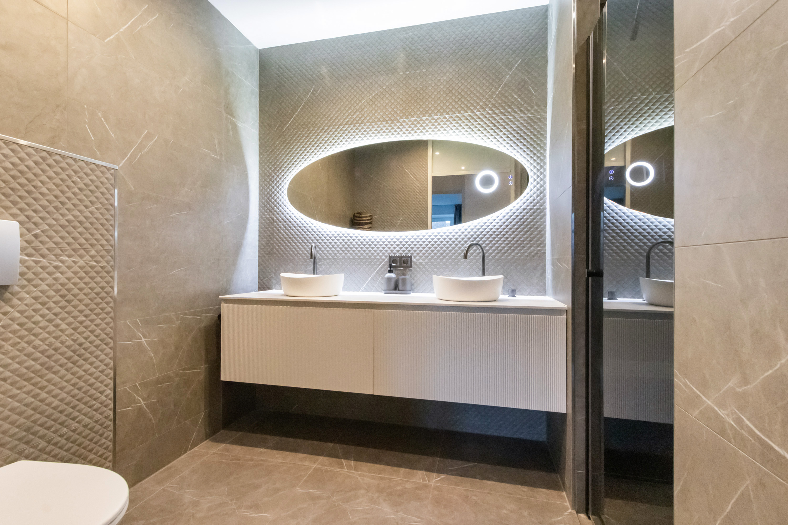 - Badkamer, inpandig gelegen, geheel betegelde wanden, ruime inloopdouche met regen- en handdouchekop, spiegel met verlichting en verwarming, wastafelmeubel met twee waskommen en wandcloset. De badkamer is eind 2024 volledig vernieuwd.