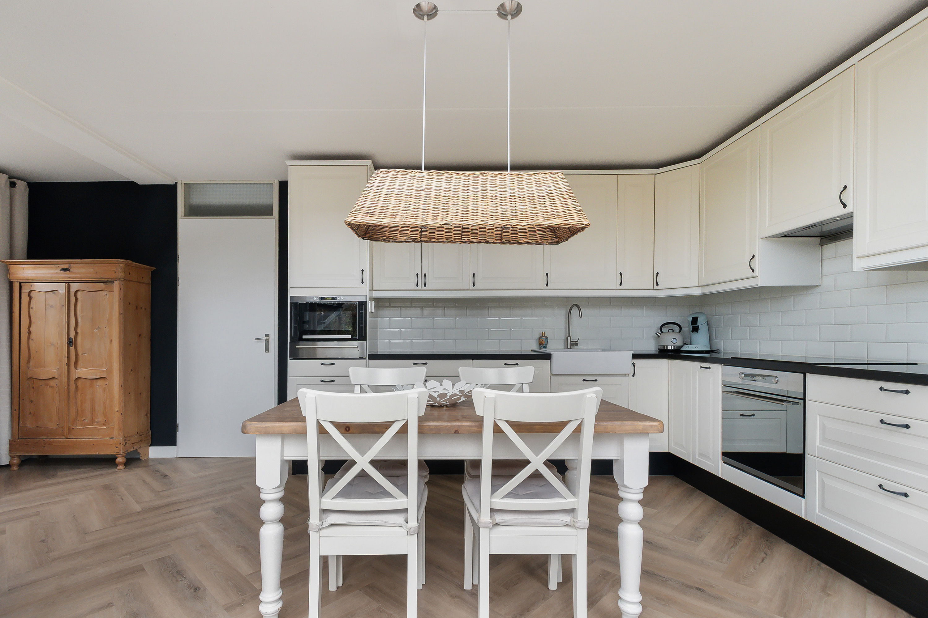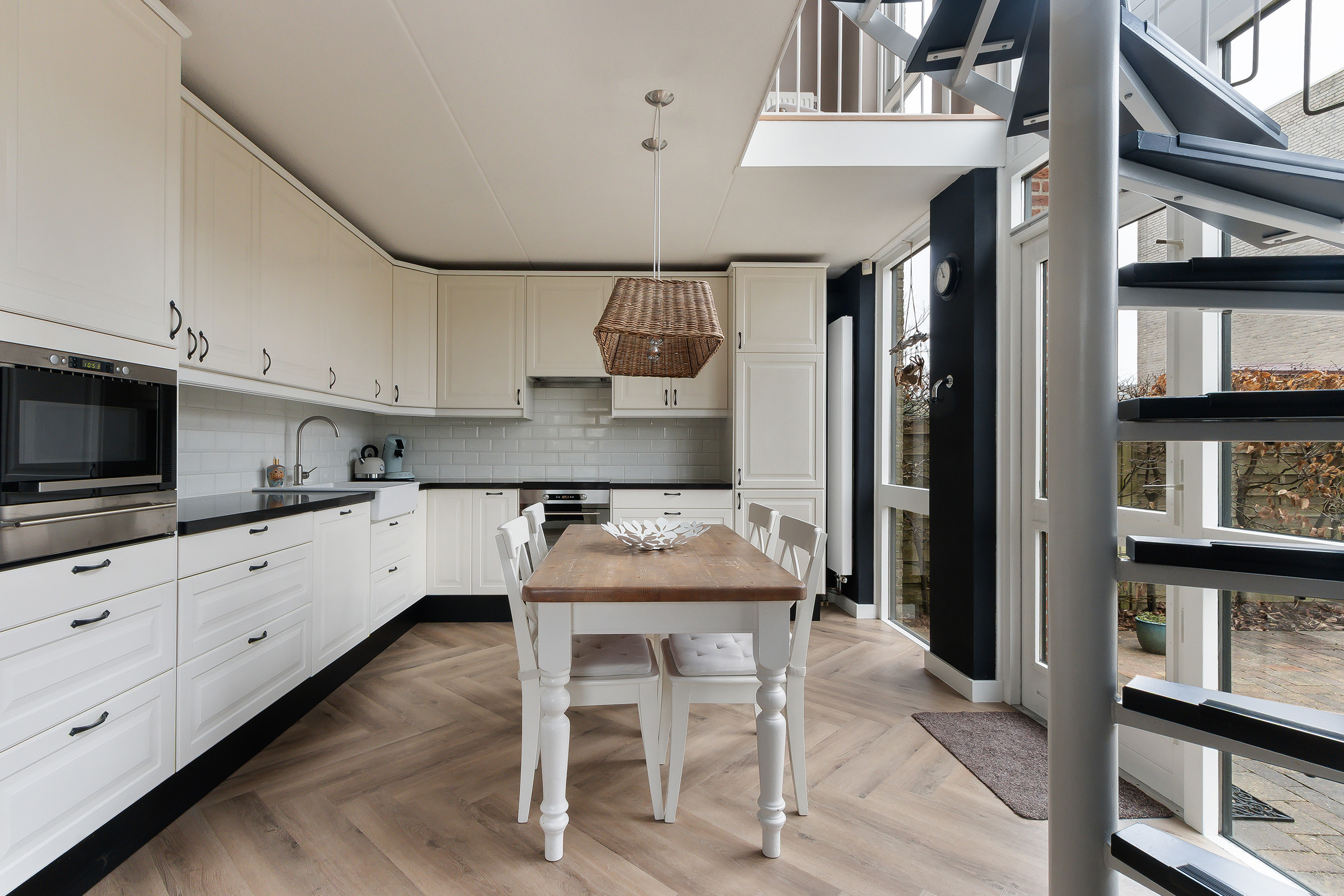- Keuken in L-opstelling met composiet blad voorzien van diverse inbouwapparatuur te weten: vaatwasser (Miele), magnetron, oven, 4-pits inductiekookplaat, koelvriescombinatie en diverse onder- en bovenkasten. Voorzien van elektrische vloerverwarming;