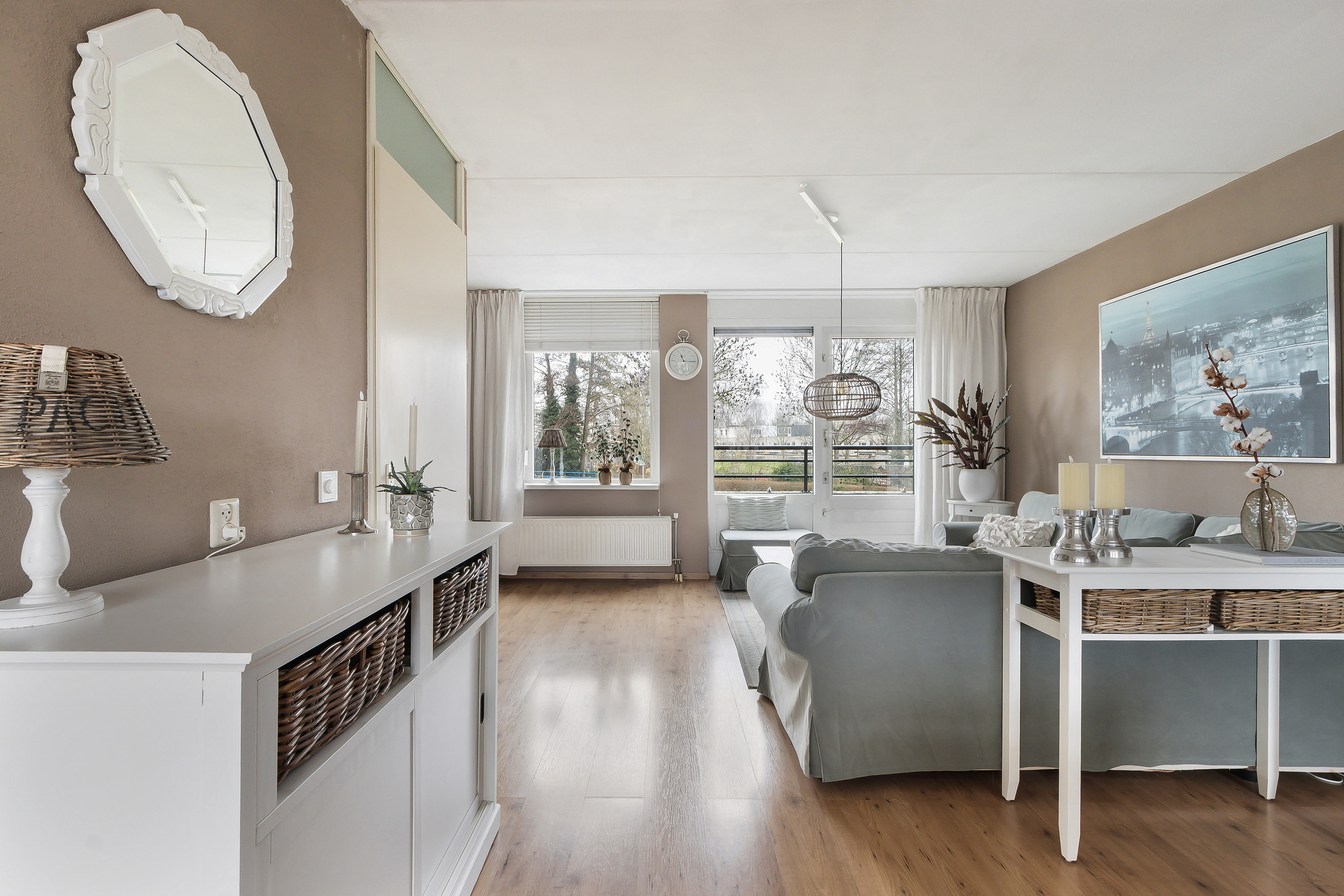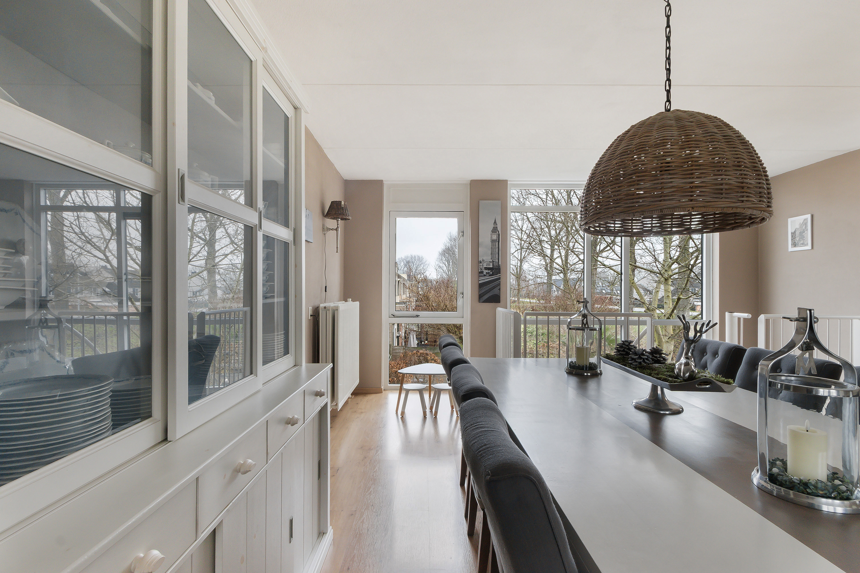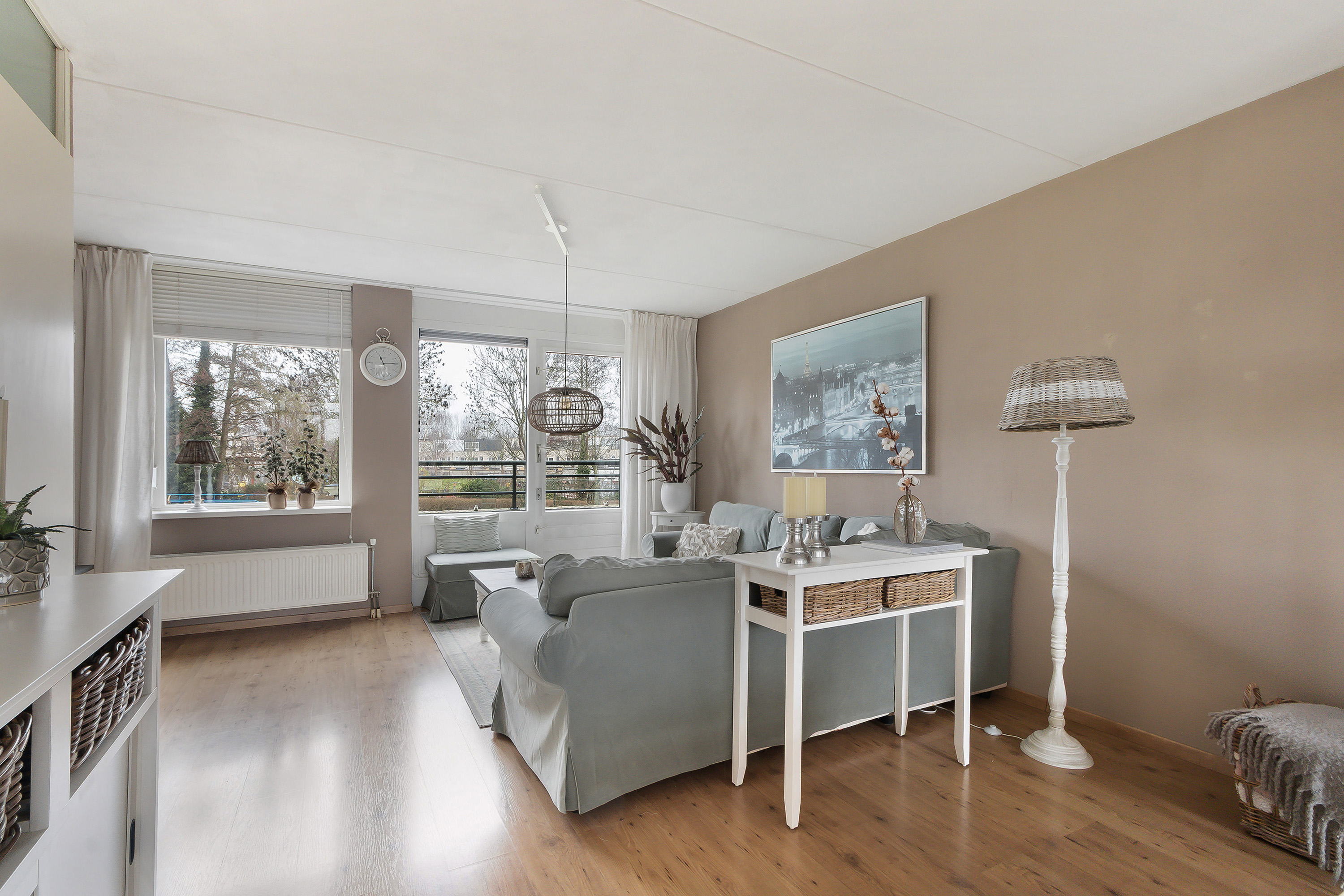 - Comfortabele en royale L-vormige living (ca. 38 m²), aan achterzijde begrensd door de vanaf de begane grond doorlopende glazen pui/vide. Door hoekligging van de woning een fantastisch vrij uitzicht aan zowel de voor- als de achterzijde. In het zijgedeelte zijn voorzieningen aanwezig voor het realiseren van een keuken bij het woongedeelte en is voorzien van een ruime bergkast;