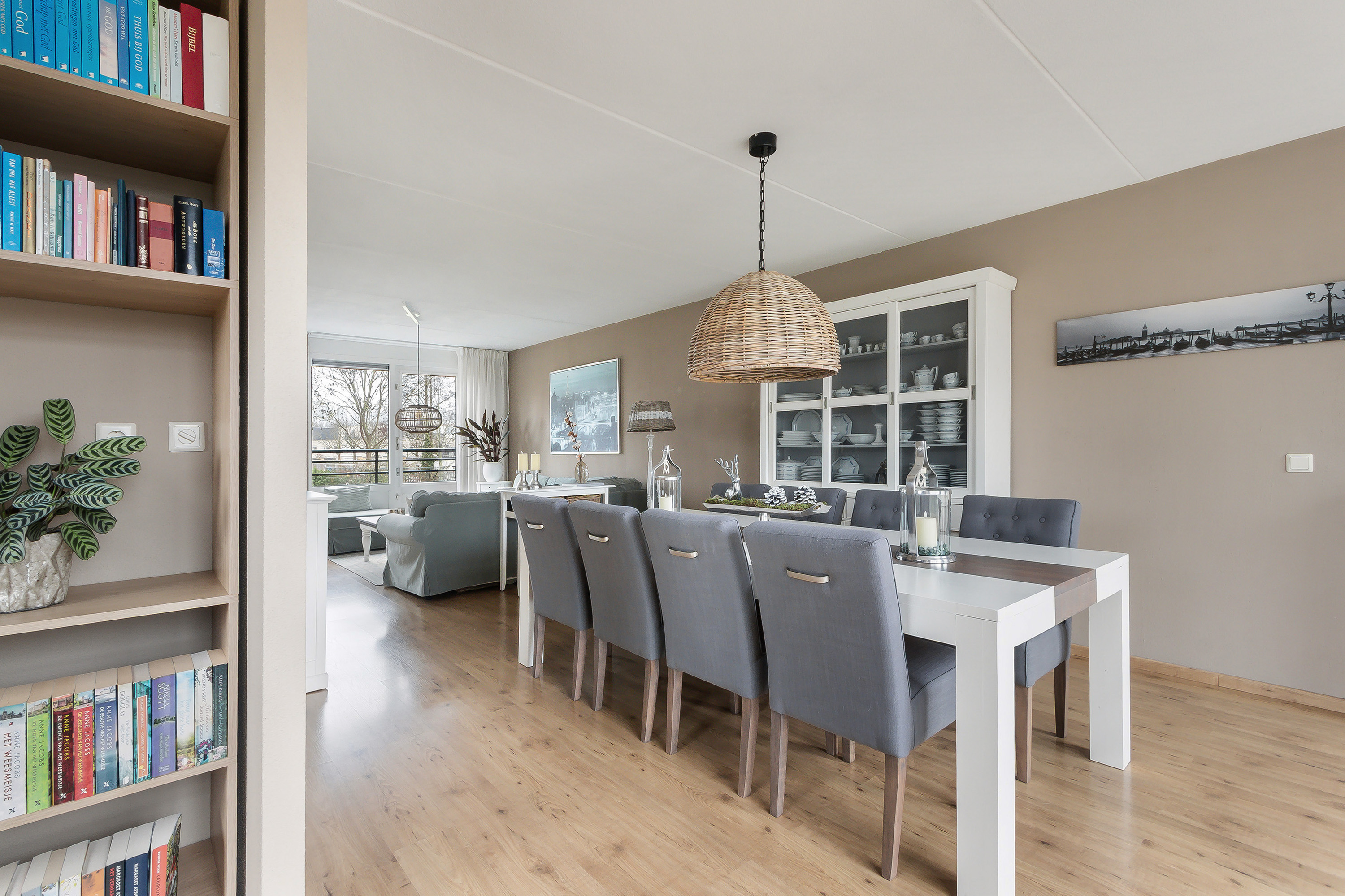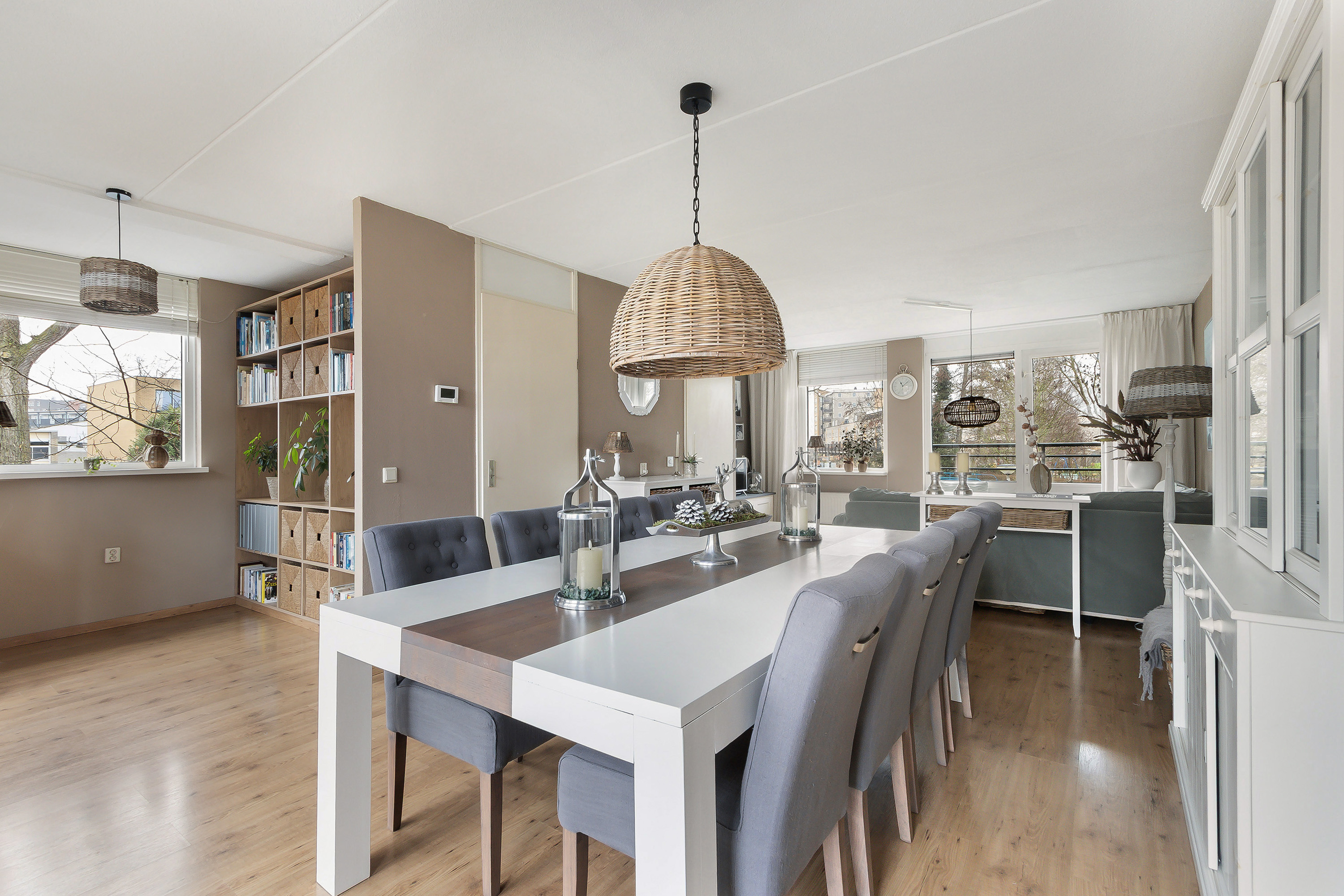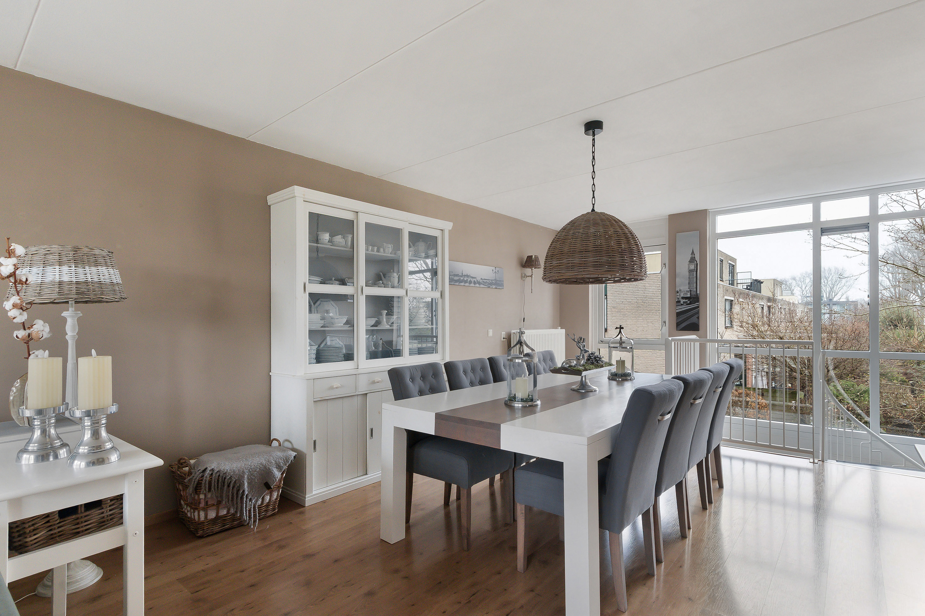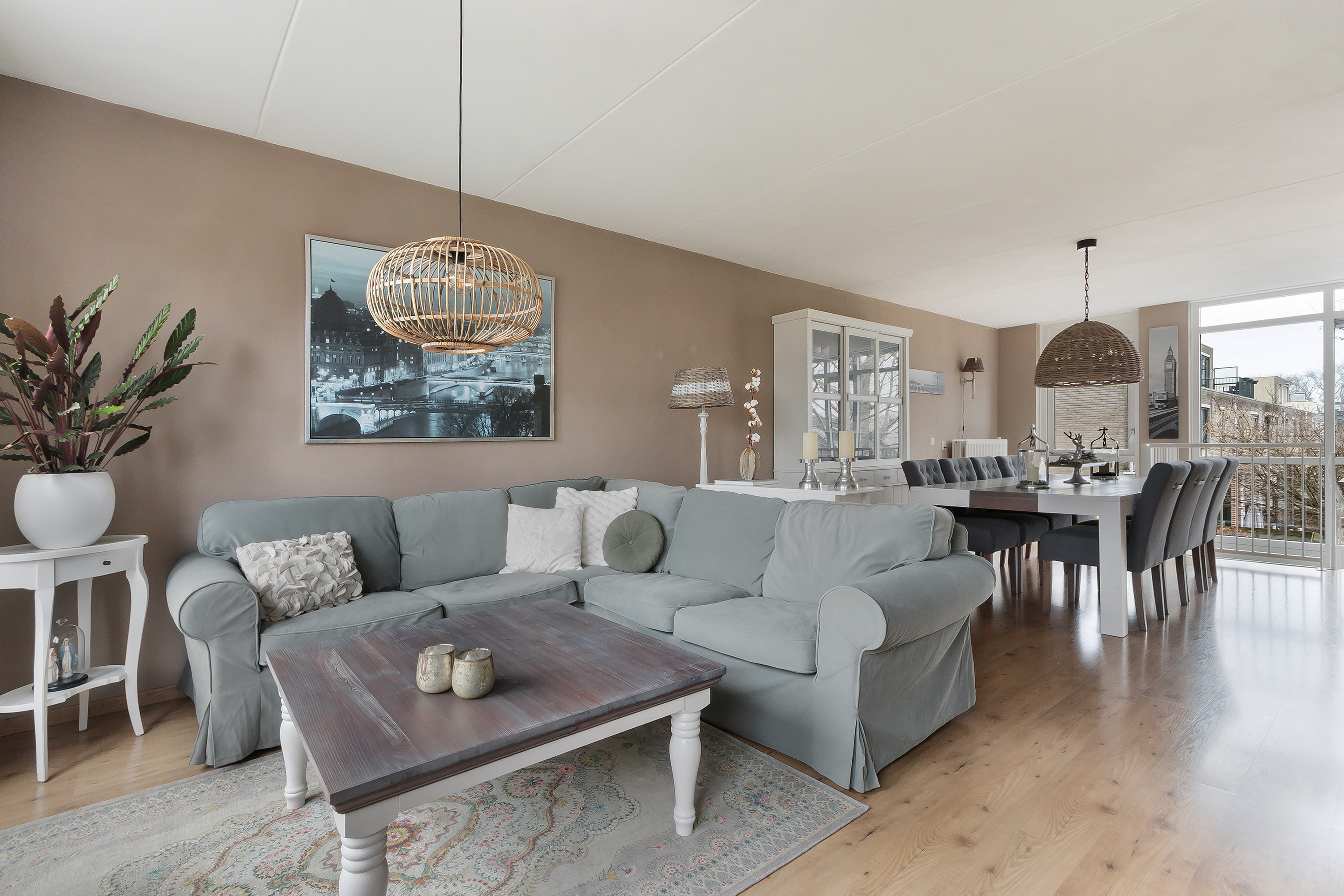 - Comfortabele en royale L-vormige living (ca. 38 m²), aan achterzijde begrensd door de vanaf de begane grond doorlopende glazen pui/vide. Door hoekligging van de woning een fantastisch vrij uitzicht aan zowel de voor- als de achterzijde. In het zijgedeelte zijn voorzieningen aanwezig voor het realiseren van een keuken bij het woongedeelte en is voorzien van een ruime bergkast;