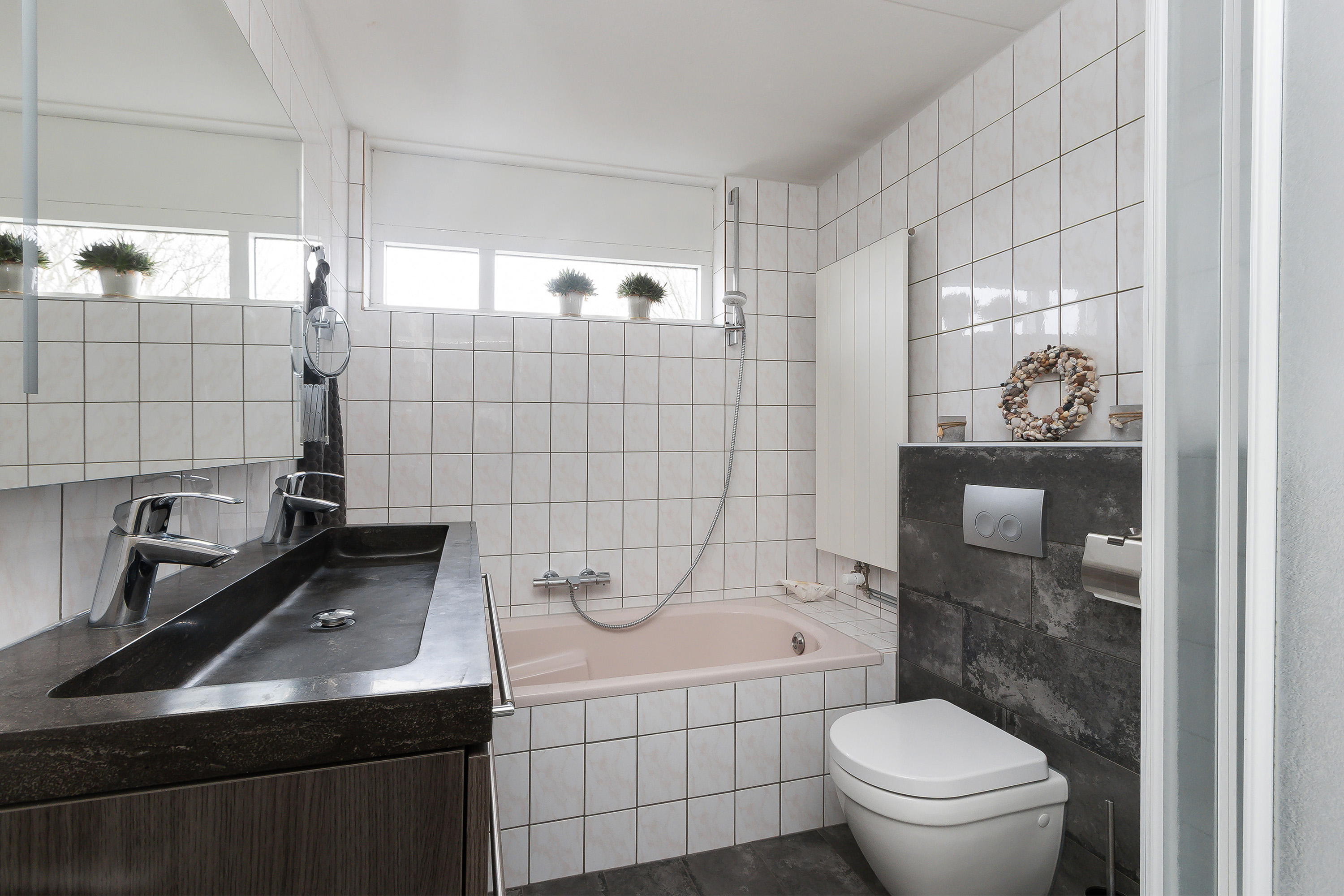 - Geheel betegelde badkamer met dubbele wastafel, douche, toilet en ligbad;