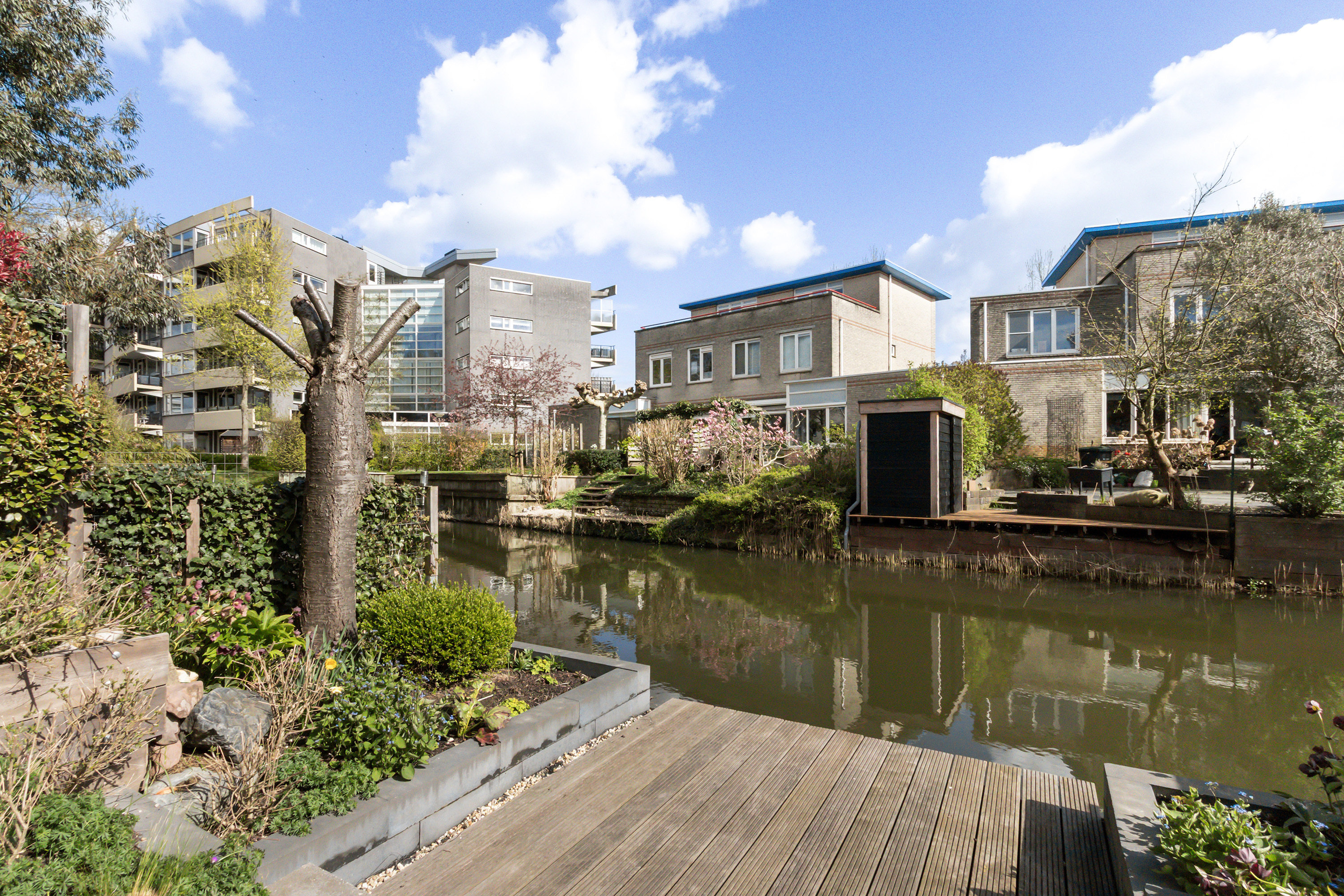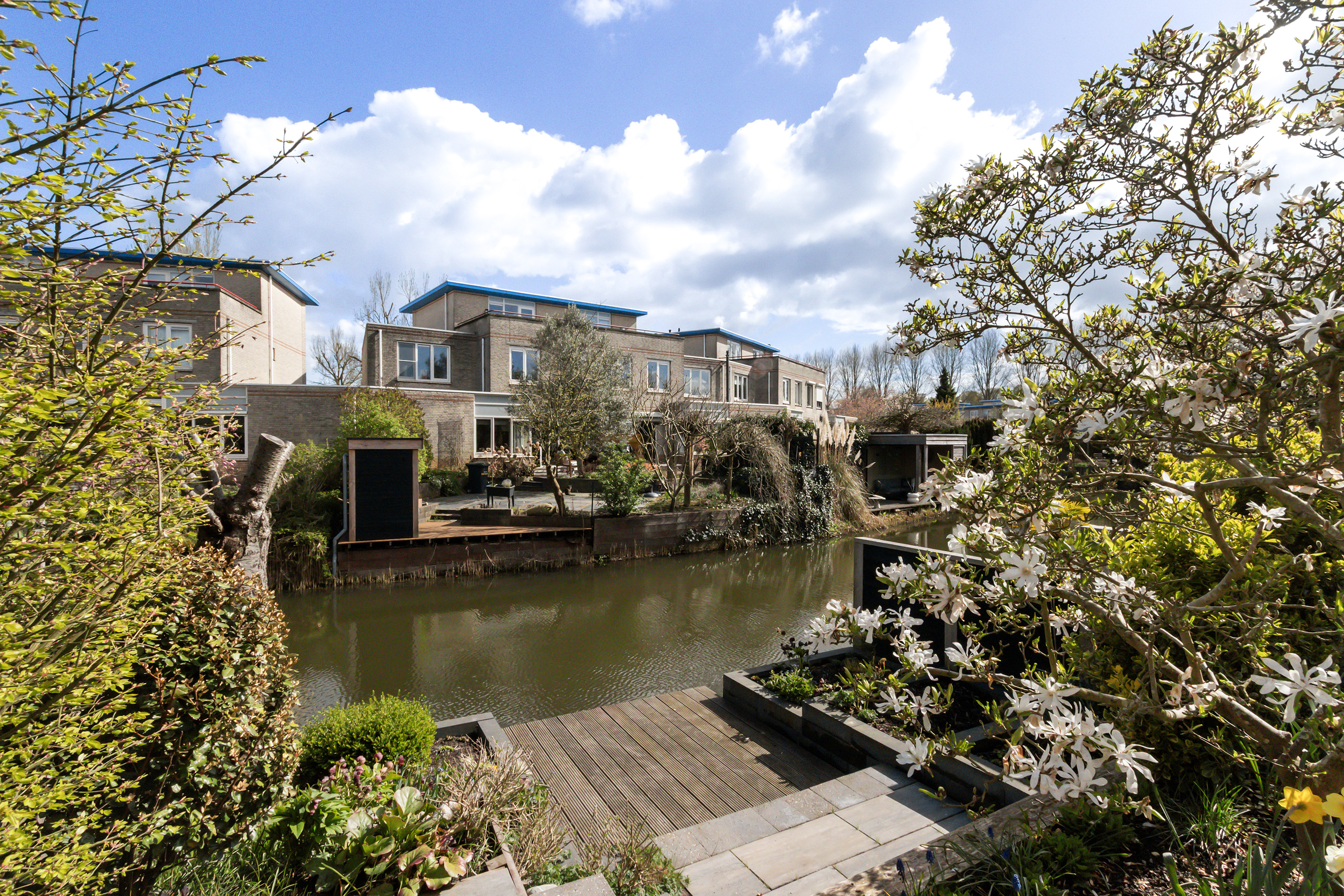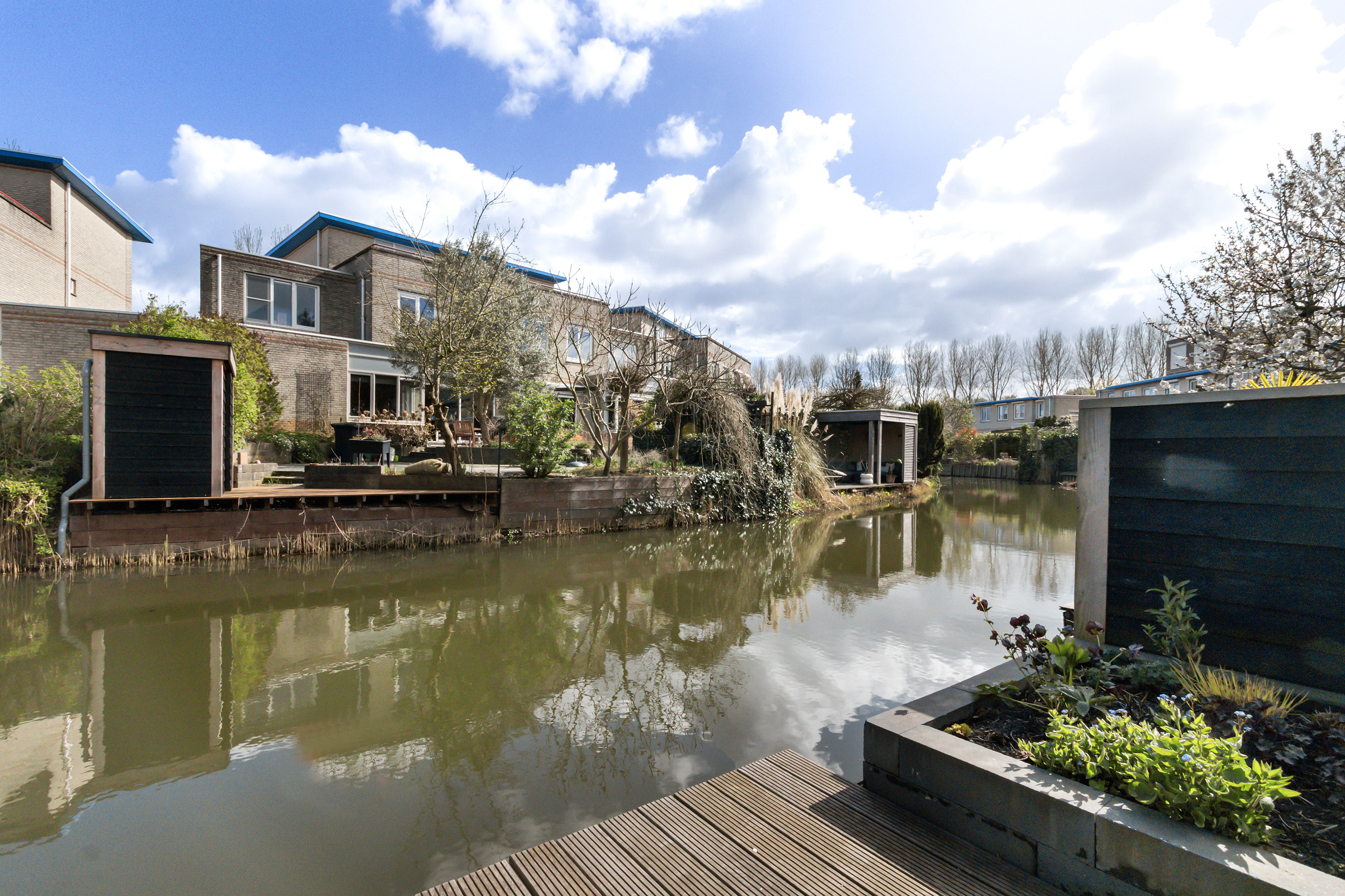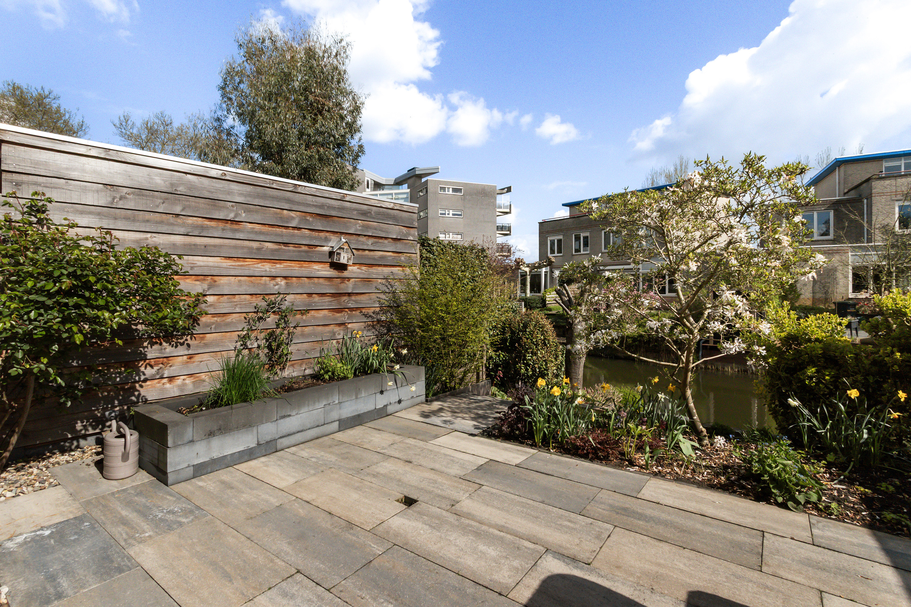 - Achtertuin: zeer strak en speels aangelegd mede dankzij het niveauverschil. De tuin is gesitueerd op het zuidoosten en voorzien van sierbestrating, opstaande borders met beplanting en een houten vlonder gelegen aan het water.