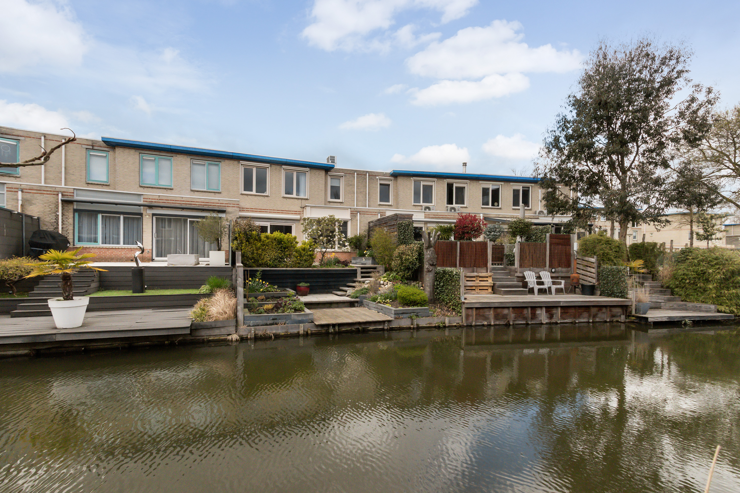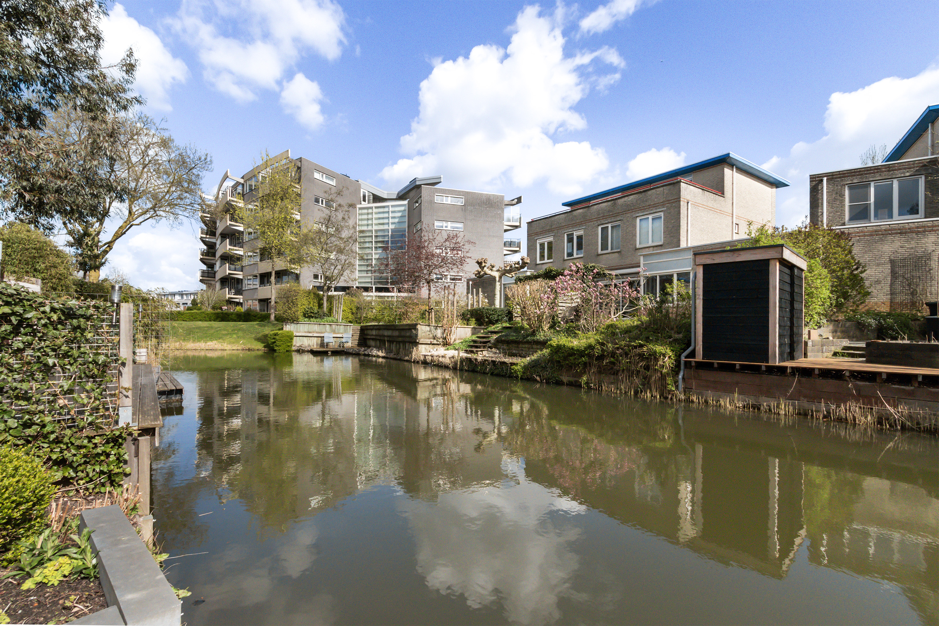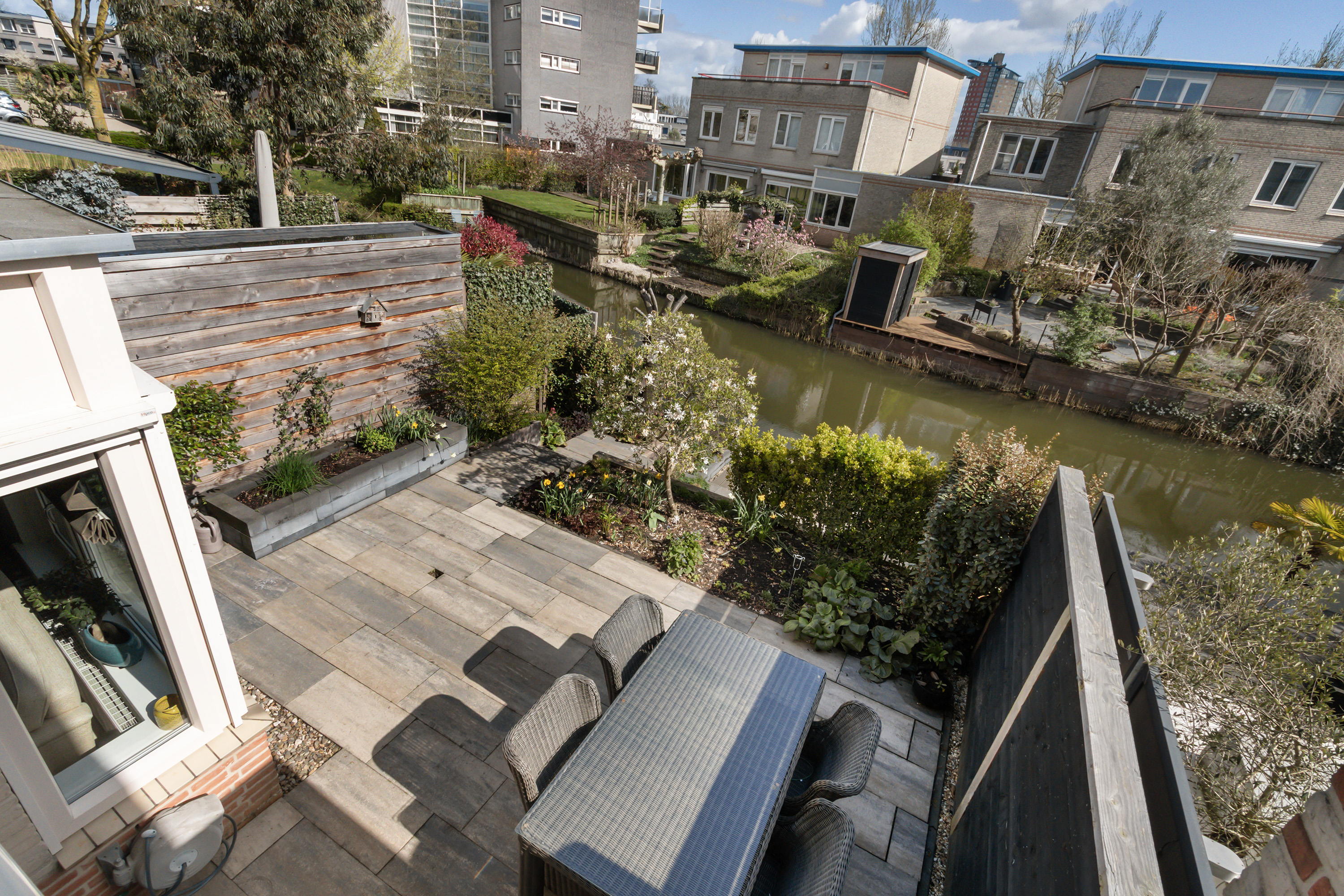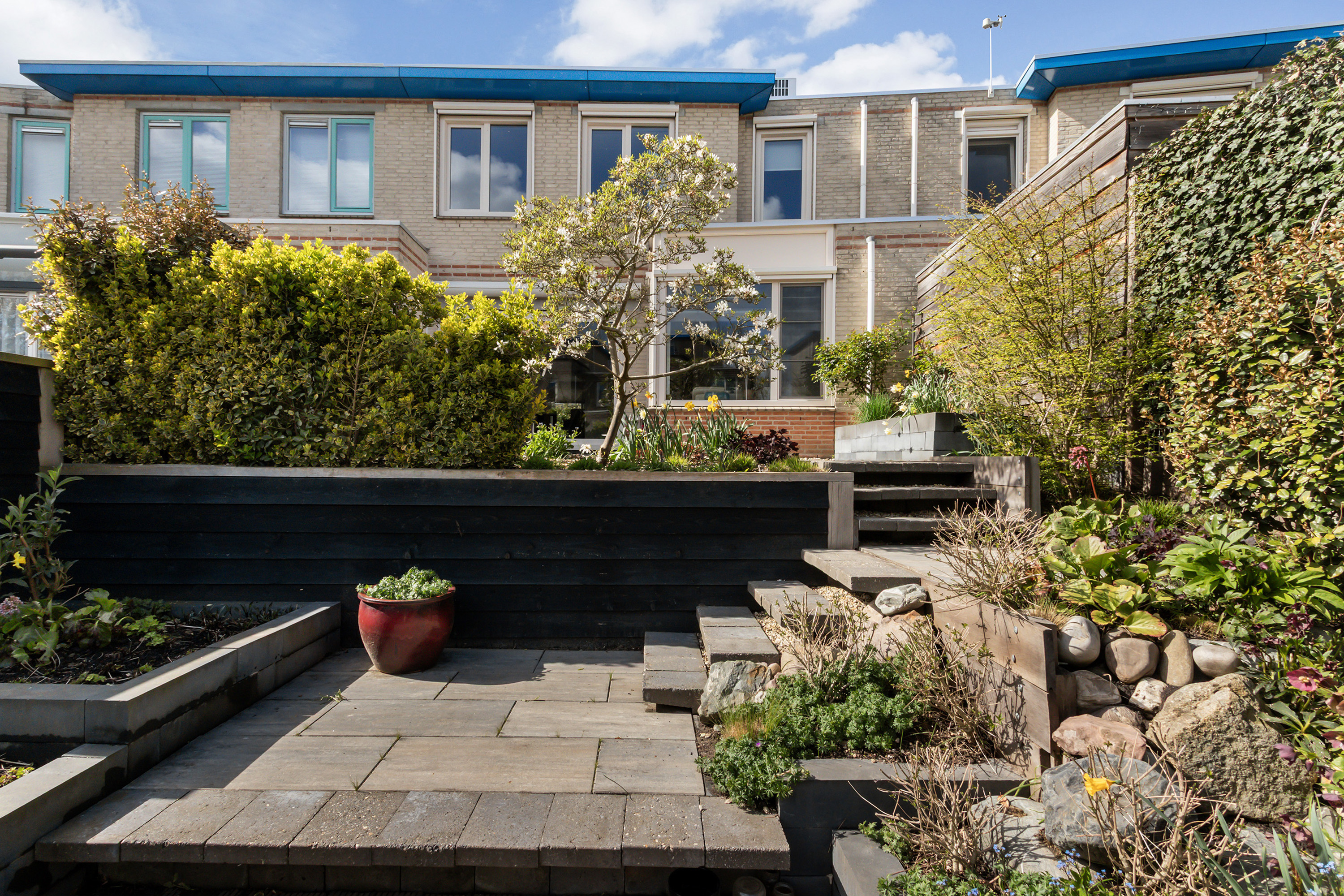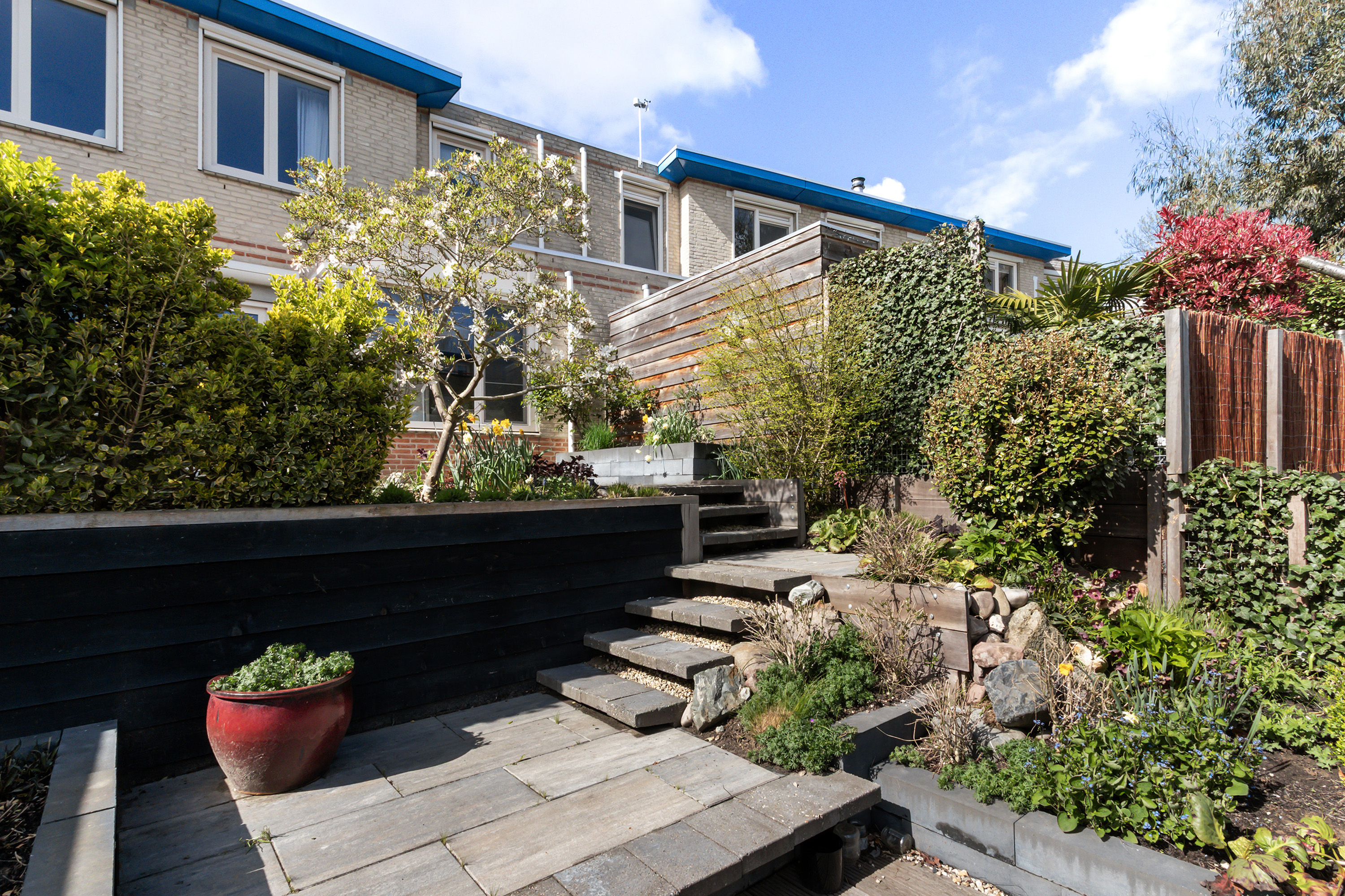 - Achtertuin: zeer strak en speels aangelegd mede dankzij het niveauverschil. De tuin is gesitueerd op het zuidoosten en voorzien van sierbestrating, opstaande borders met beplanting en een houten vlonder gelegen aan het water.
