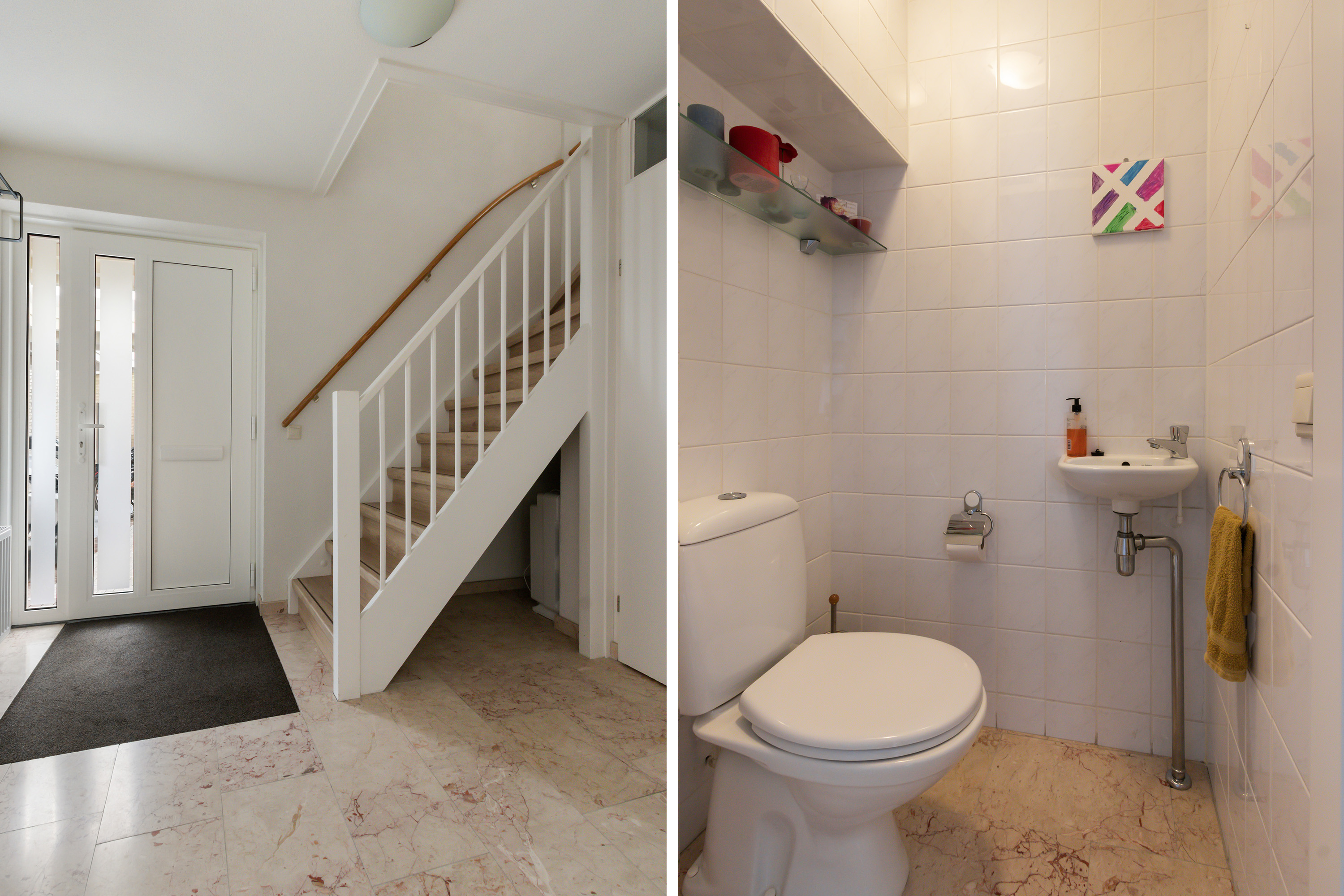 - Entree, hal, toilet, meterkast, trap naar de 1e verdieping en toegang tot de woonkamer;