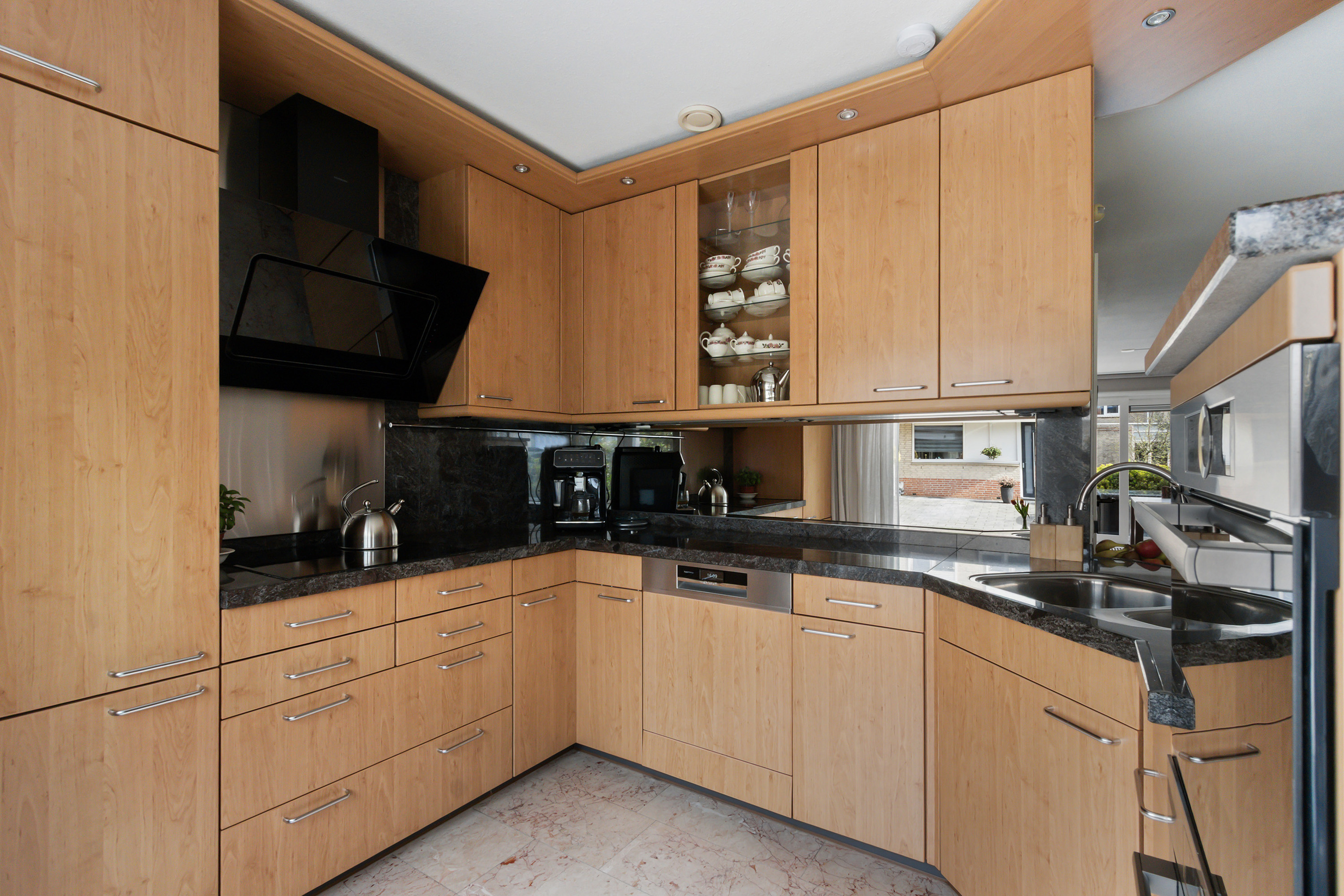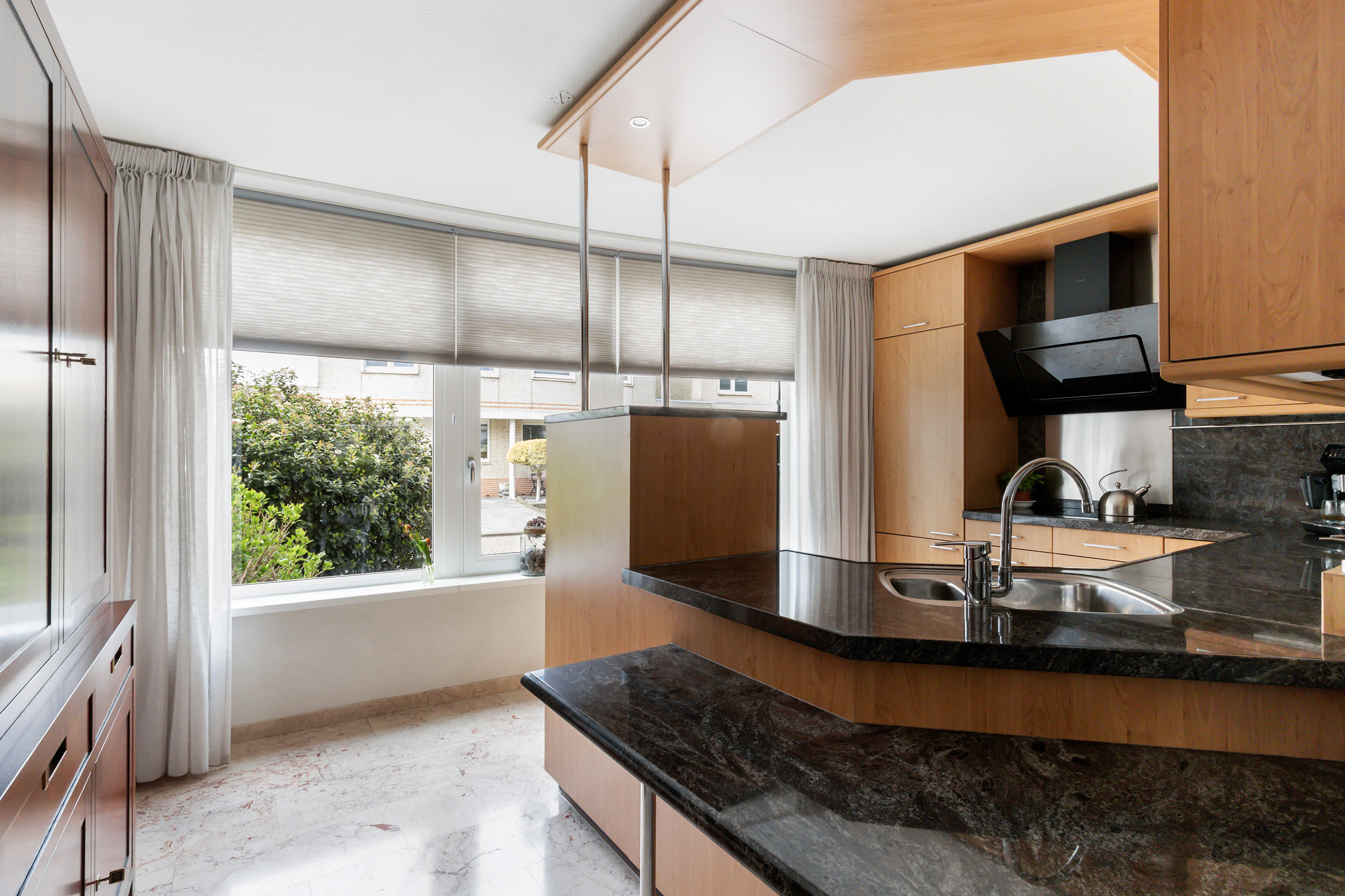 - Open keuken, gelegen aan de voorzijde van de woning, uitgevoerd in een hoekopstelling met een granieten aanrechtblad, diverse onder- en bovenkasten en laden en een 1,5 rvs spoelbak. Apparatuur: 4-pits inductiekookplaat, zwarte afzuigkap, vaatwasser, koel-/vriescombinatie, een oven en een stoomoven.