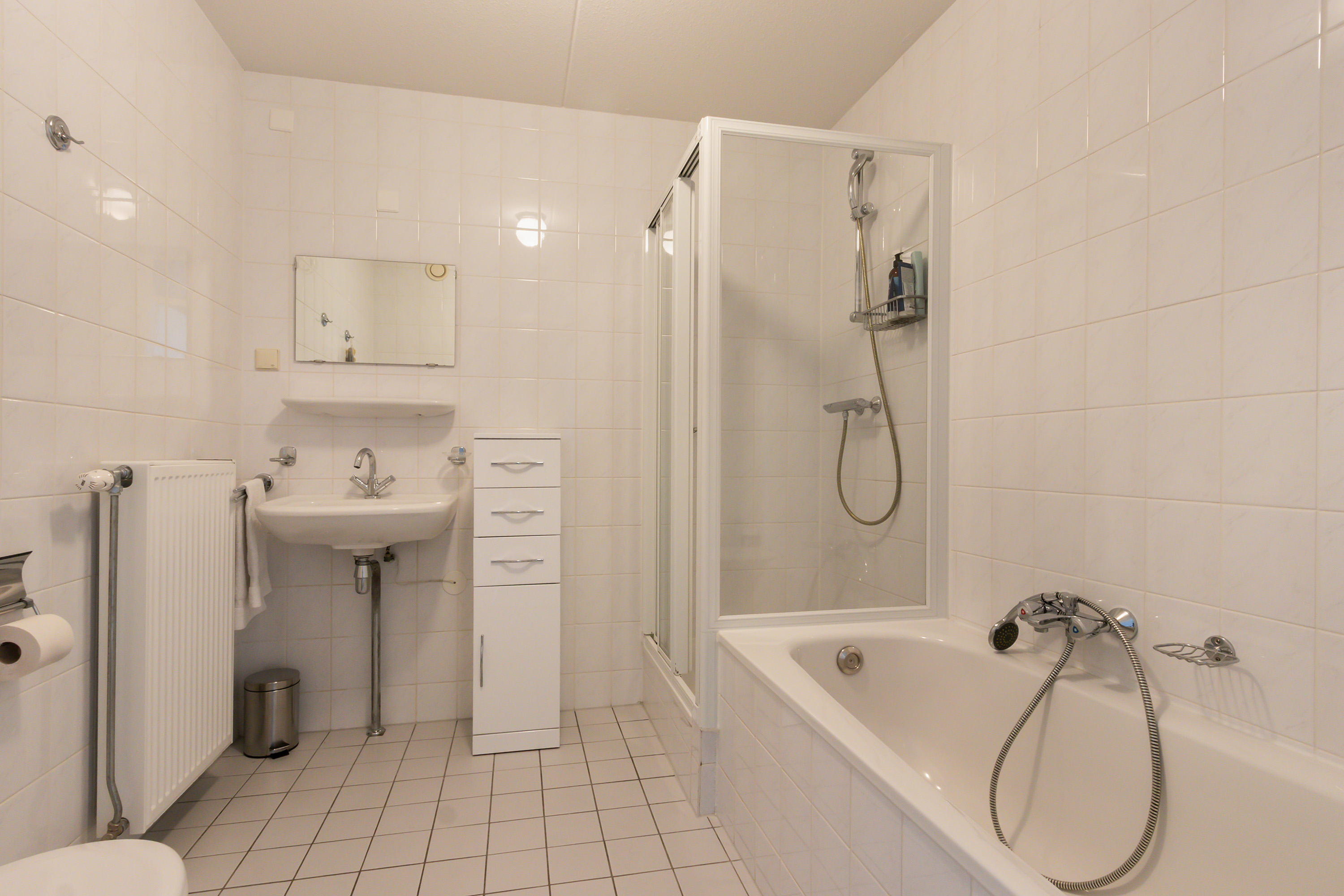- Badkamer, met geheel betegelde wanden en een plavuizen vloer. De badkamer beschikt over een douchecabine, ligbad, toilet en een wastafel.