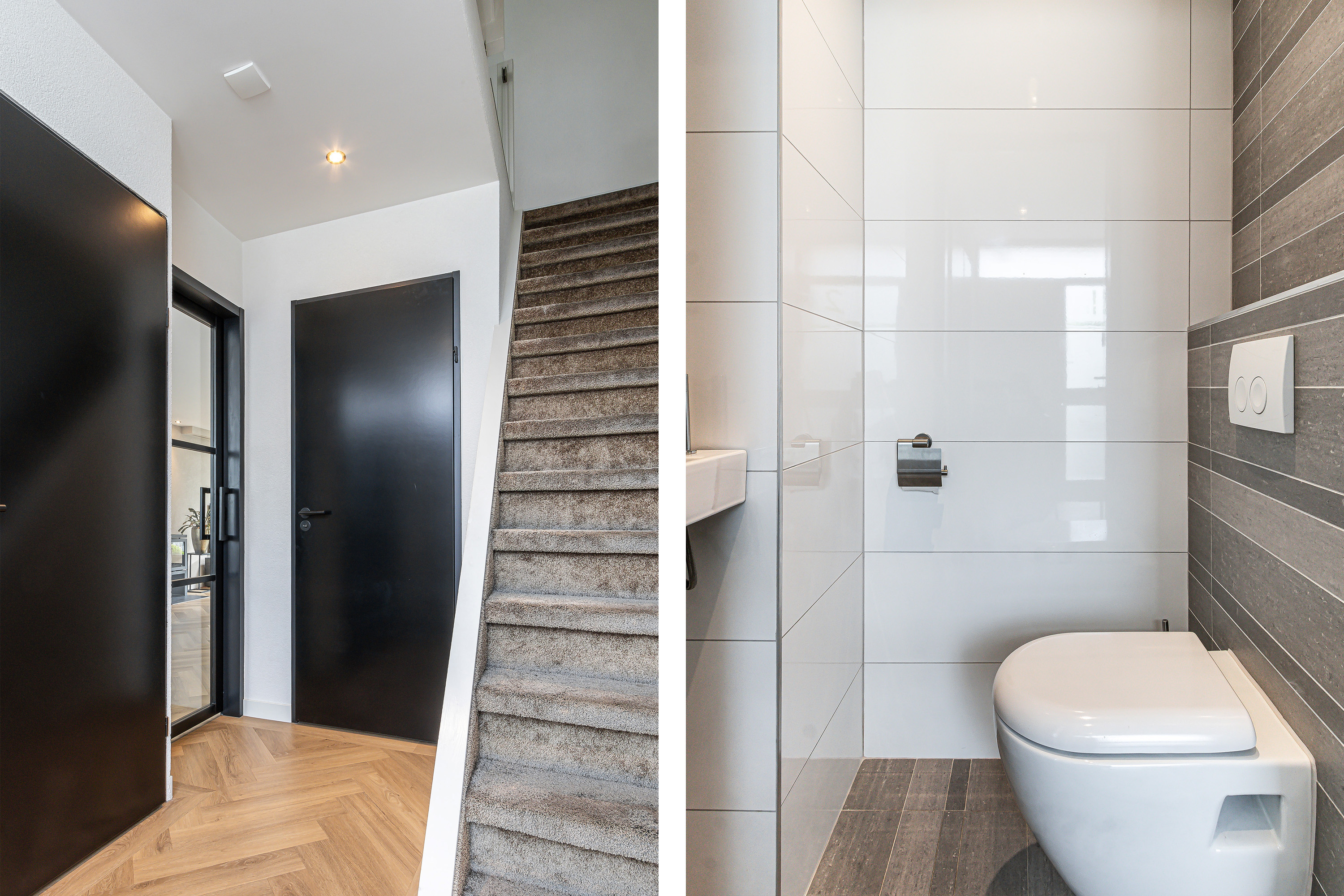 - Entree, hal, trap naar de 1e verdieping, meterkast, praktische schoenen opbergkast, toilet,