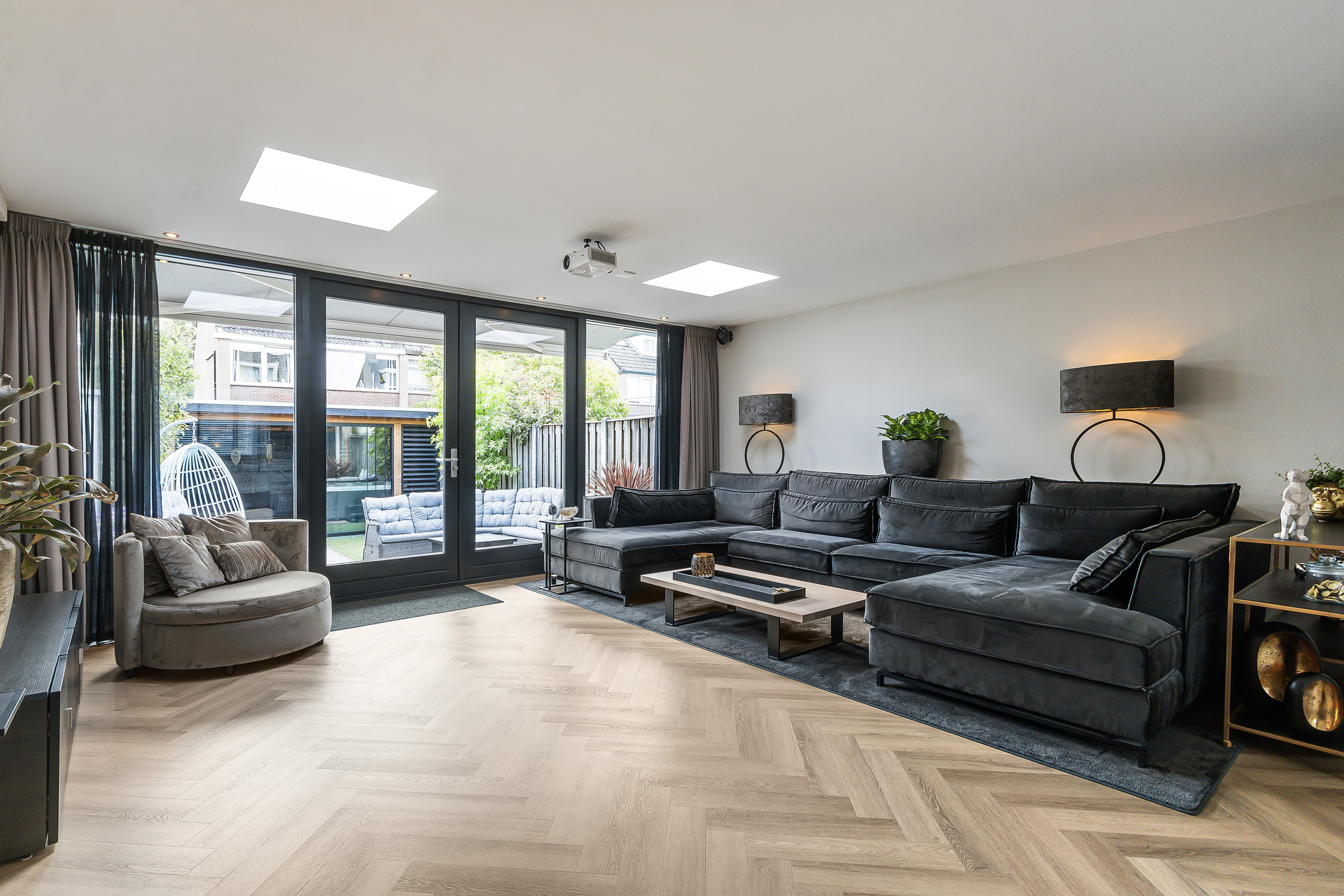 - Tuingerichte woonkamer met zwarte stalen taatsdeur, een aanbouw met 2 lichtkoepels en grote openslaande deuren (1.20 m. breed), een houtkachel en een trapkast. Samen met de open keuken vormt de woonkamer ca. 52 m², een super aangename ruimte waar u gezelligheid vindt, maar ook rust ervaart.
