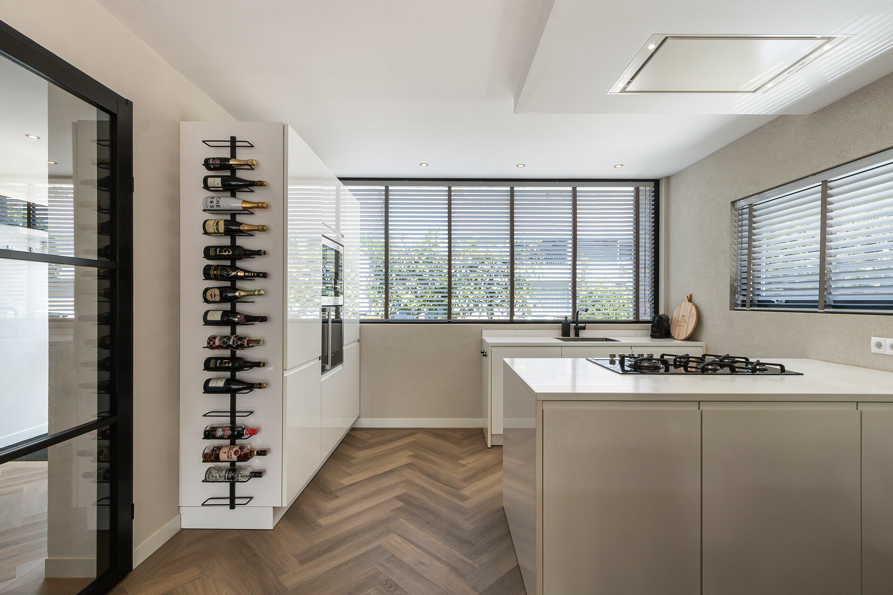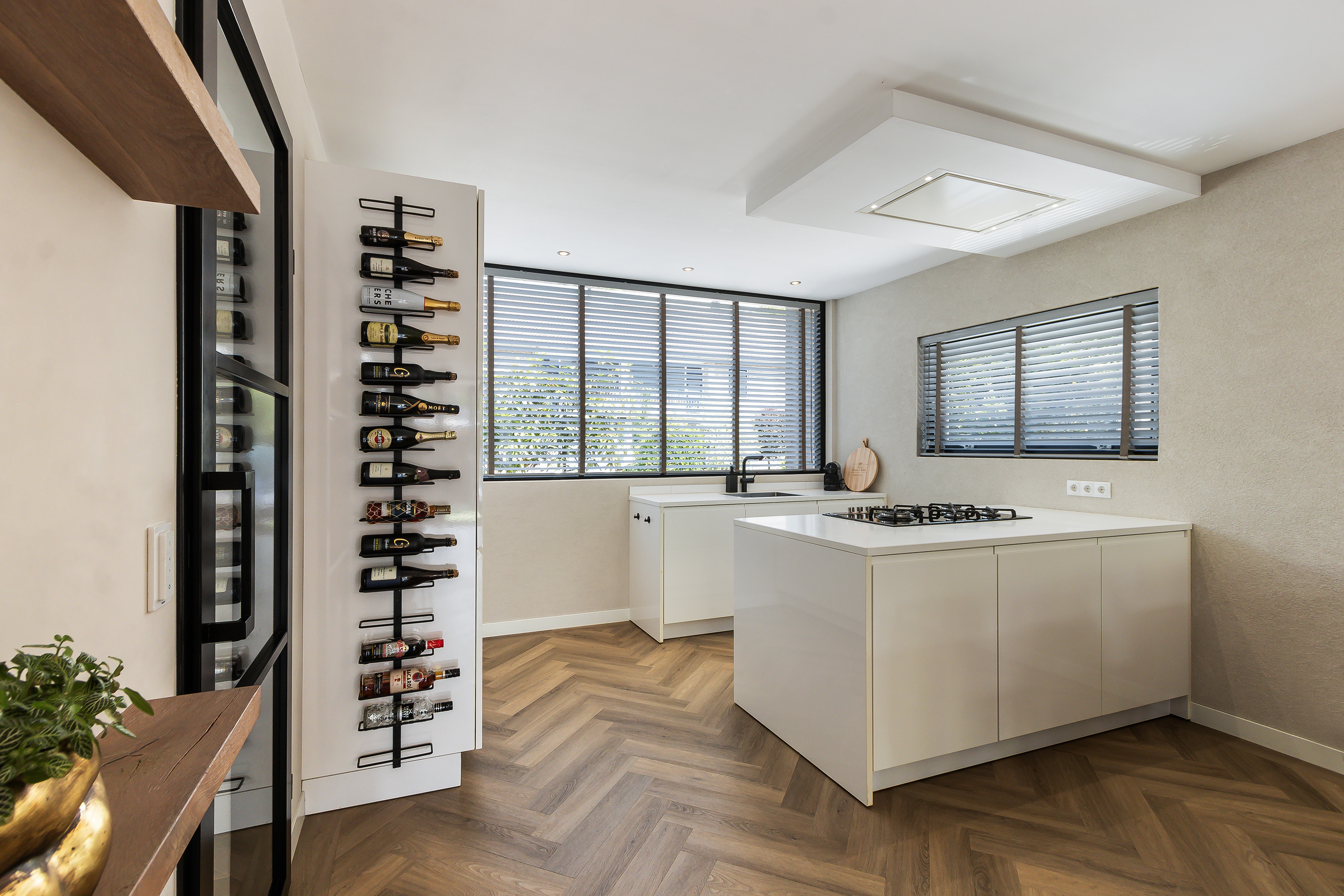 - Open eetkeuken in 3 secties (incl. een kookeiland) in hoogglans witte kleurstelling met een composiet werkblad, een enkele rvs spoelbak, diverse onder en bovenkasten, laden, app.: in plafond geïntegreerde afzuigunit, een 5-pits gaskookplaat incl. wok brander, een vaatwasser (2025), een koel-/ vriescombinatie, een combimagnetron en een hete lucht oven;