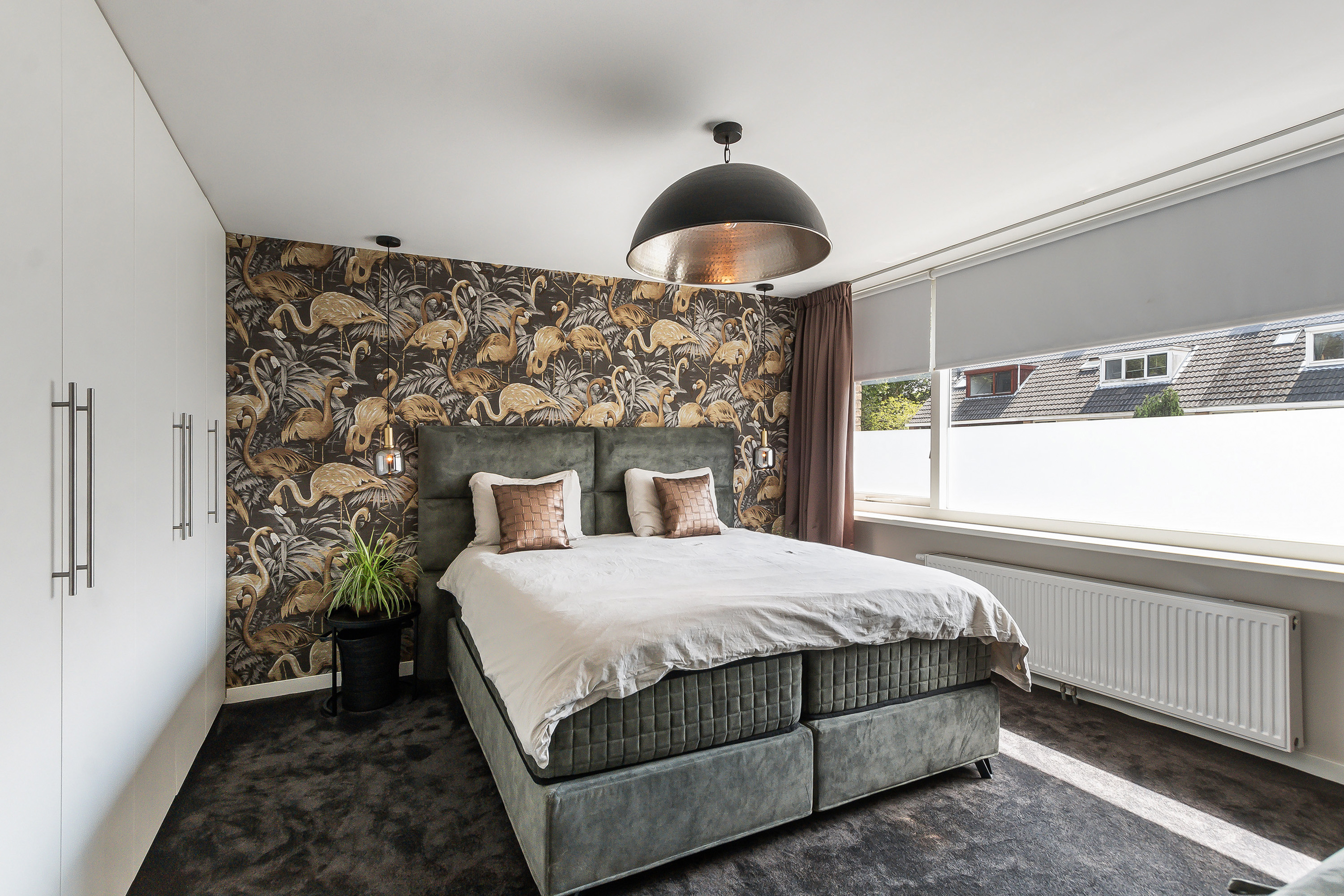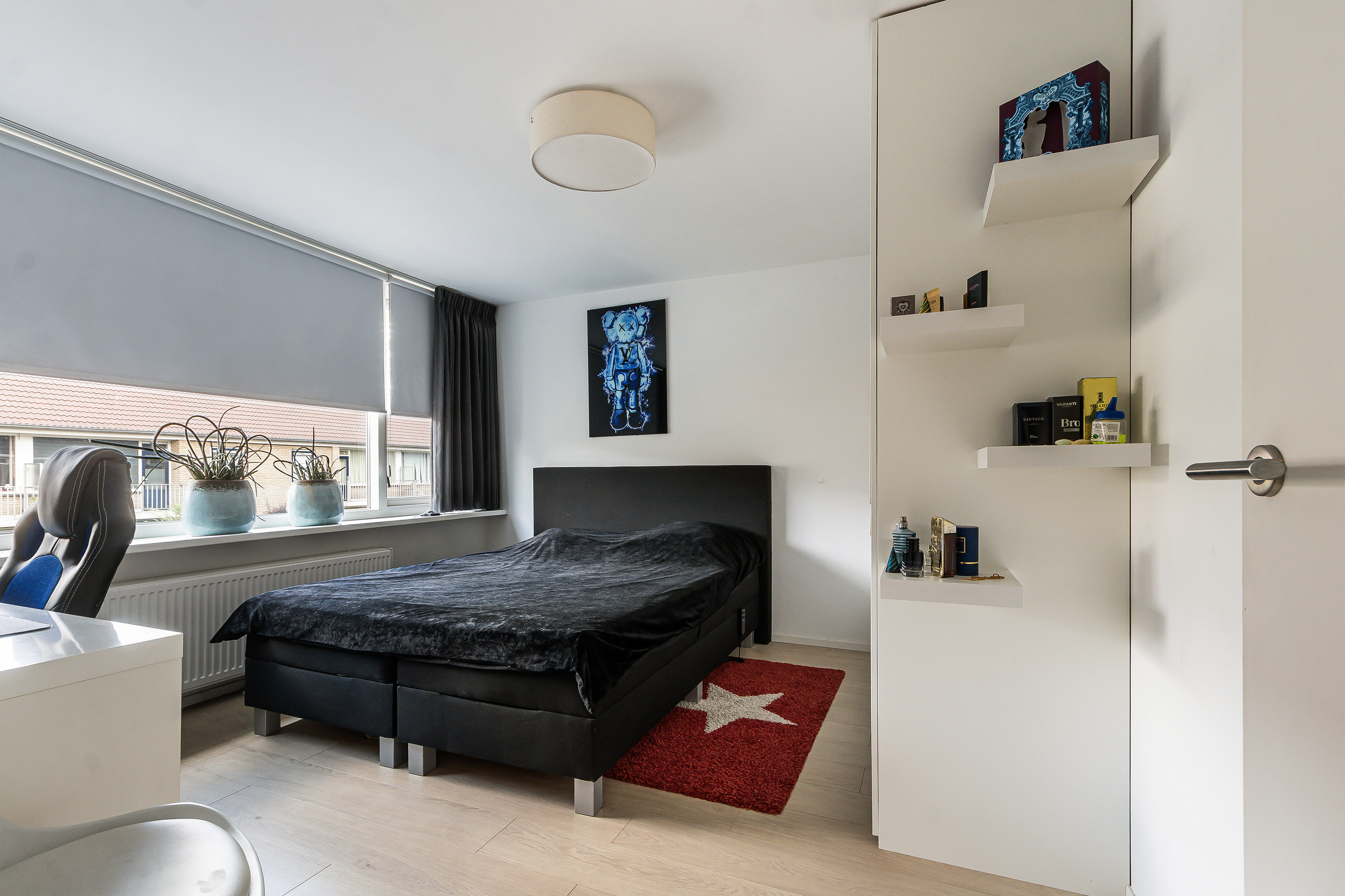 - Slaapkamer 1, gelegen aan de achterzijde (ca. 17 m²) met een vaste kastenwand en een moderne badkamer-en-suite (2022);