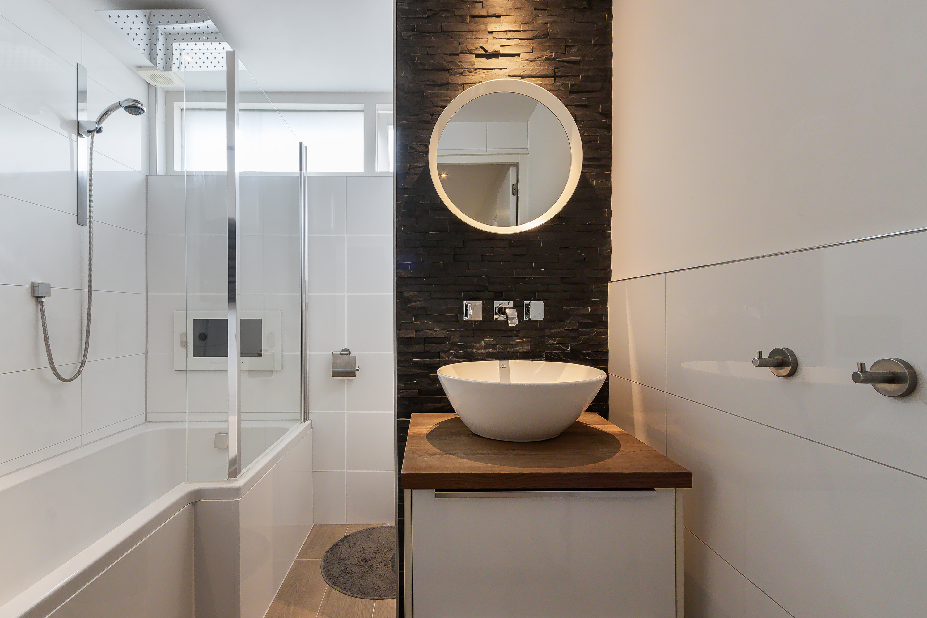 - Badkamer, gelegen aan de voorzijde met geheel betegelde wanden, een tegelvloer (op een betonvloer), wit sanitair, een wastafelmeubel, een ligbad, een hangtoilet en een designradiator.