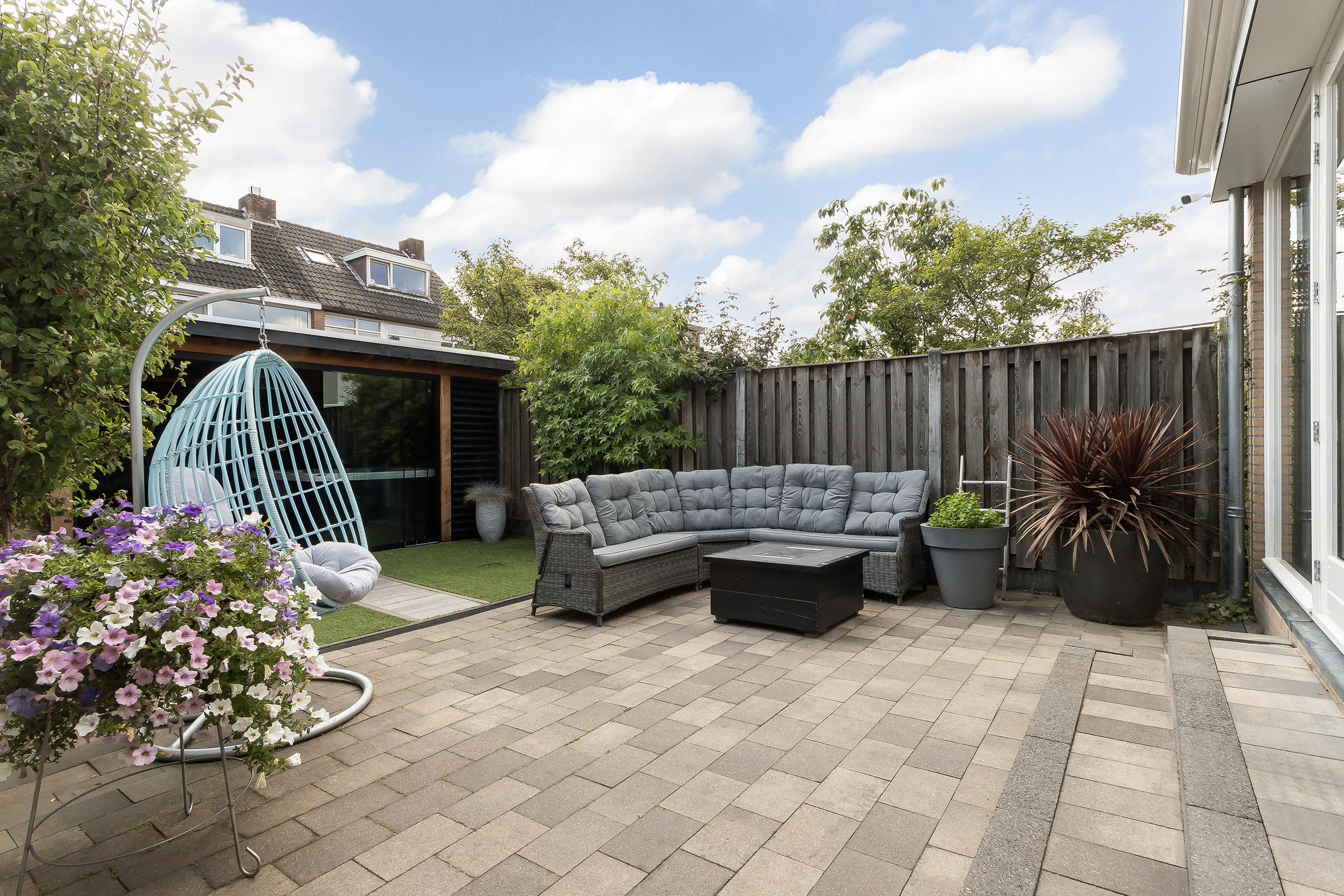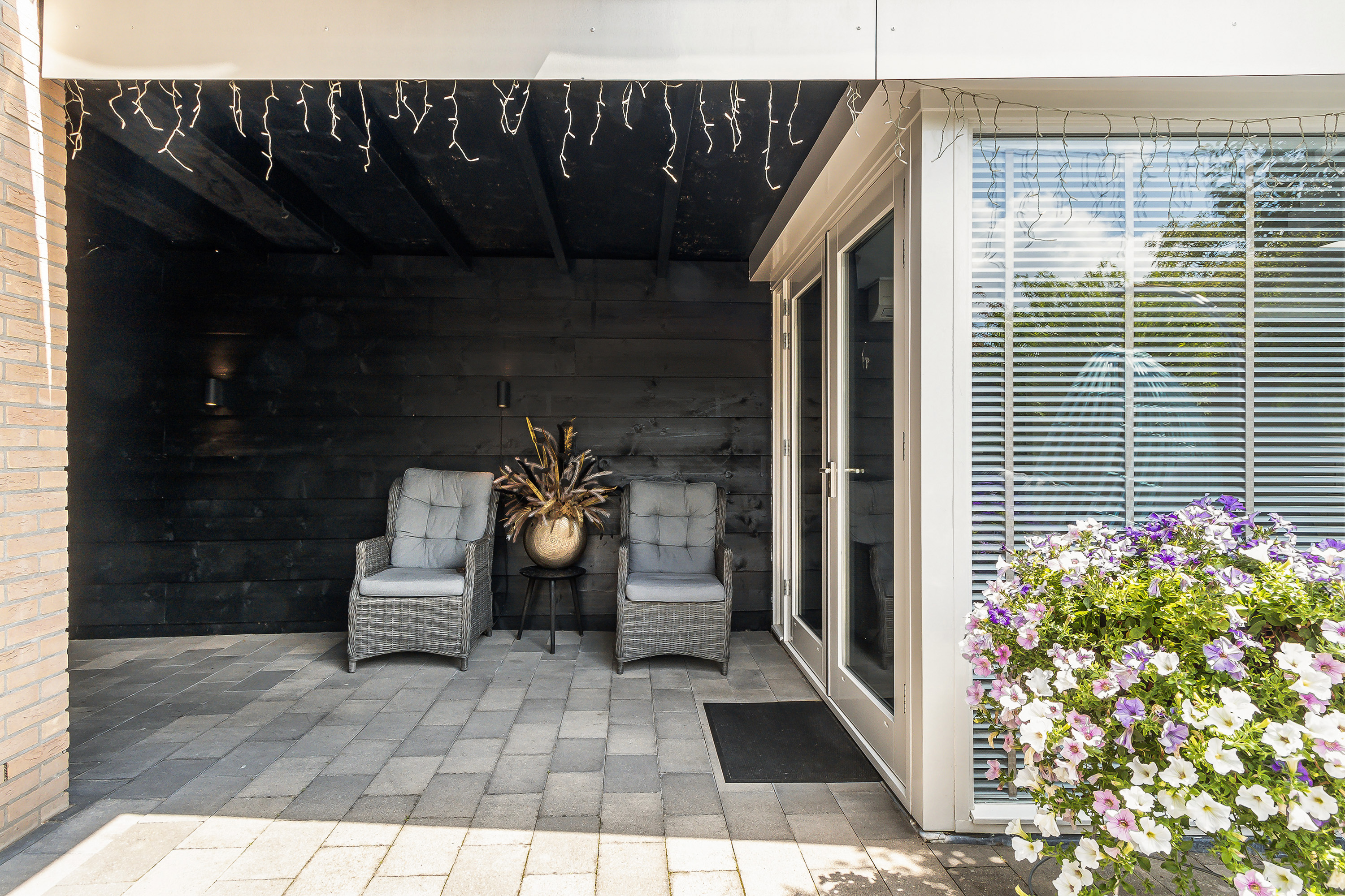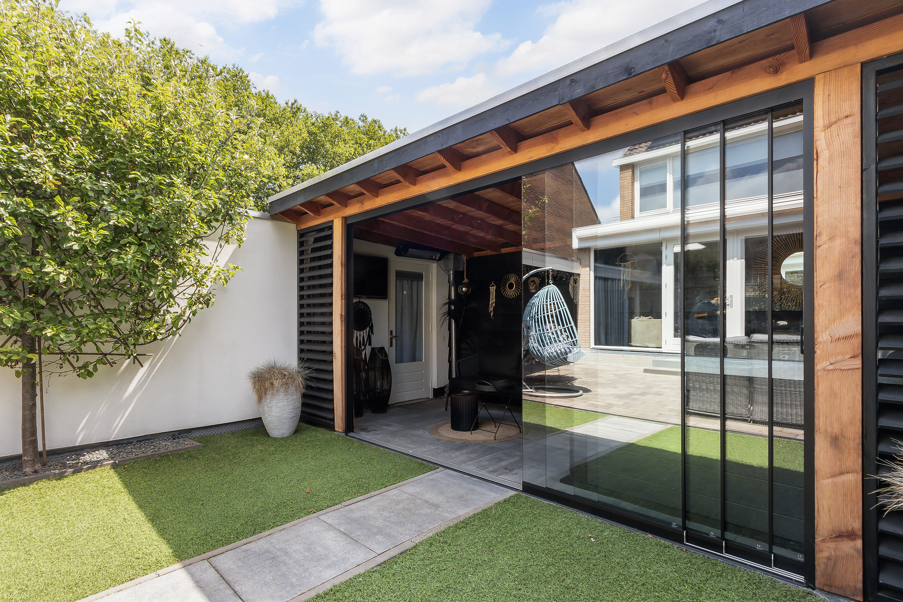 - Achtertuin: gesitueerd op het zuiden. Omheind met achterom. Aangelegd met terras met sierbestrating en een stukje kunstgras. Overkapping voor de studioruimte en een stoere lounge-overkapping (ca. 13 m²) achterin de tuin met hardglazen schuiflamellen en verstelbare houten shutters, een plavuizen vloer, stroompunten en een heater. Deur naar berging;