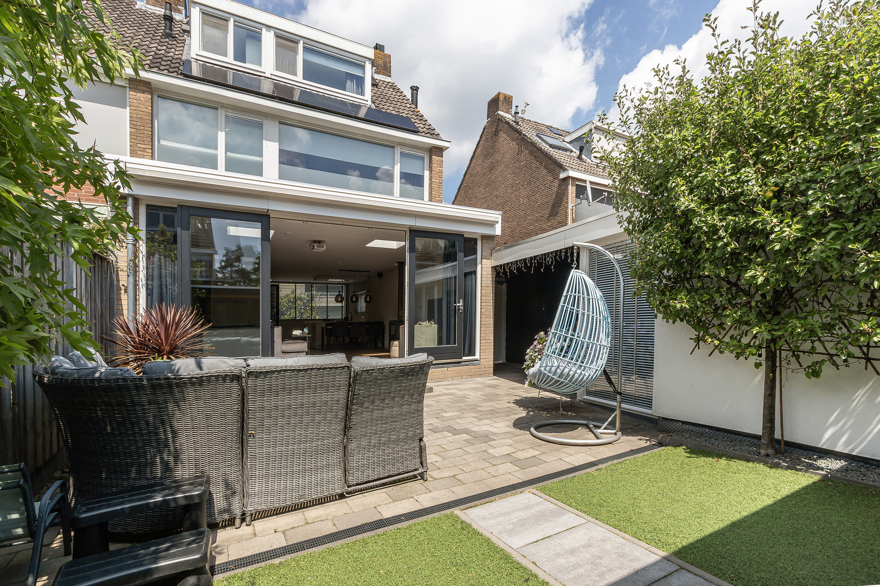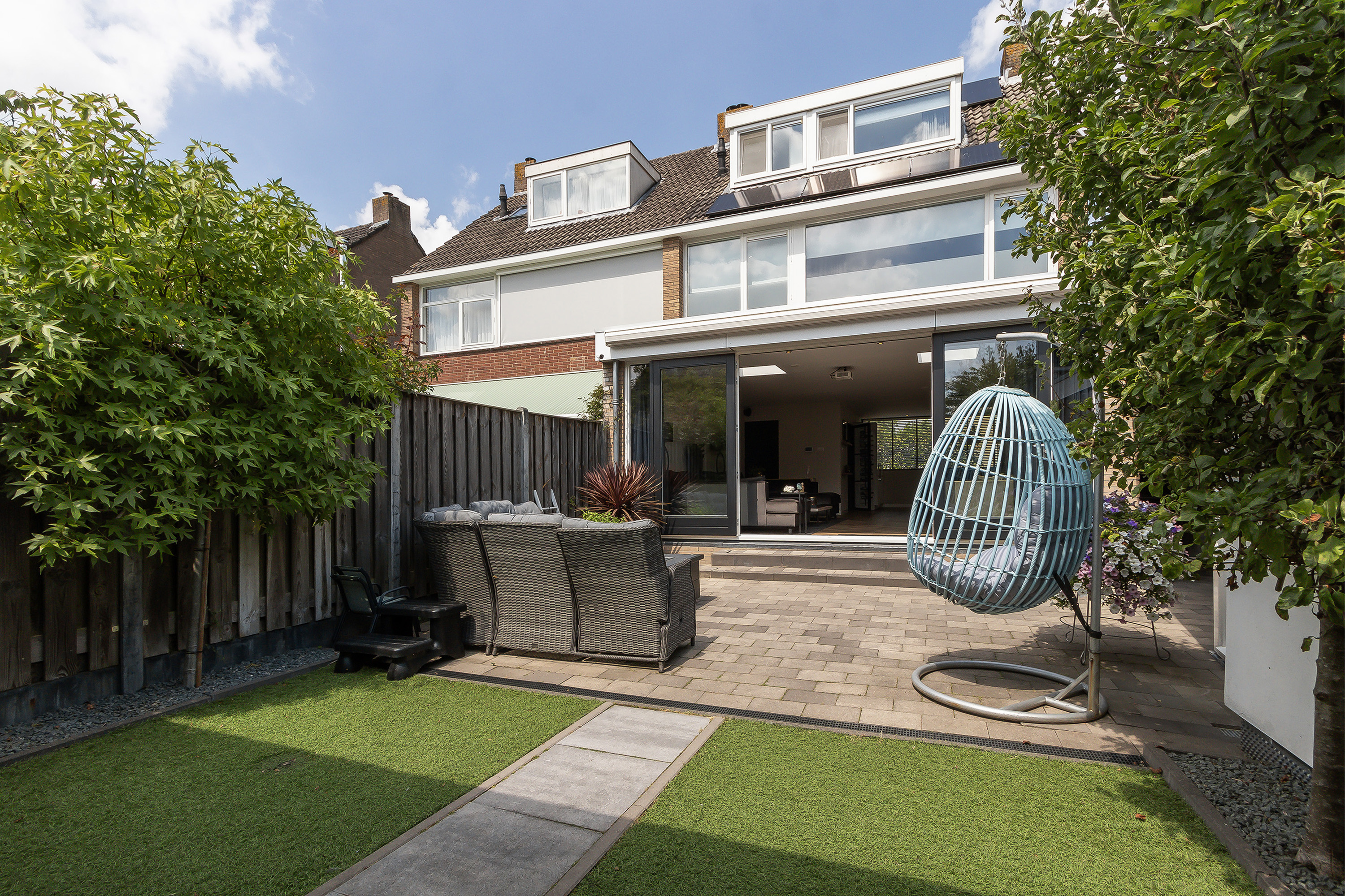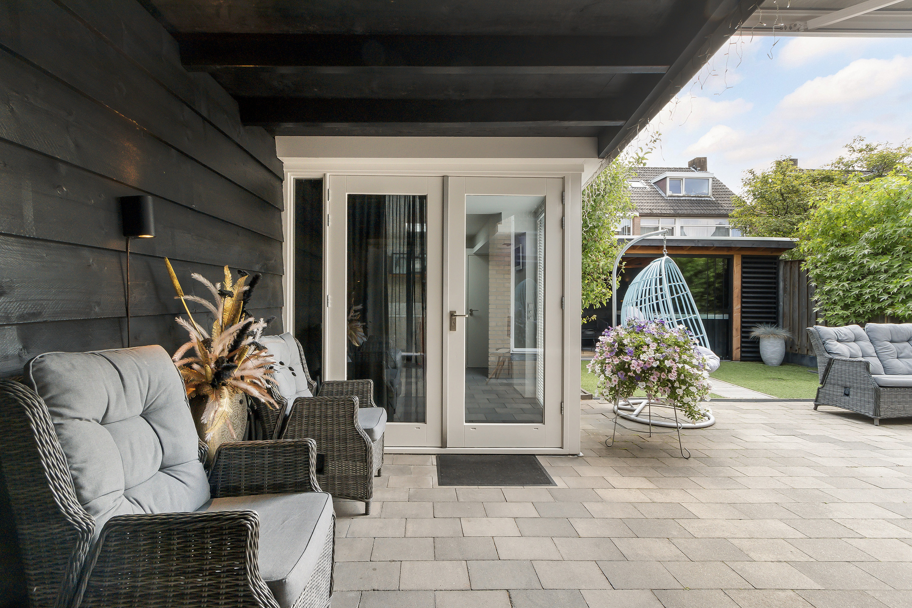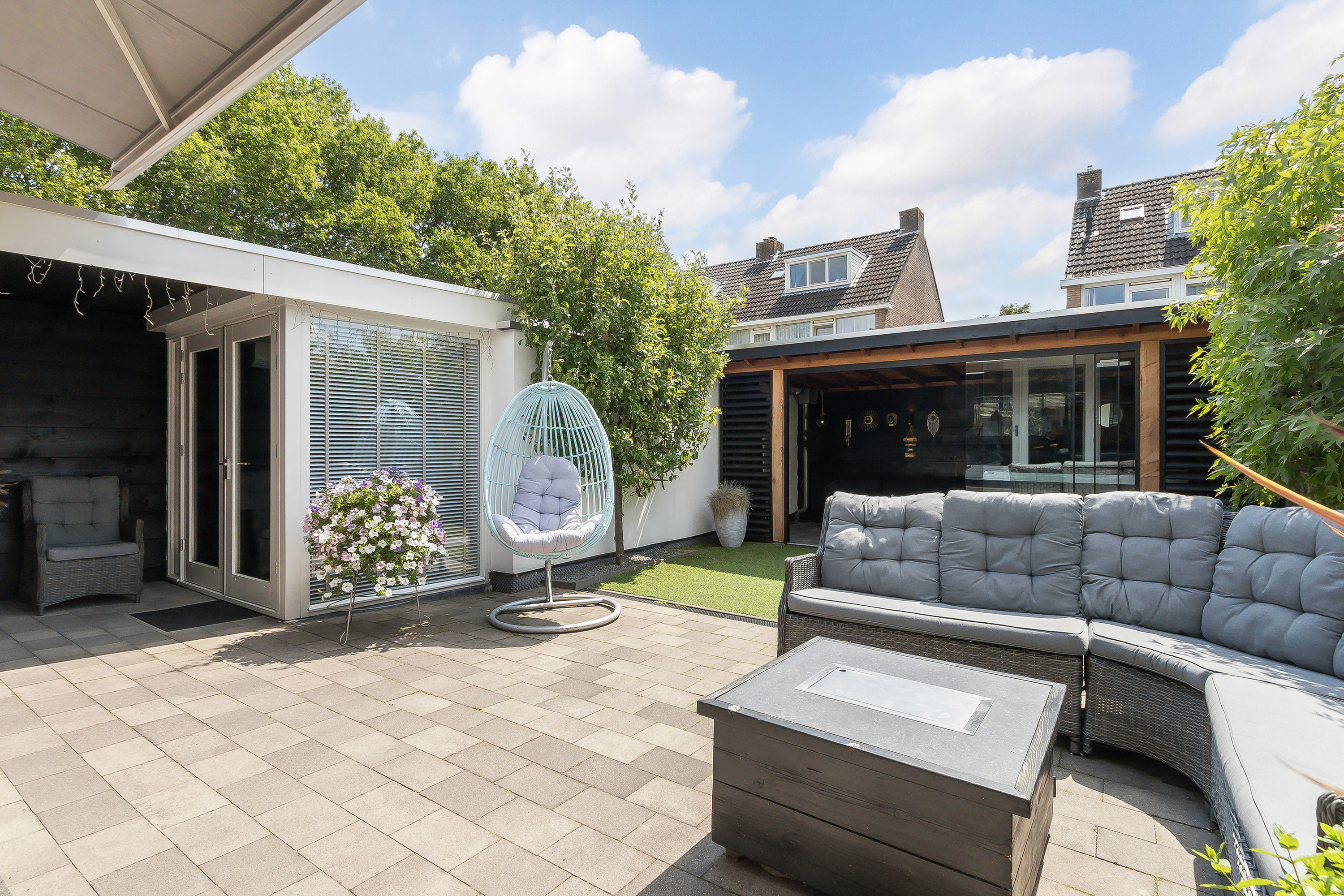 - Achtertuin: gesitueerd op het zuiden. Omheind met achterom. Aangelegd met terras met sierbestrating en een stukje kunstgras. Overkapping voor de studioruimte en een stoere lounge-overkapping (ca. 13 m²) achterin de tuin met hardglazen schuiflamellen en verstelbare houten shutters, een plavuizen vloer, stroompunten en een heater. Deur naar berging;