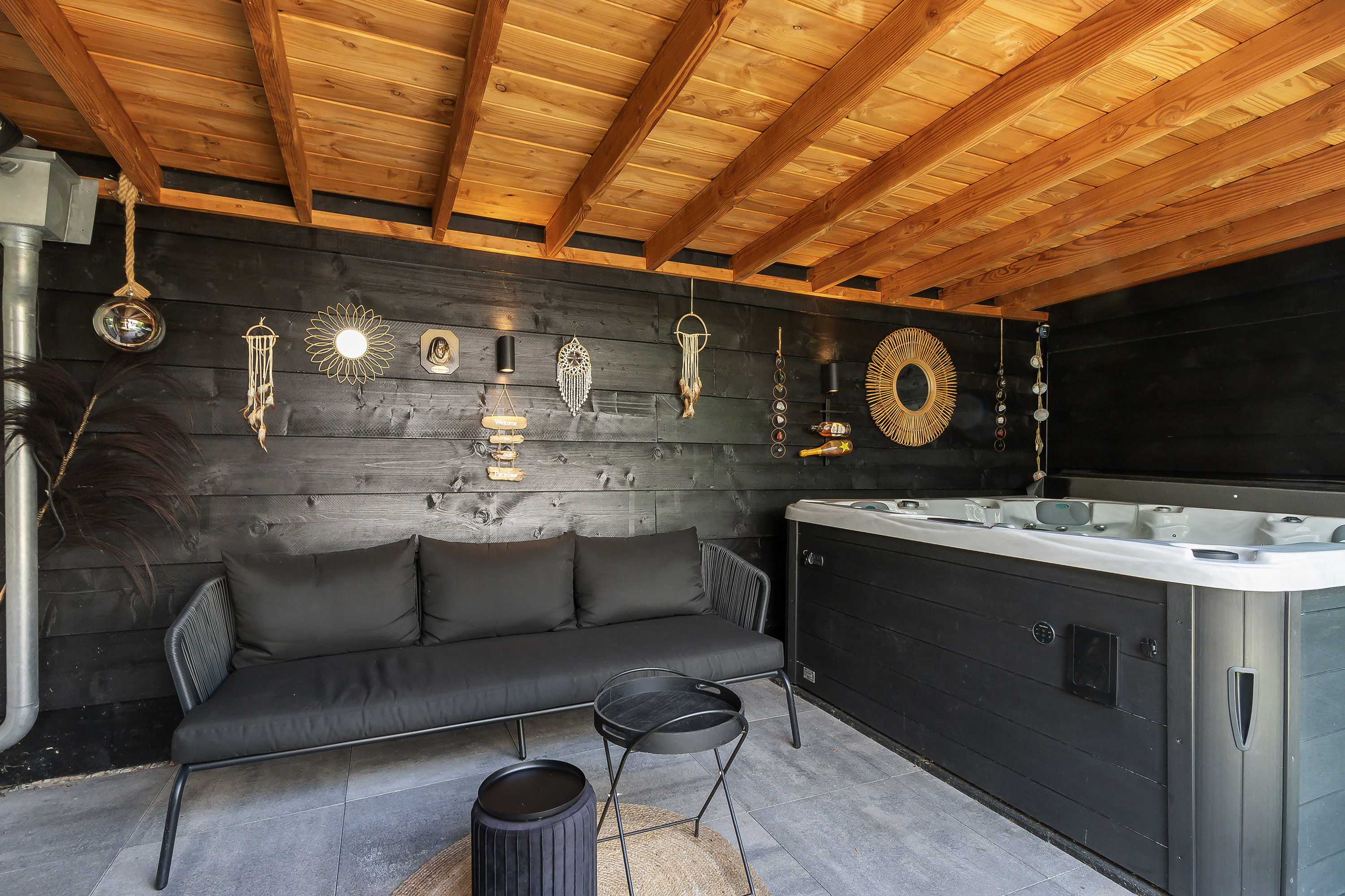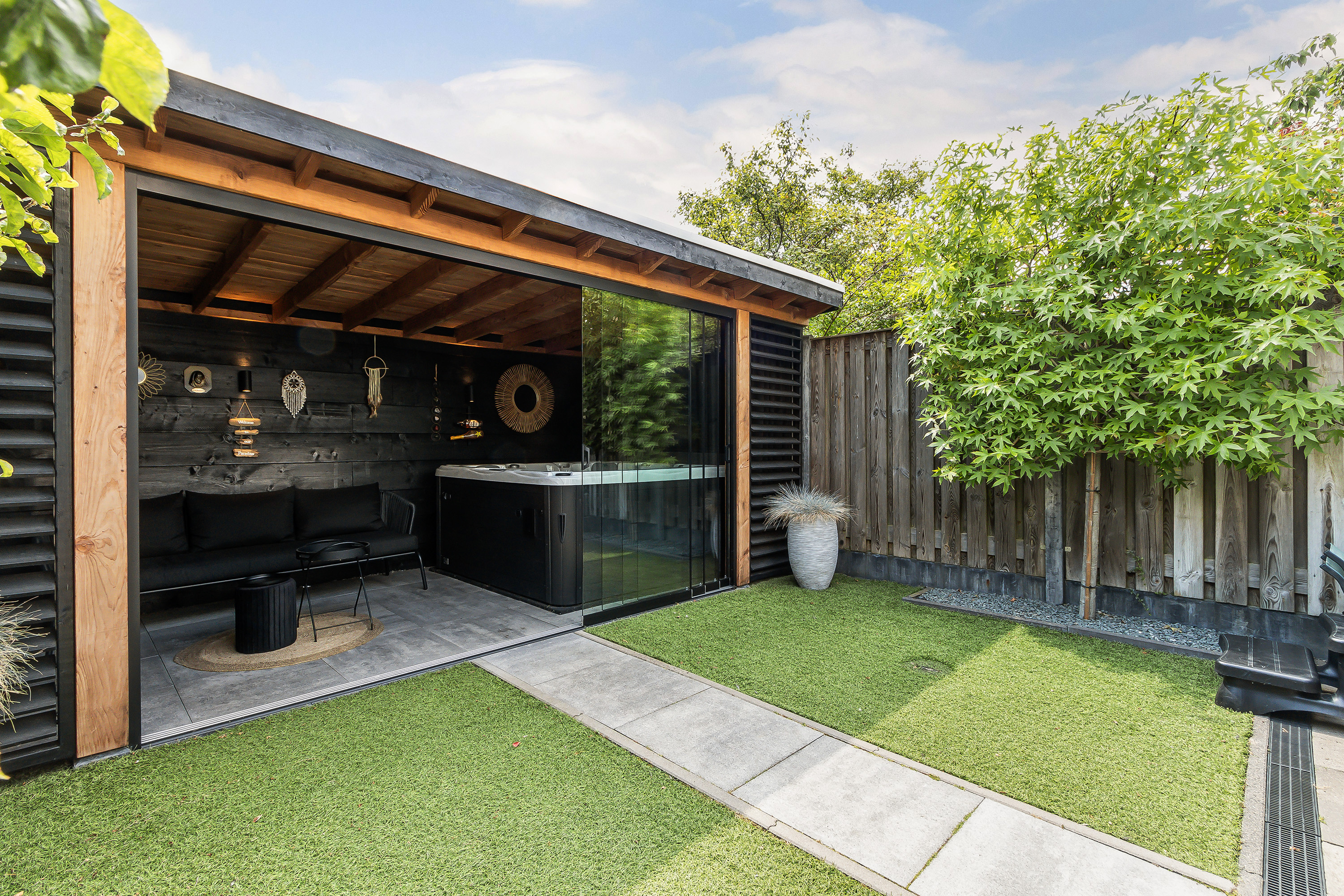 - Voor en achtertuin aangelegd met een stoere lounge-overkapping met jacuzzi (ter overname) in de achtertuin.