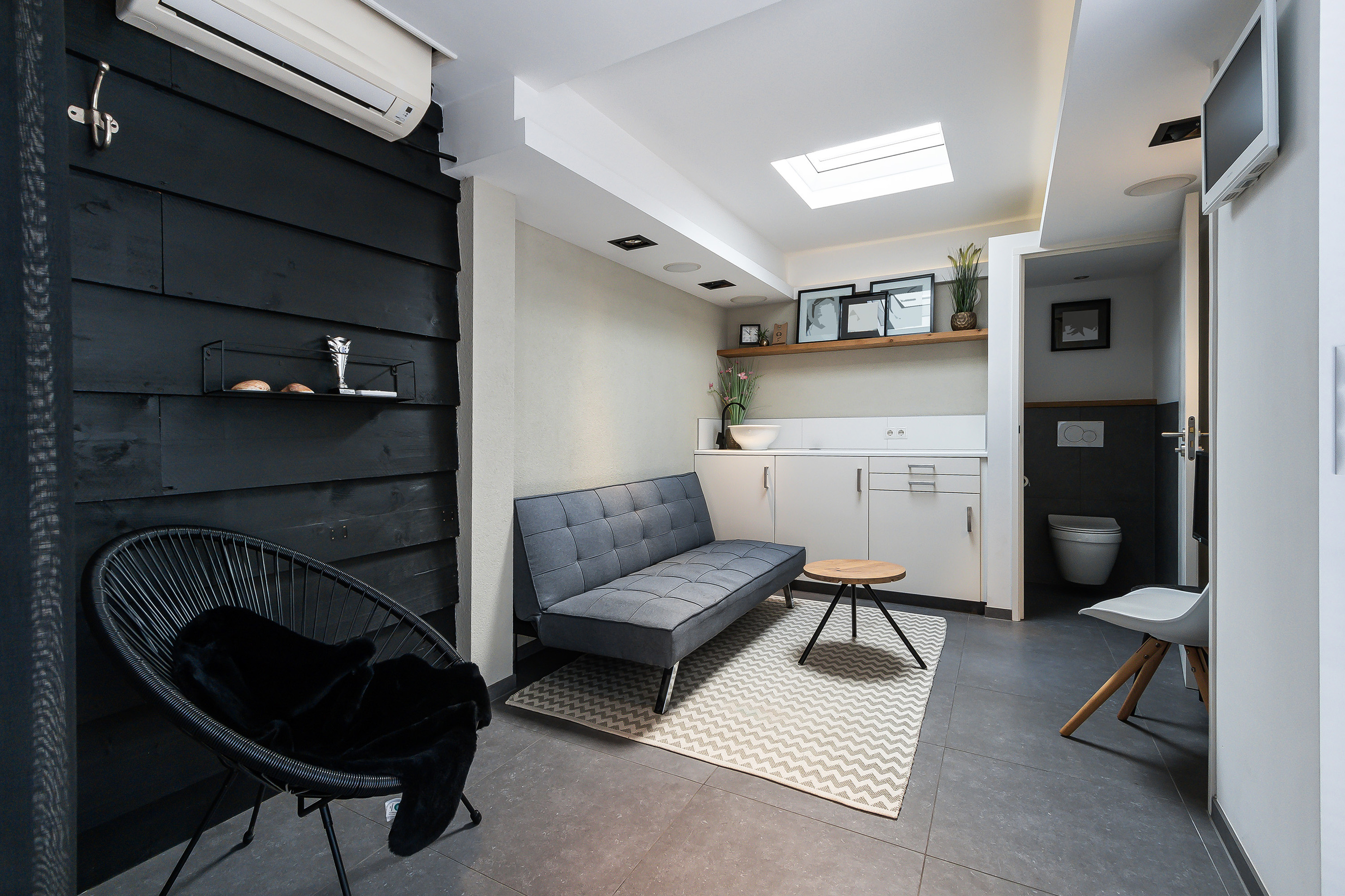 - Multifunctionele studioruimte (ca. 14 m²) met dubbele deuren, een plavuizen vloer, een lichtkoepel, een modern toilet en een modern keukenblok met close-in boiler. Airconditioning. Plafond met inbouwverlichting. Speakersysteem;