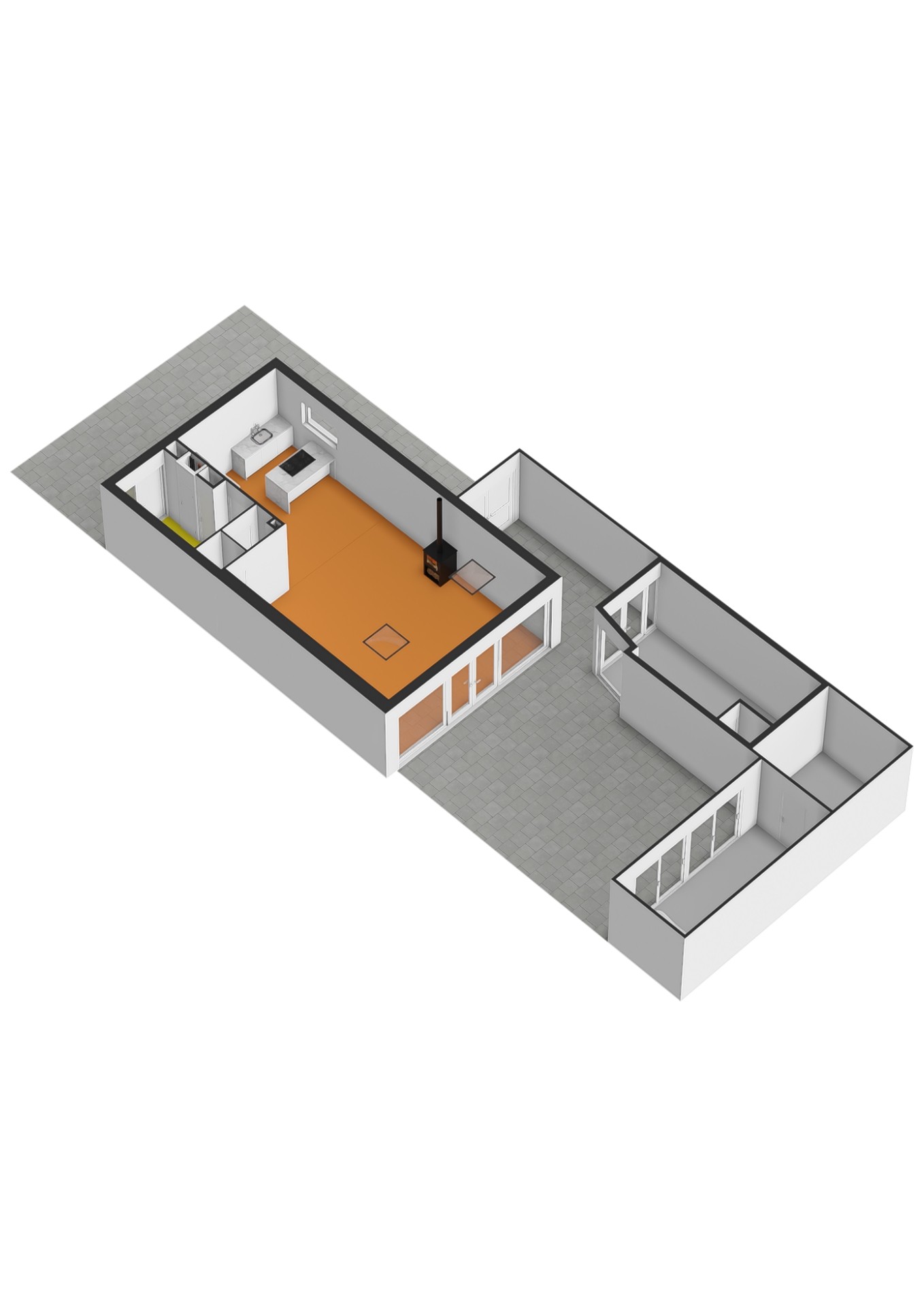 - Voormalige garage omgebouwd tot geïsoleerde multifunctionele studioruimte/ salon met voorzieningen (keukenblok en toilet) en een berging;