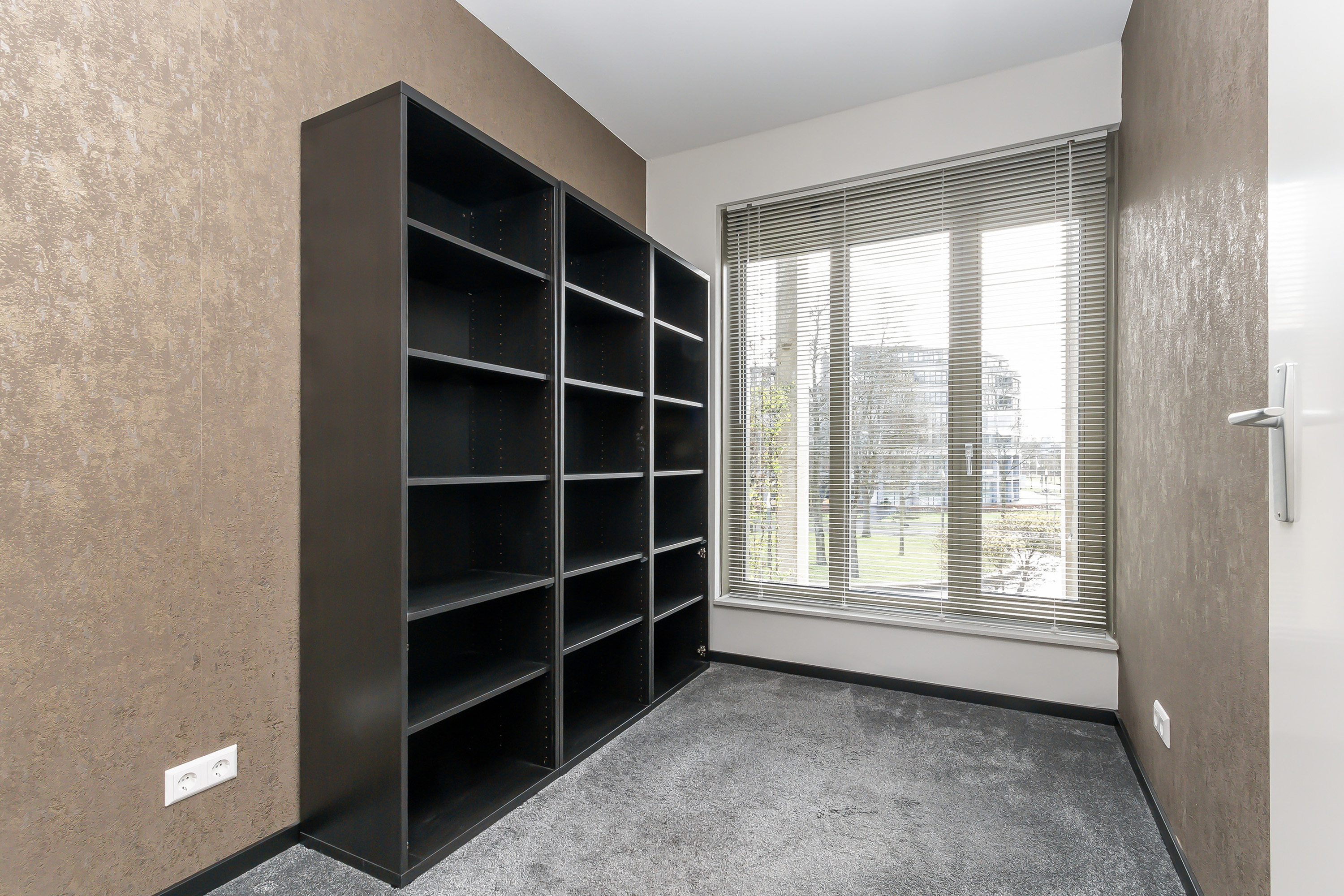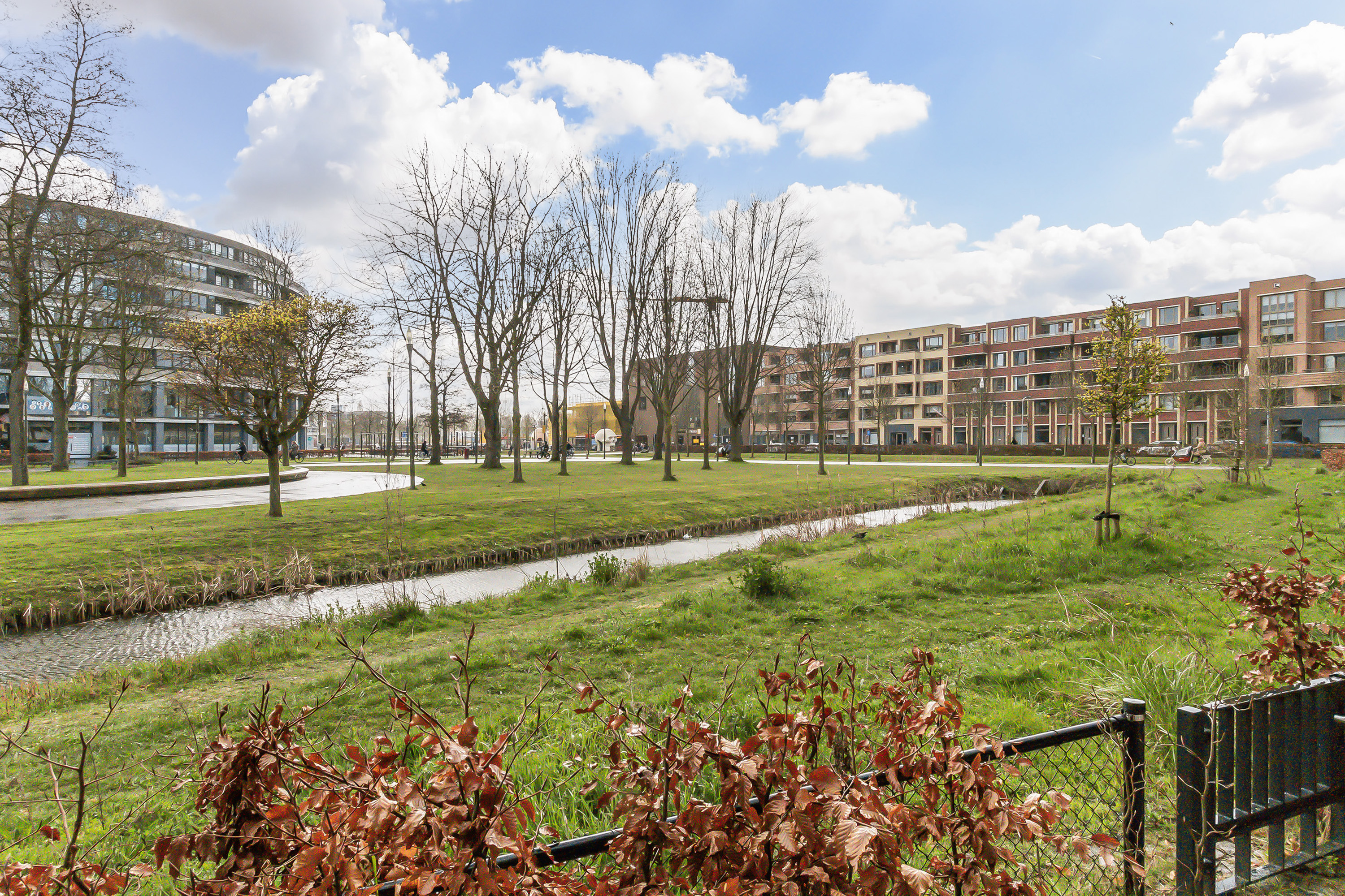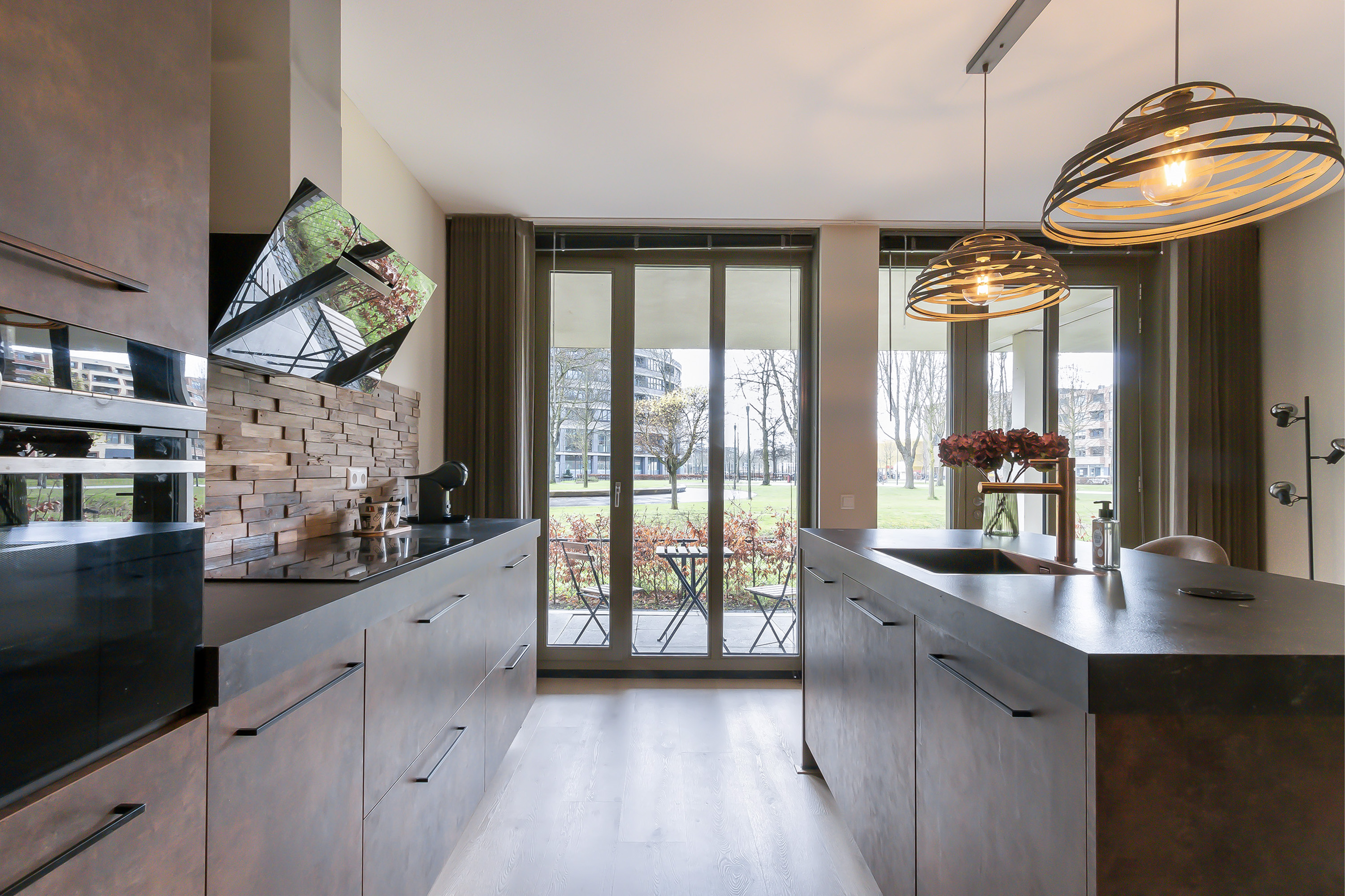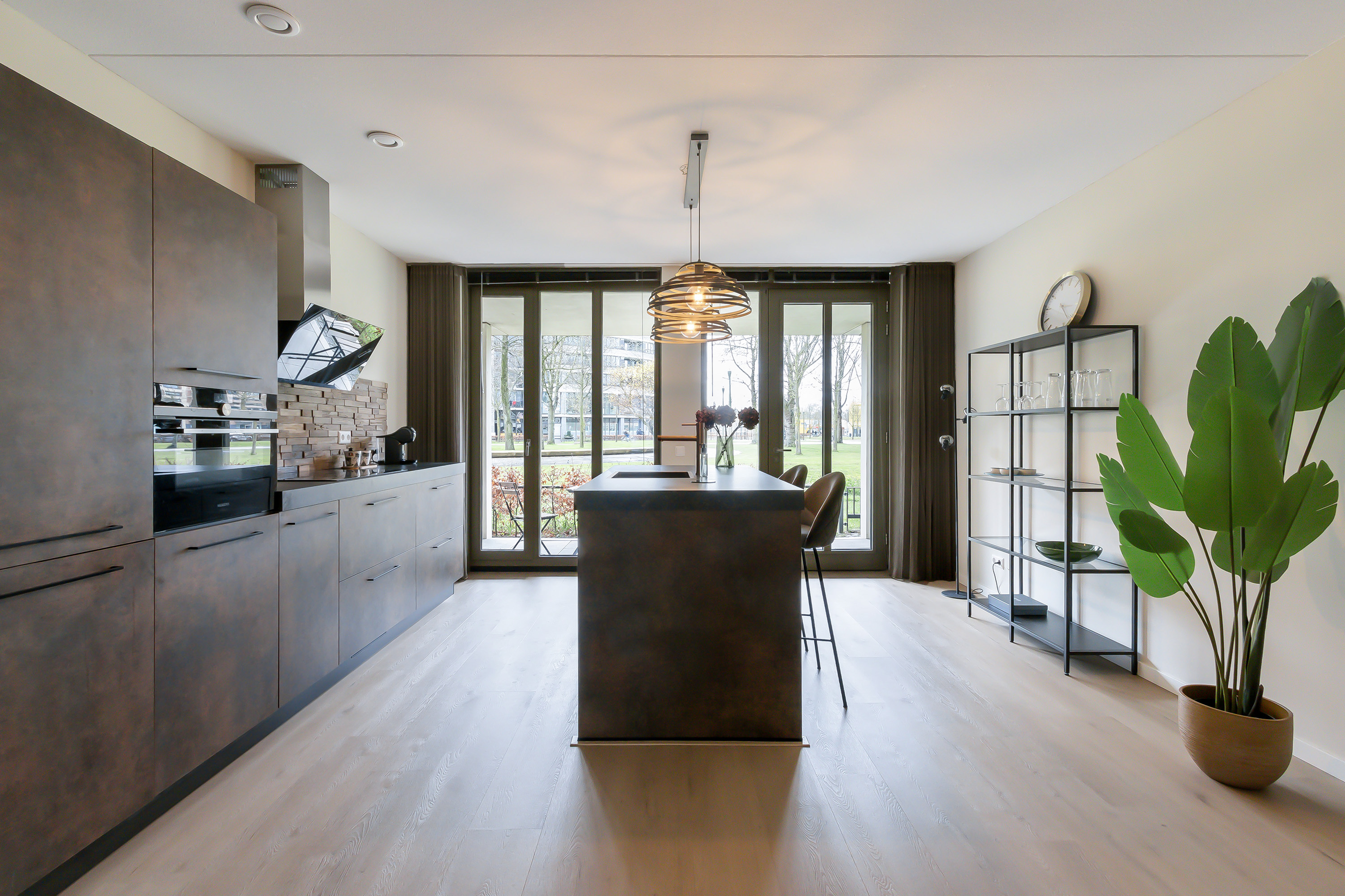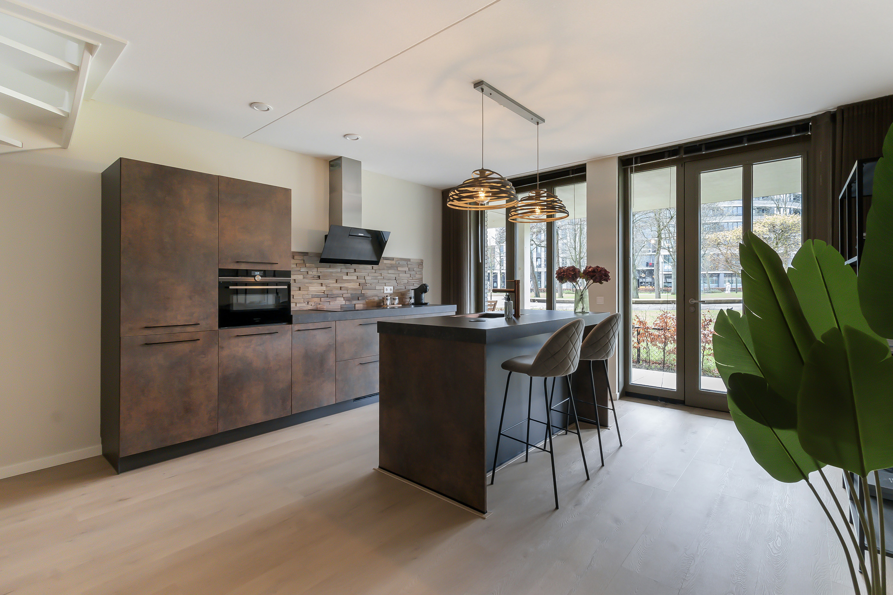 - Royale woonkeuken van circa 30 m² met vrij uitzicht over de Leerparkpromenade, uitgevoerd met een wandopstelling en een spoeleiland, voorzien van een kunststof extra dik werkblad (Bruynzeel) en diverse inbouwapparatuur van Siemens: inductiekookplaat, afzuiging, vaatwasser, combi-oven (Studioline) en koel-/vriescombinatie;