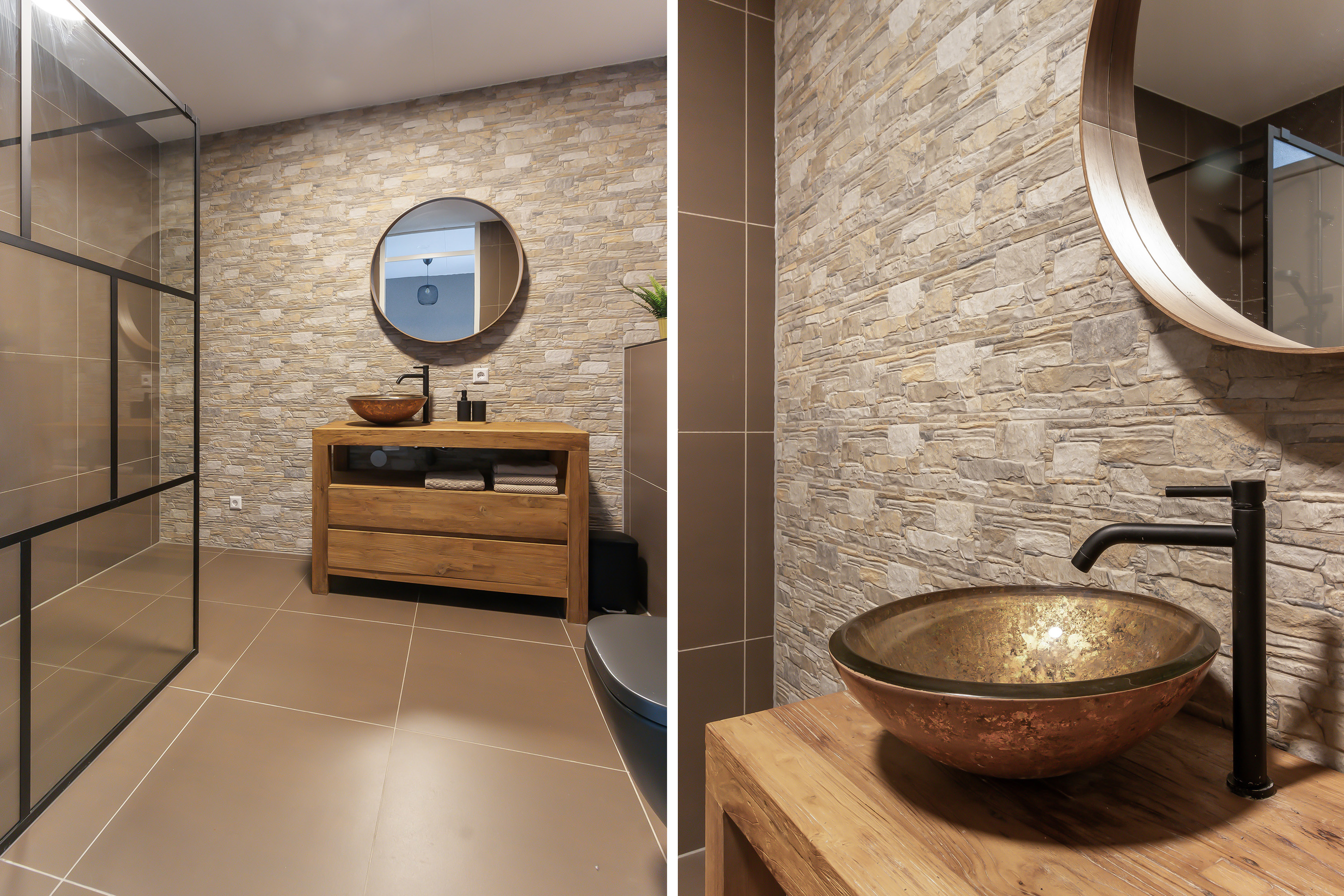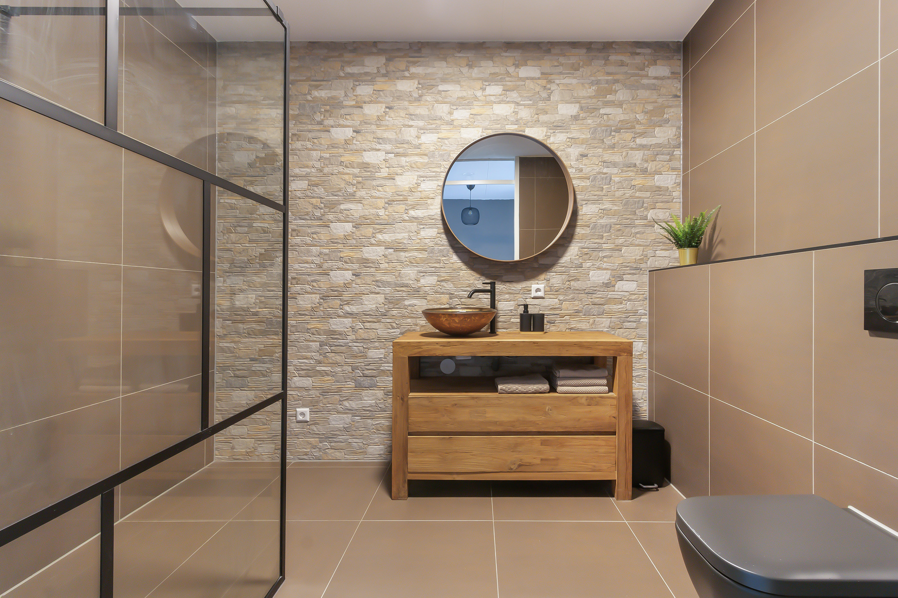 - Moderne badkamer, volledig betegeld met 60x60 tegels en steenstrips. Voorzien van een ruime inloopdouche, wastafelmeubel en toilet.