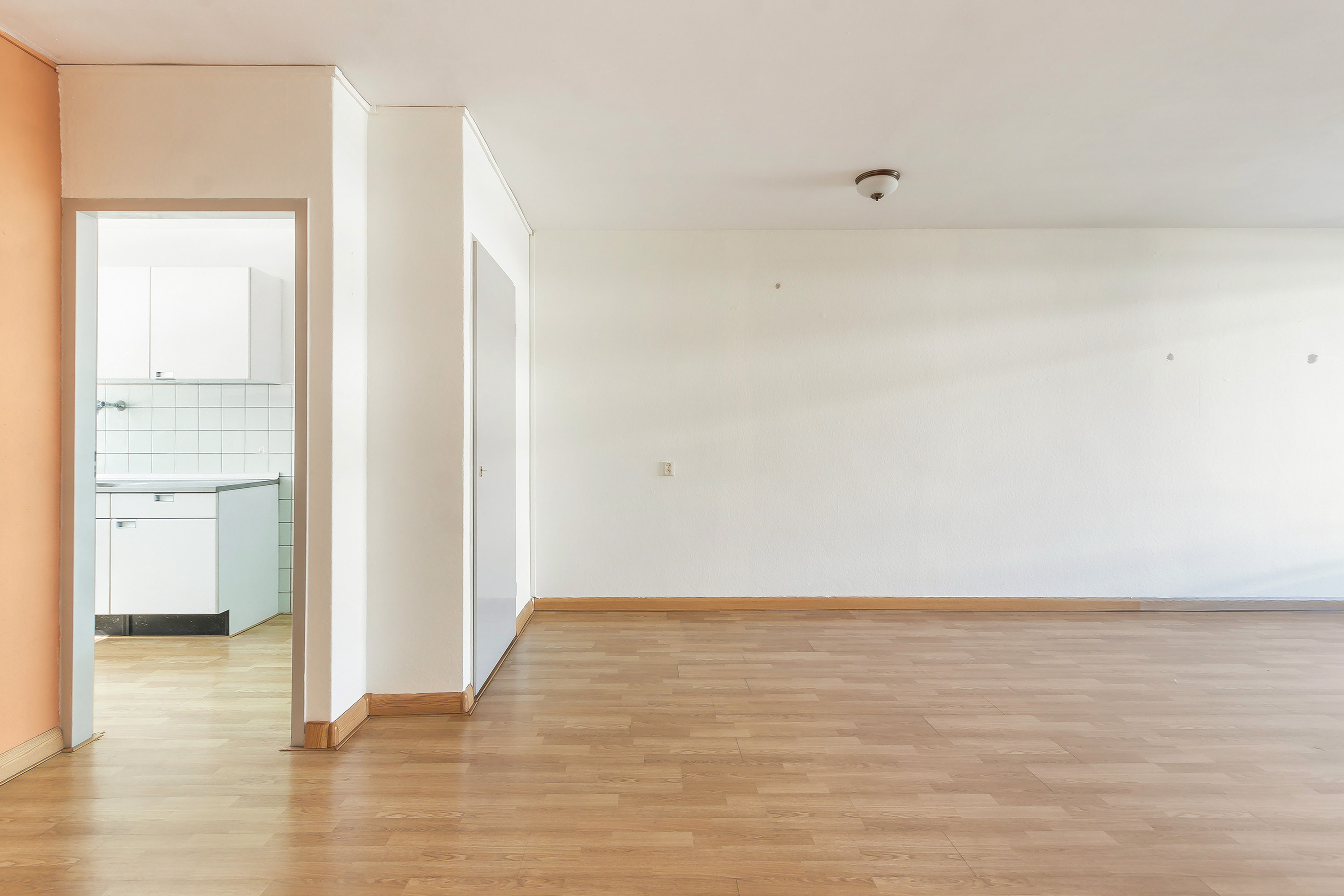 De ruime woonkamer geeft toegang tot het balkon, dat zich uitstrekt over de volledige breedte van de woning. Dankzij de oostelijke ligging geniet je hier met een lekkere kop koffie of thee van de ochtendzon. De dichte keuken is eenvoudig en biedt voldoende opbergruimte.