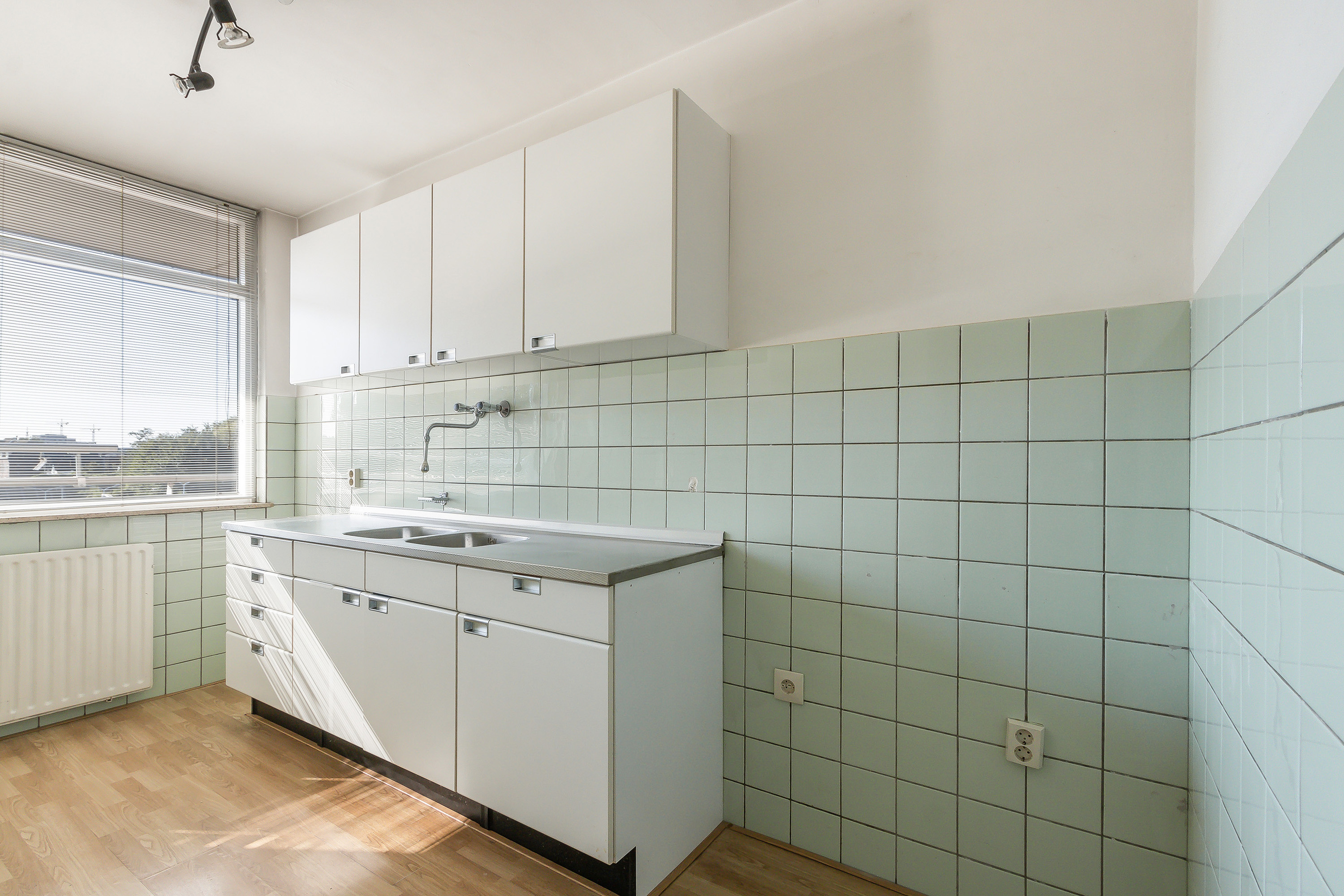 - Half open keuken, gelegen aan de galerijzijde met eenvoudige Bruynzeel inrichting (wit) met rvs werkblad, dubbele spoelbak, diverse boven- en onderkasten, opstelplaats t.b.v. de wasmachine/ vaatwasser. Gedeeltelijk betegelde wanden;
