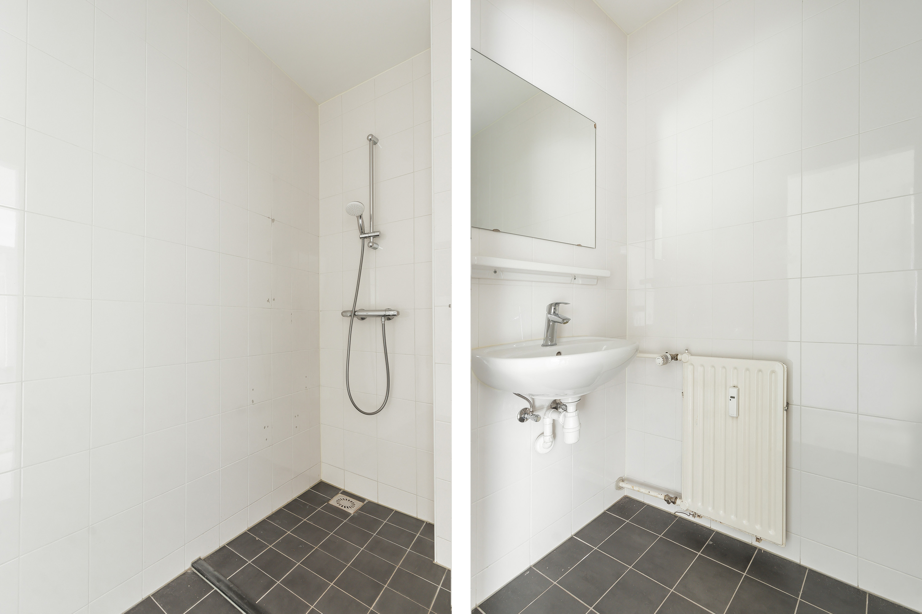 - Eenvoudige badkamer met geheel betegelde wanden, een tegelvloer, wit sanitair, wastafel met spiegel, een douche met thermostaatkraan en een cv radiator;