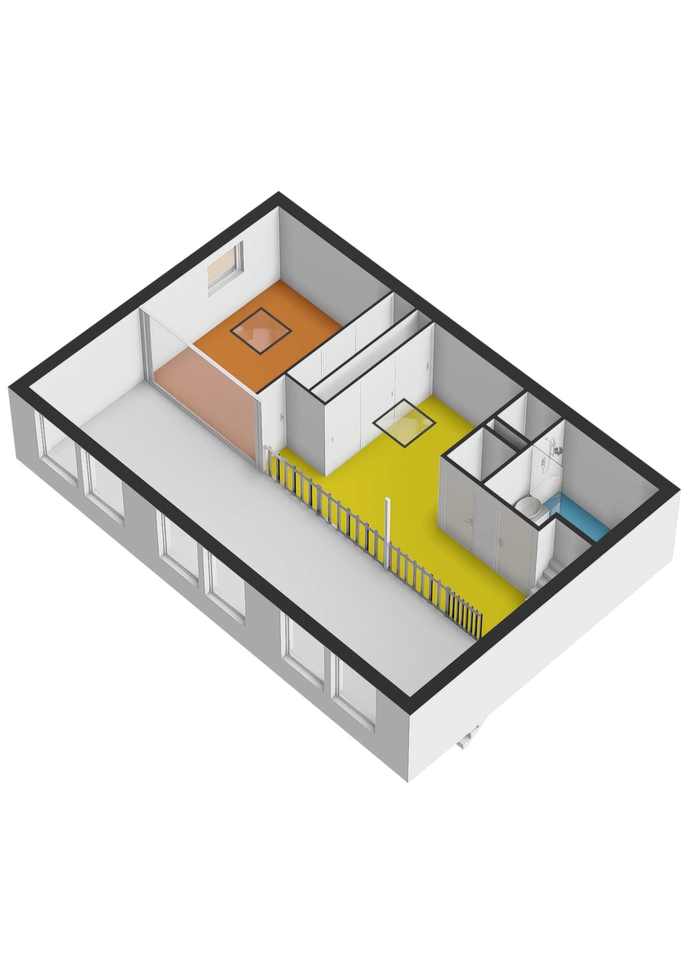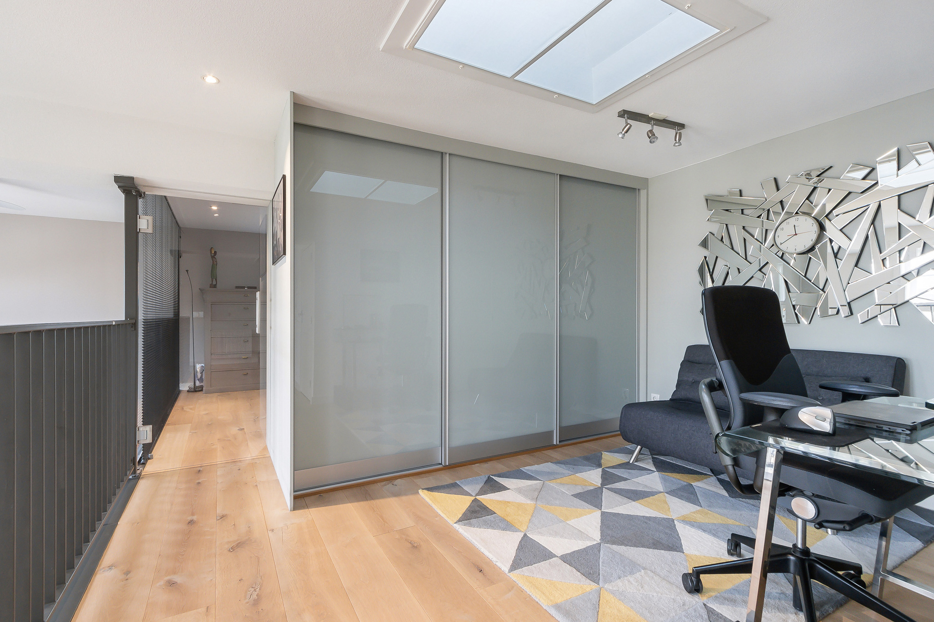 - Study met elektrisch bedienbaar daklicht en verduisteringsscreen, een inbouwkast en een 3-deurs schuifdeurkast;