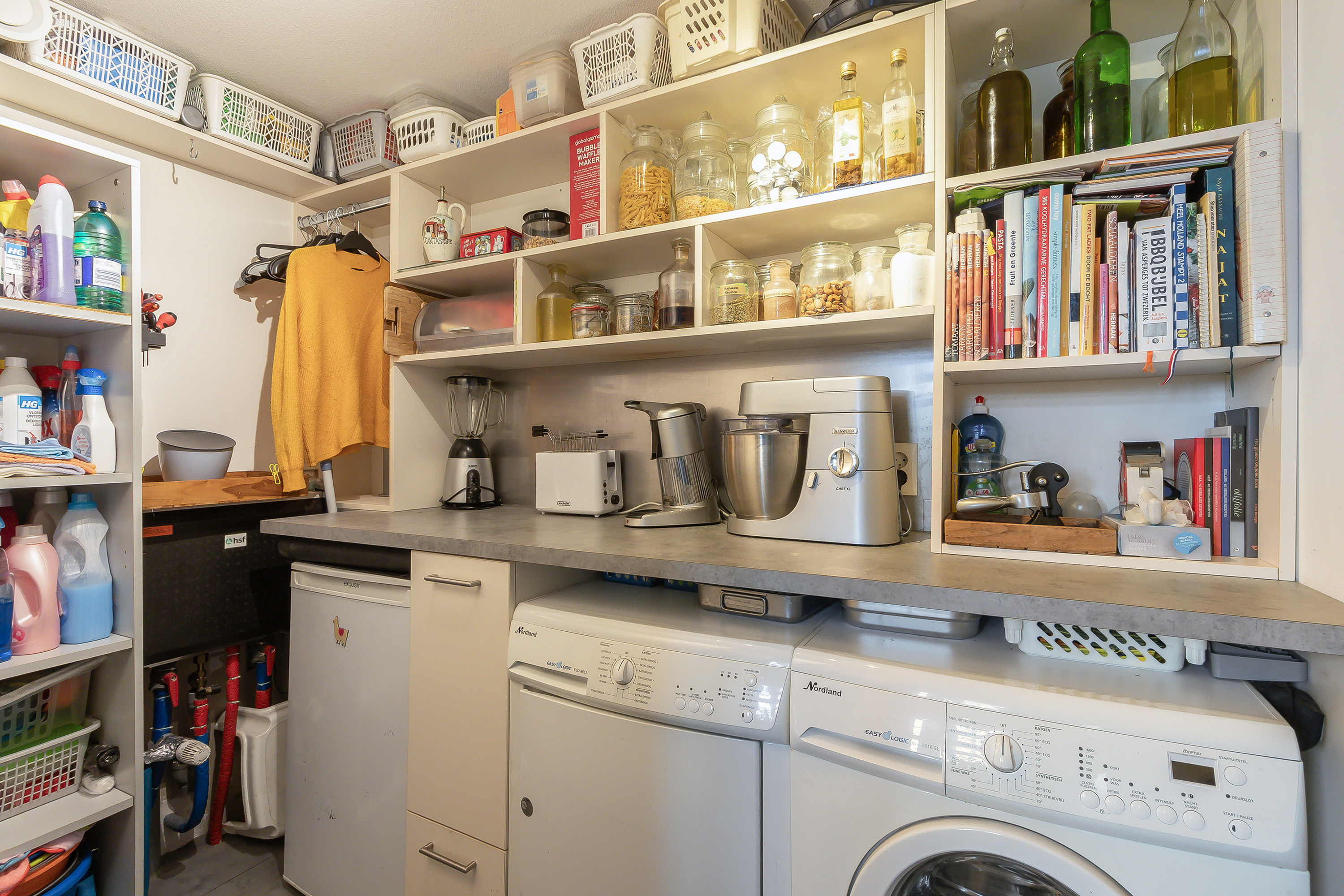 - Een praktische bijkeuken met een tegellambrisering, een tegelvloer, de opstelplaats t.b.v. de vriezer, de wasmachine, de wasdroger, de geïntegreerde wasmand en de verdeelunit van HVC stadsverwarming. Aan de andere zijde een vaste voorraadkast.
