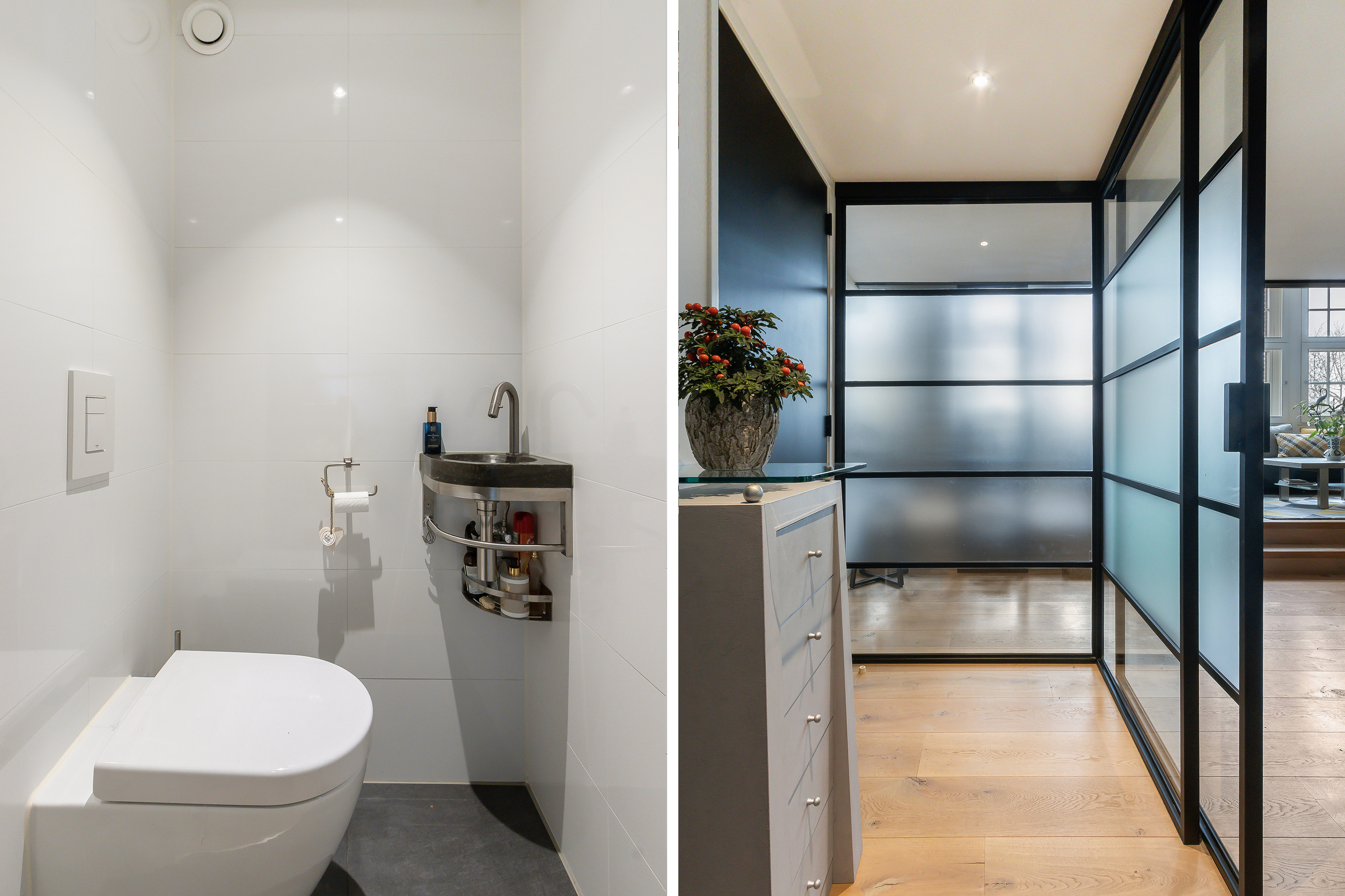 - Een stoere entreehal van staal en glas met een schuifdeur naar de woonkamer, een garderobekast (inclusief meterkast) en een toilet;