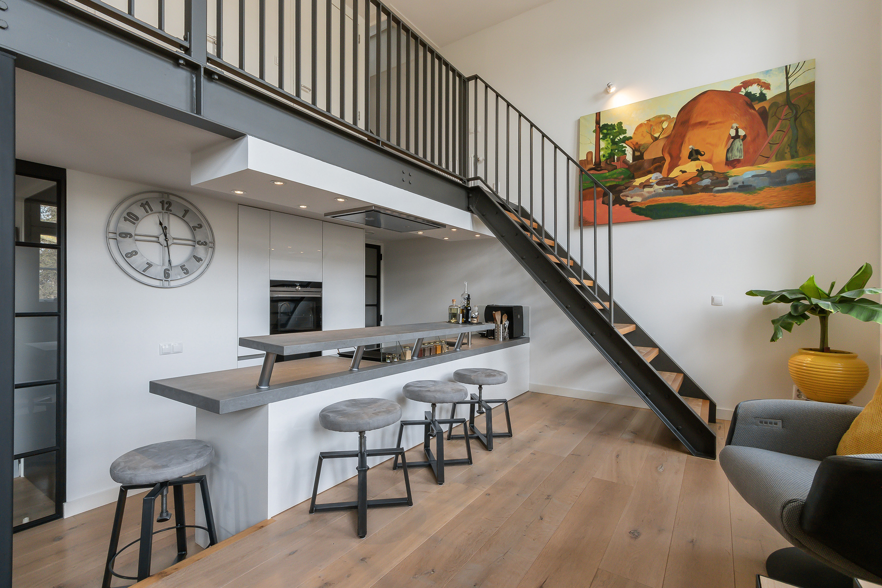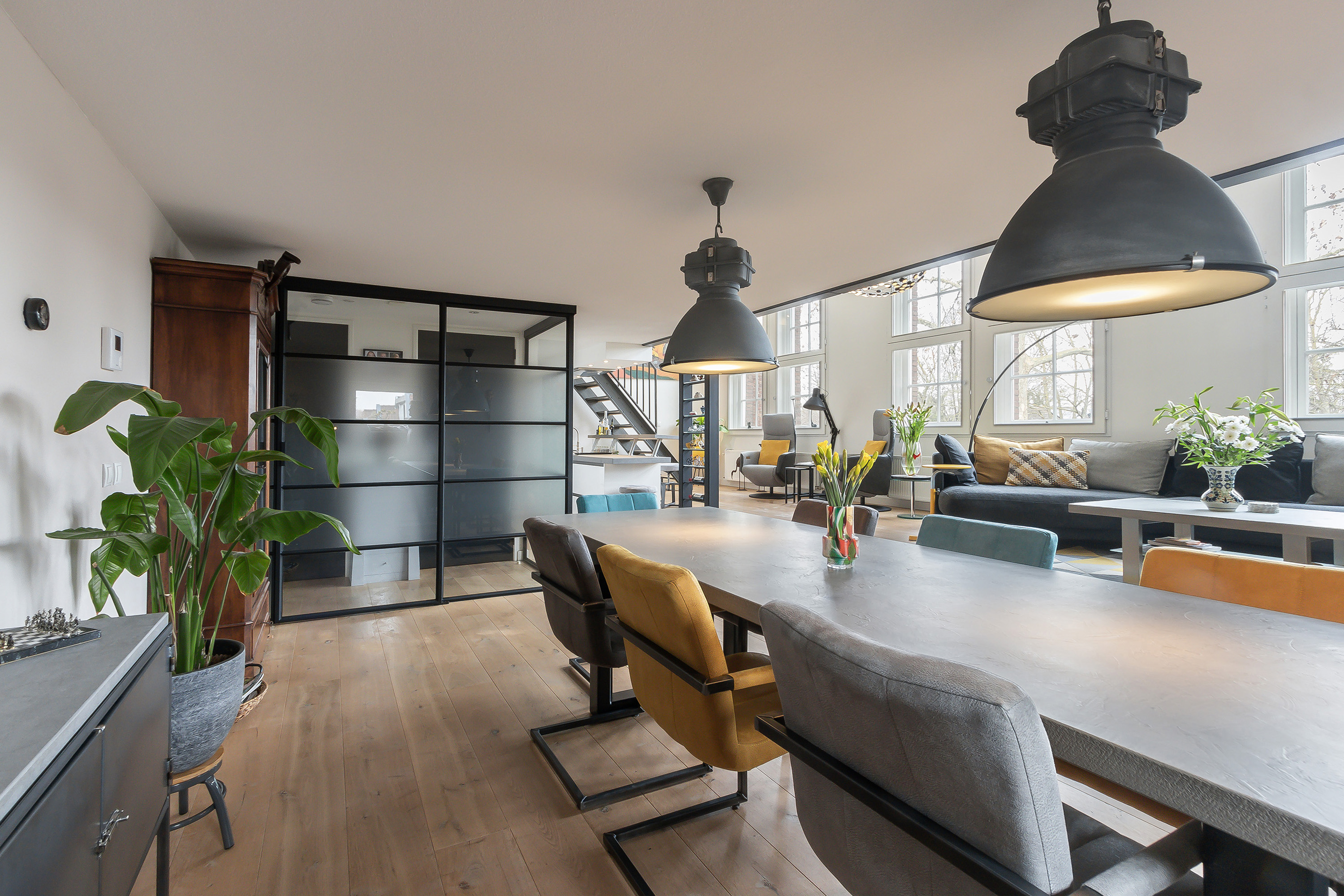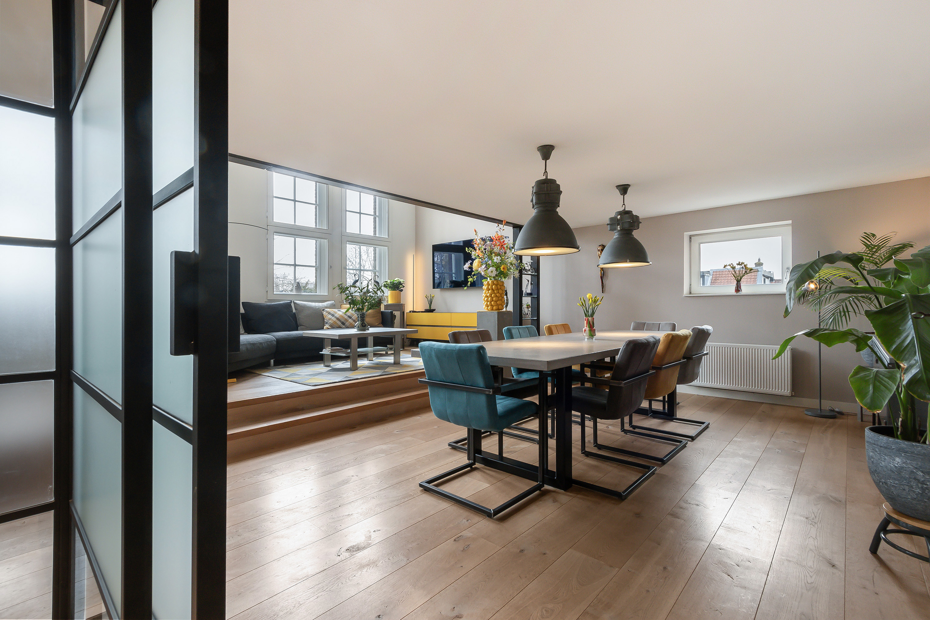 - Woonkamer met vide over de volle breedte (ca. 10.50 m., wat een heerlijk ruimtelijk gevoel geeft) met 3 grote raampartijen met elektrische zonwering, er is speels niveauverschil (2 traptreden) en een hoog plafond aan de voorzijde van ca. 4.30 m. (het zitgedeelte). Een stalen trap naar de vide. Onder de vide bevindt zich het gezellige eetgedeelte met de mogelijkheid van een lange (3 m.) eettafel. In de zijgevel bevindt zich een extra raamkozijn met veel licht inval;