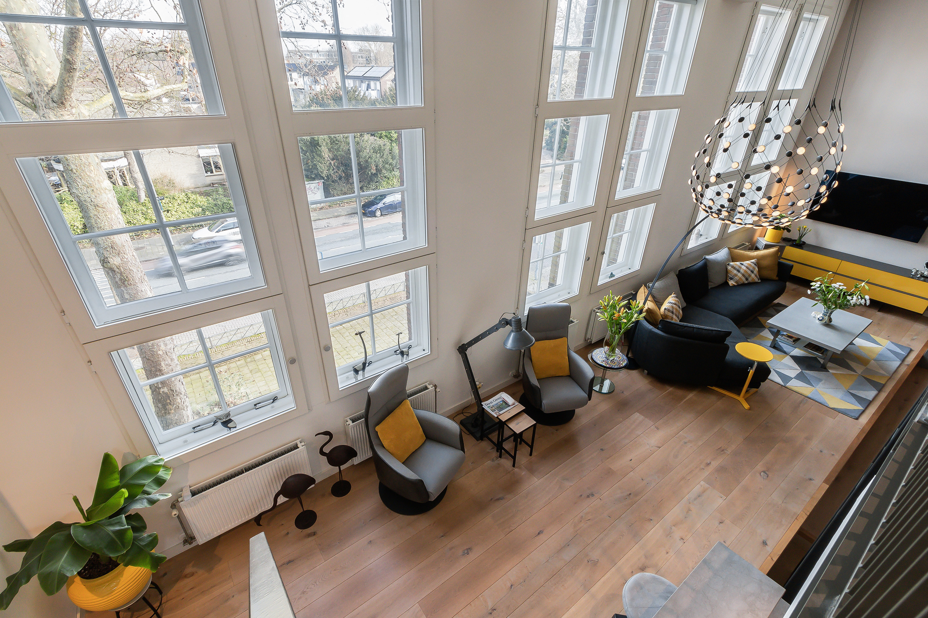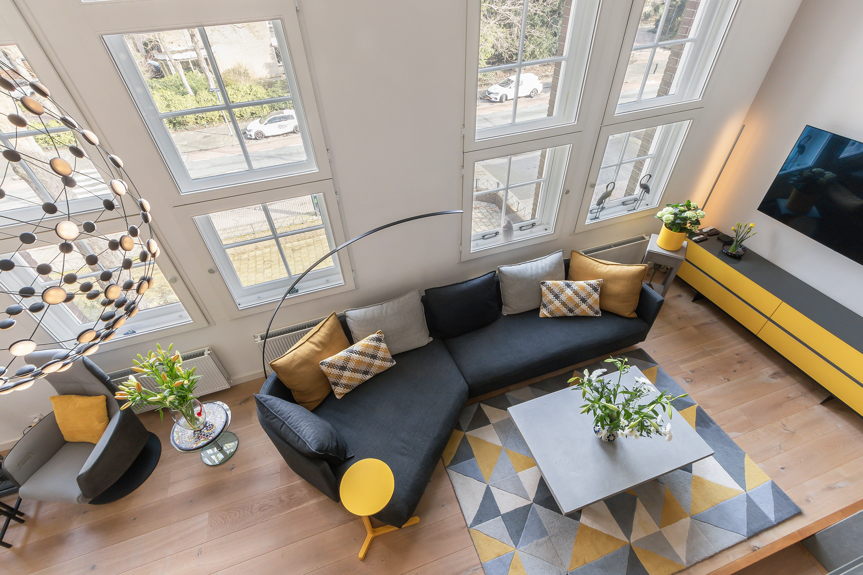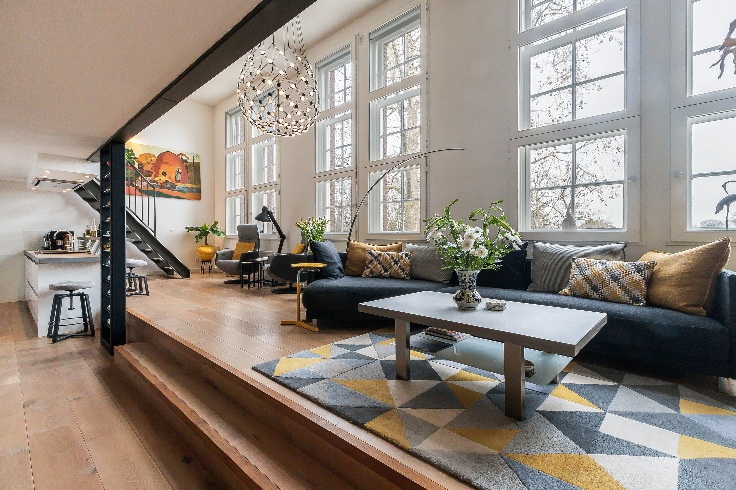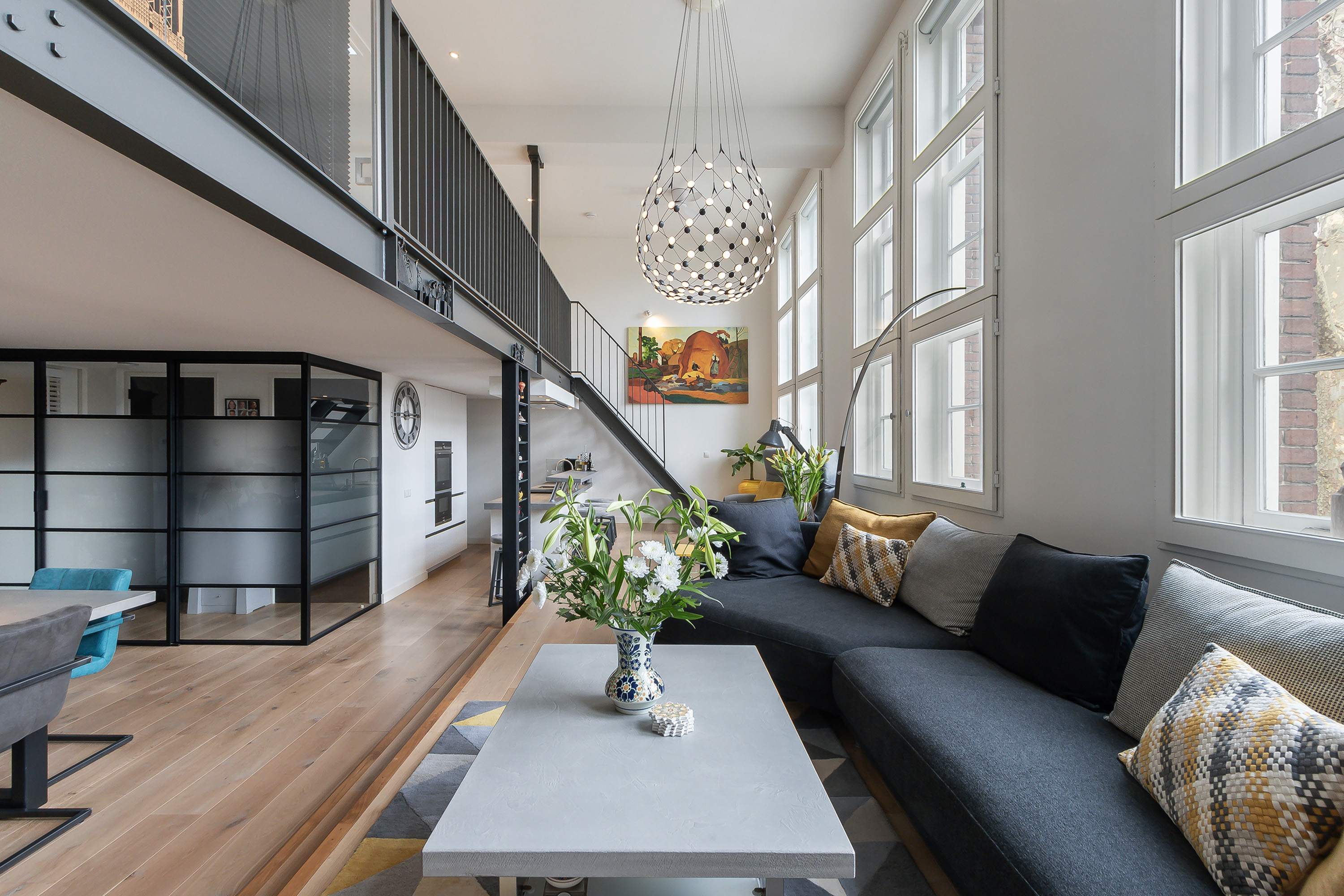 hoogte van het plafond met enorme ramen die het licht mooi door het appartement