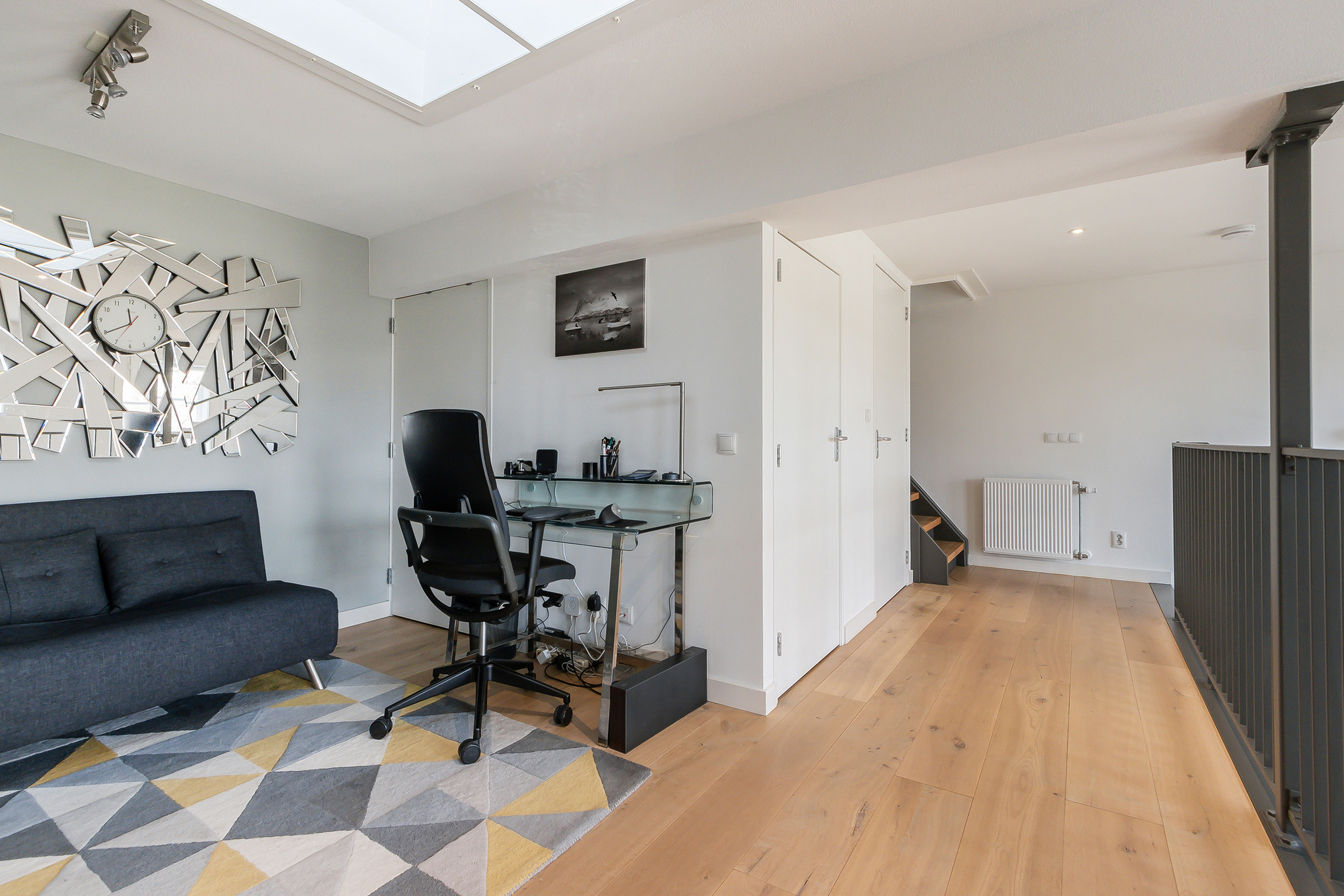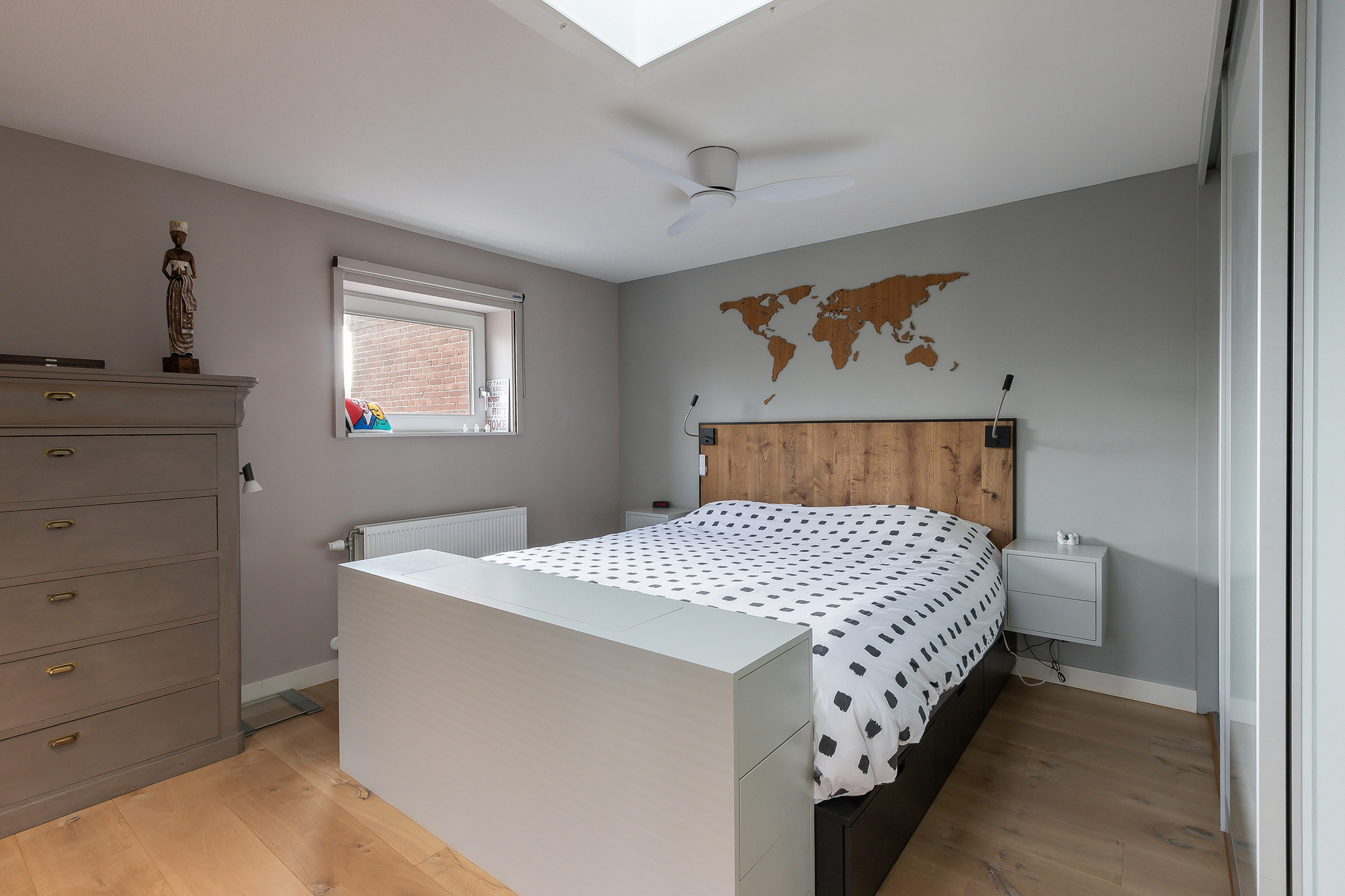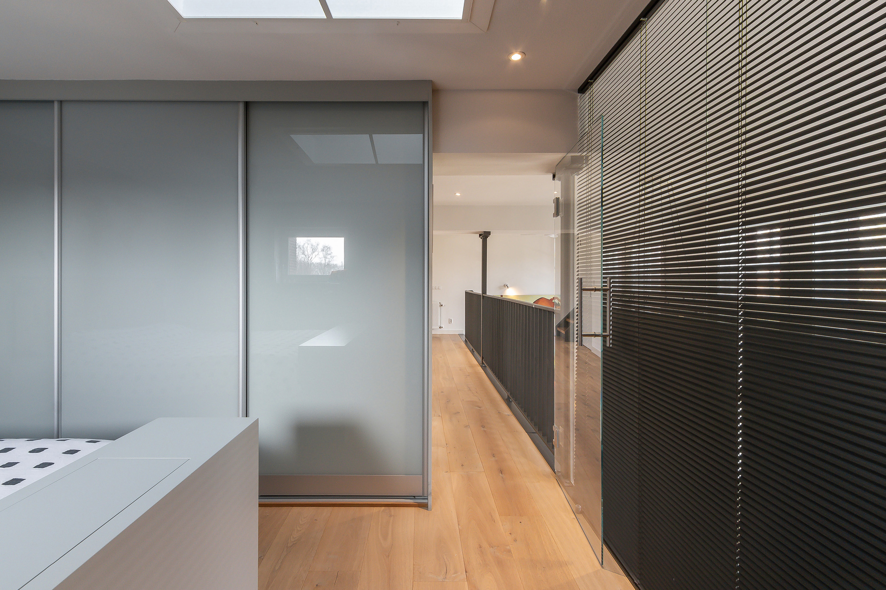 - Grote slaapkamer met elektrisch bedienbaar daklicht en verduisteringsscreen, een extra raamkozijn in de zijgevel met verduisteringsgordijn, een 3-deurs schuifdeurkast en een hardglazen pui en deur als warmte- en geluiddempende afscheiding met de vide;