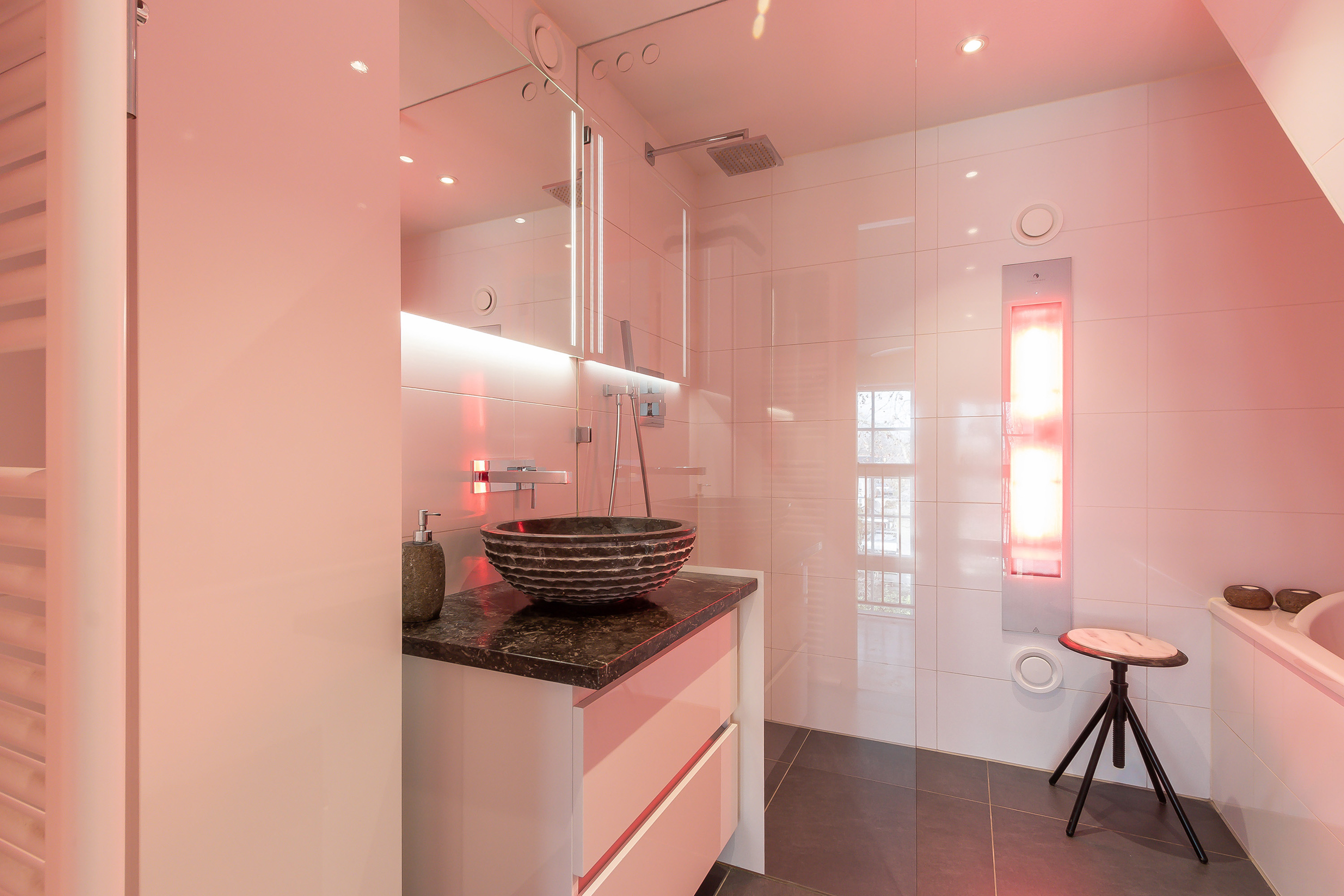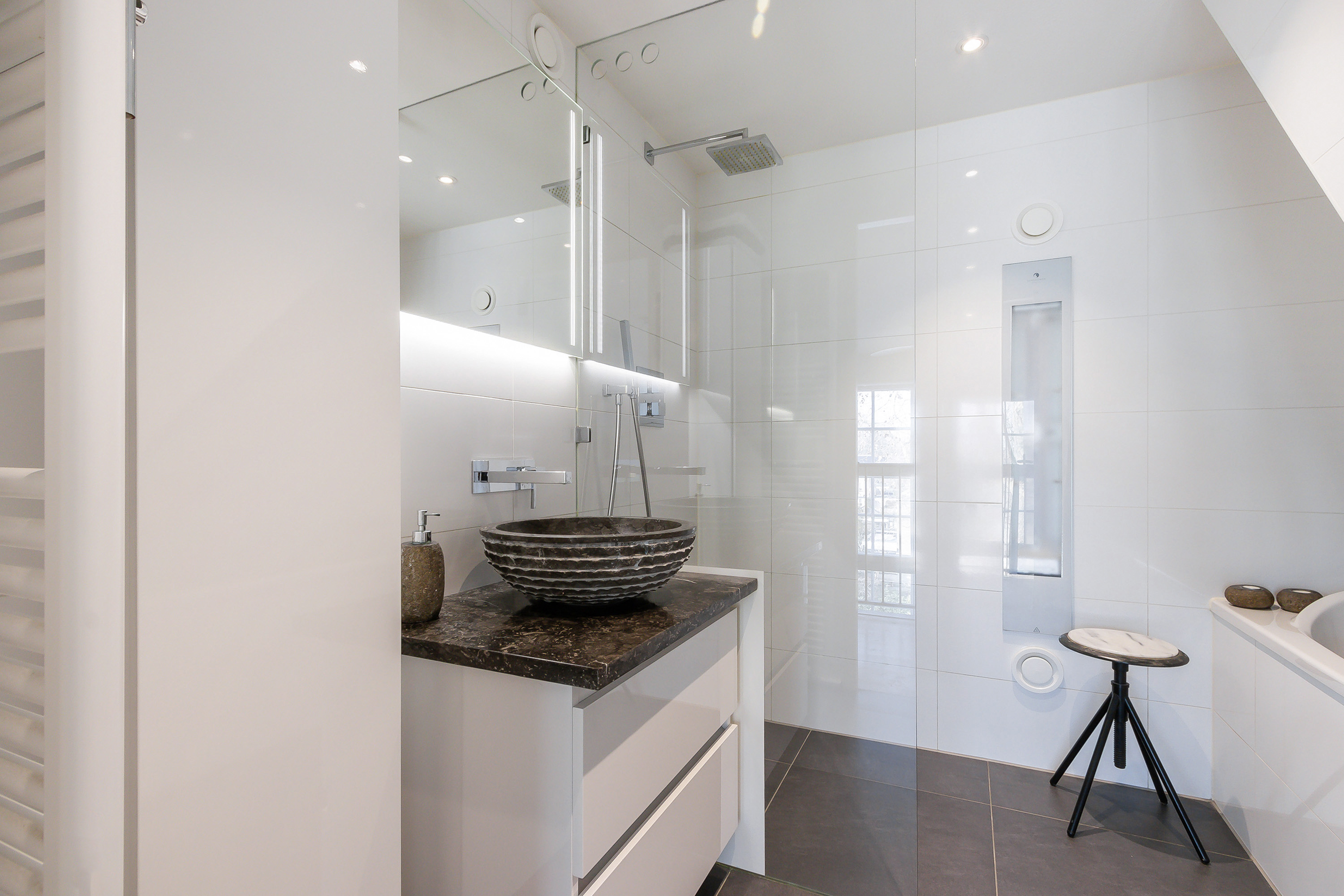 - Moderne badkamer met geheel betegelde wanden, een tegelvloer, wit sanitair, een wastafelmeubel met spiegelcombinatie, luxe kranen, een wandkast, een fijne inloopdouche met sunshower, een ligbad en een designradiator.