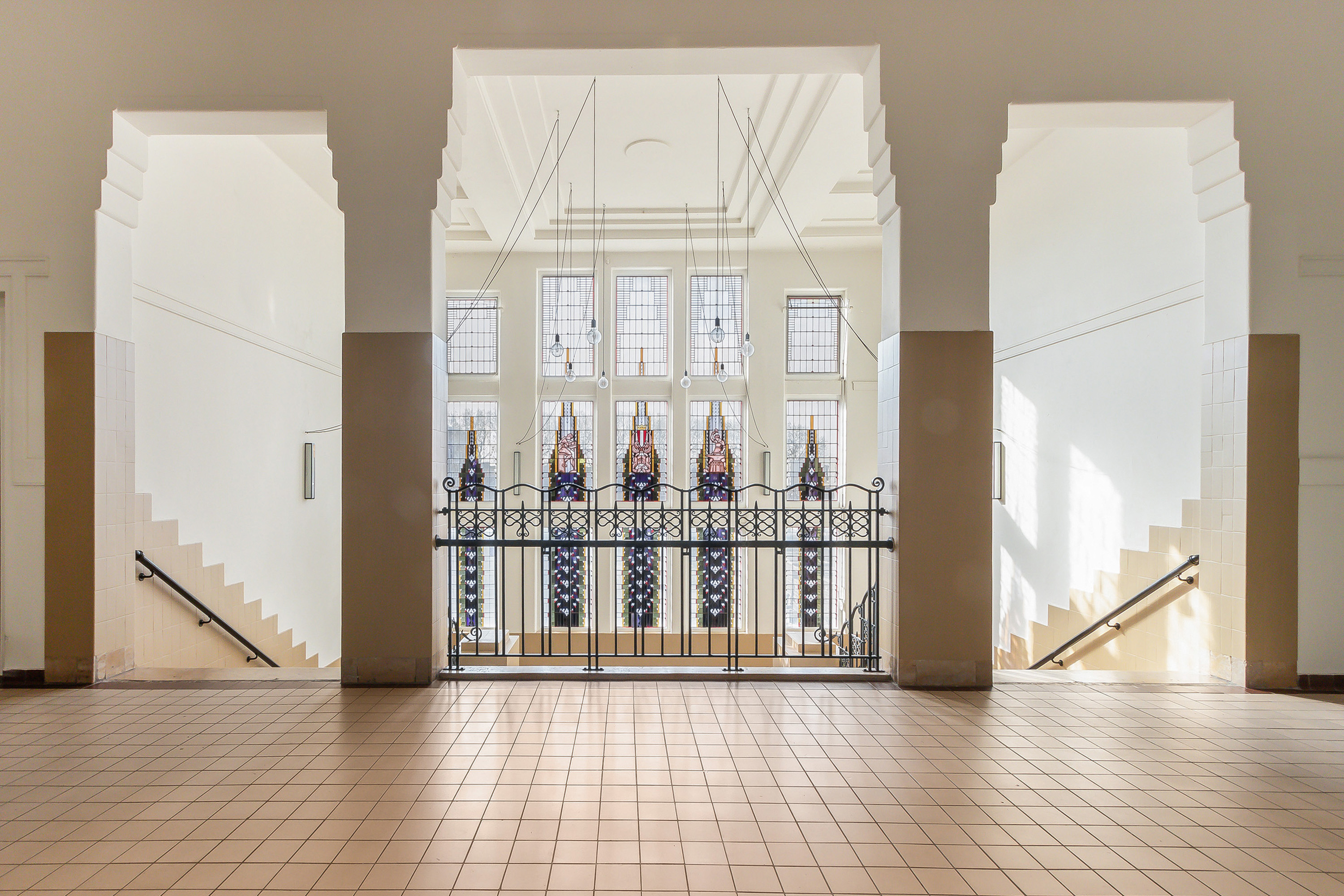 en een prachtig centraal trappenhuis met glas-in-lood ramen (ondanks dat het
