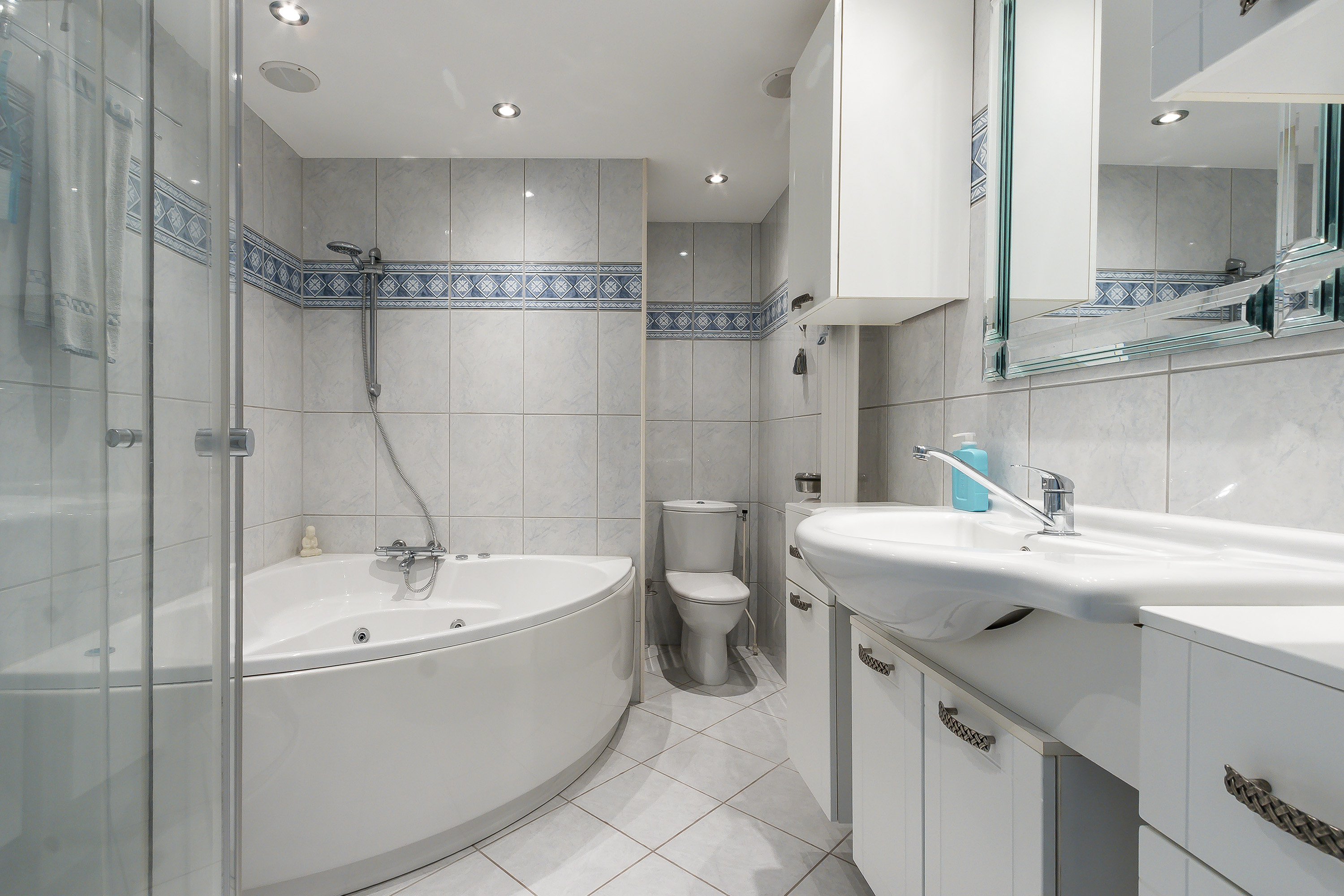 - Badkamer: Volledig betegeld en uitgerust met inbouwspots, ligbad (whirlpool), douchecabine, toilet en wastafelmeubel;