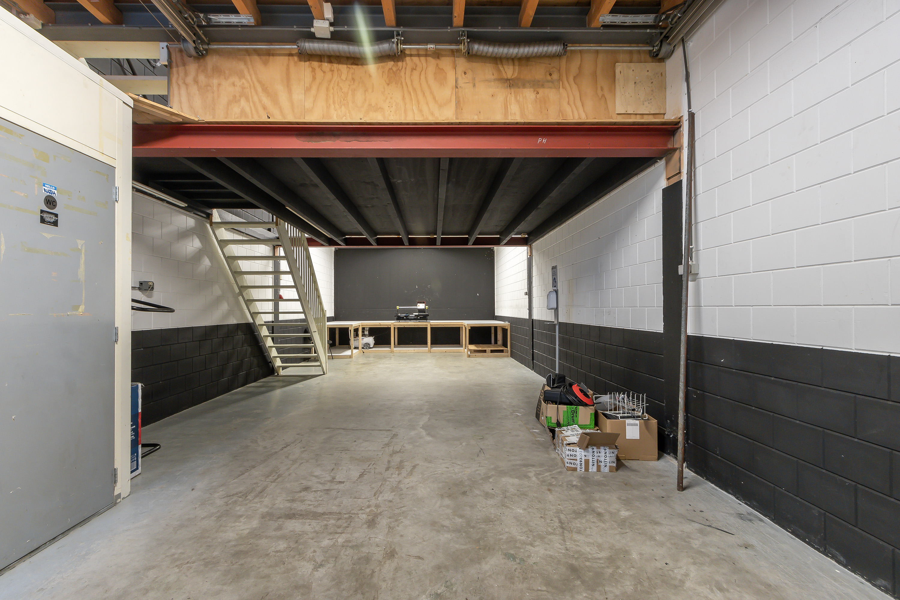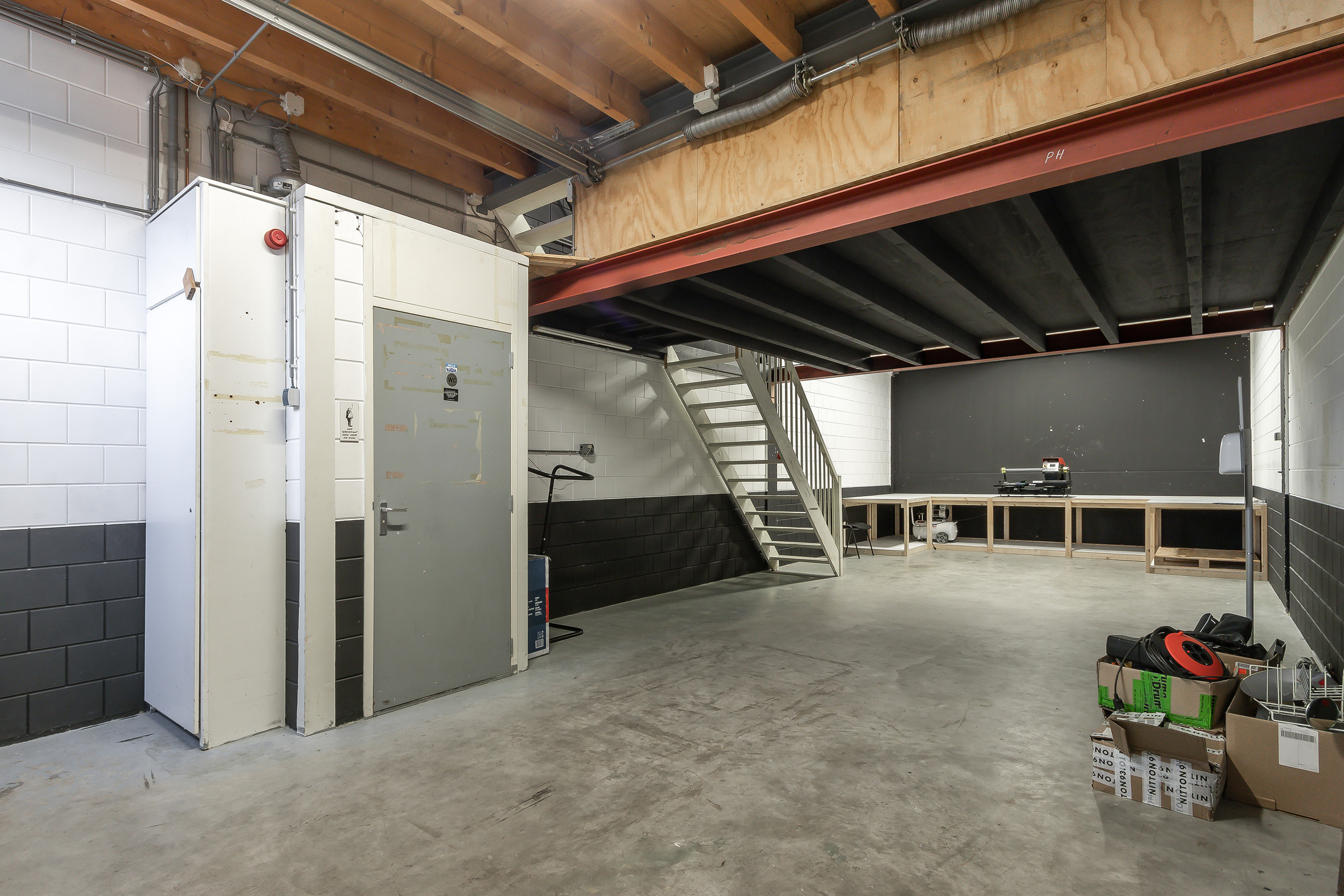 Bedrijfsruimte met open trap naar insteekverdieping en een toilet.