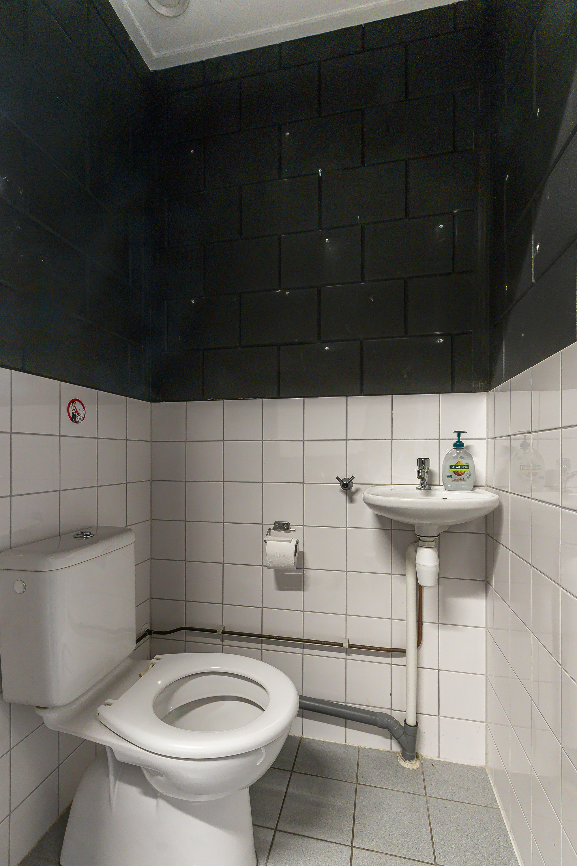• Toilet met gedeeltelijk betegelde wanden, wit sanitair, fontein, tegelvloer;