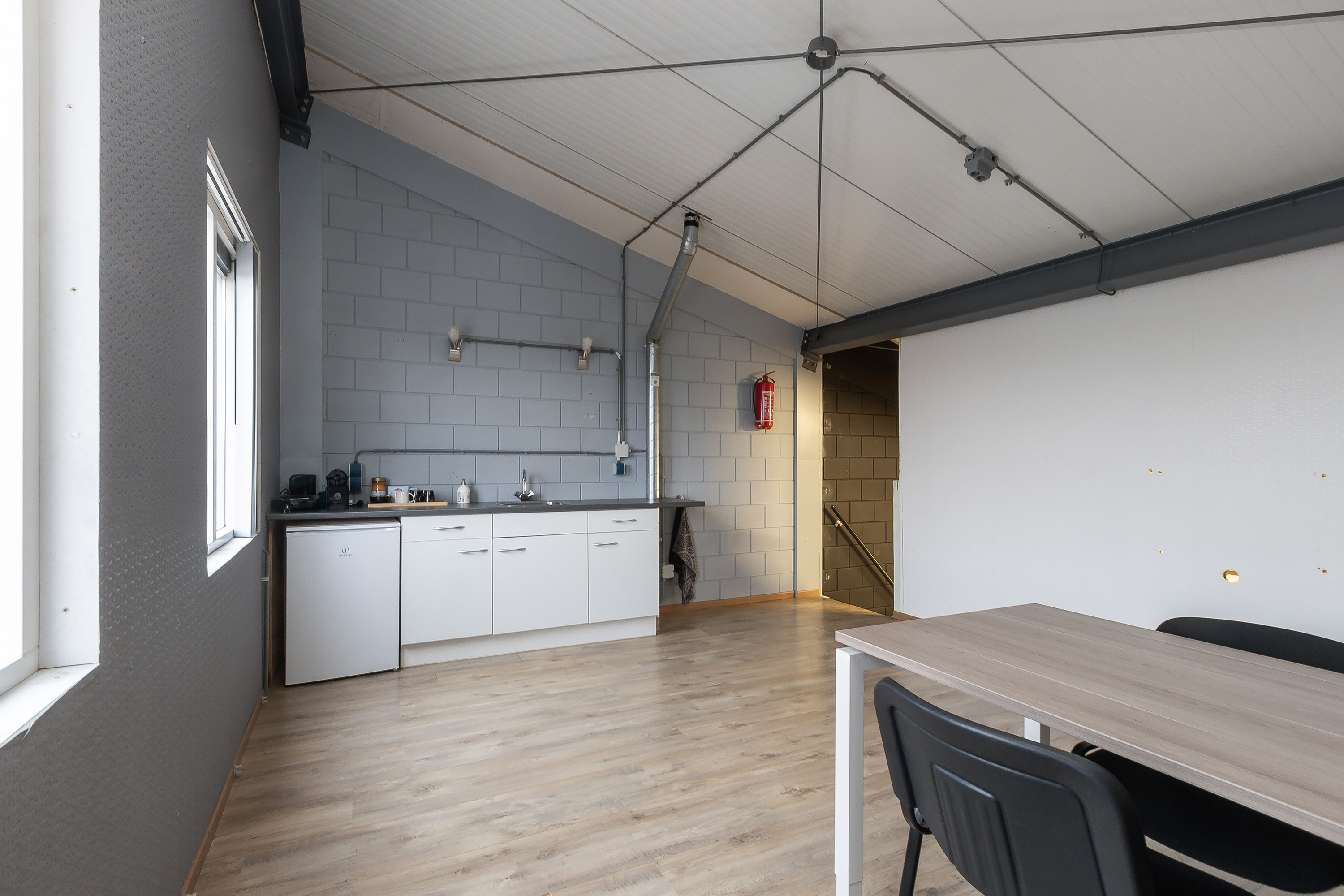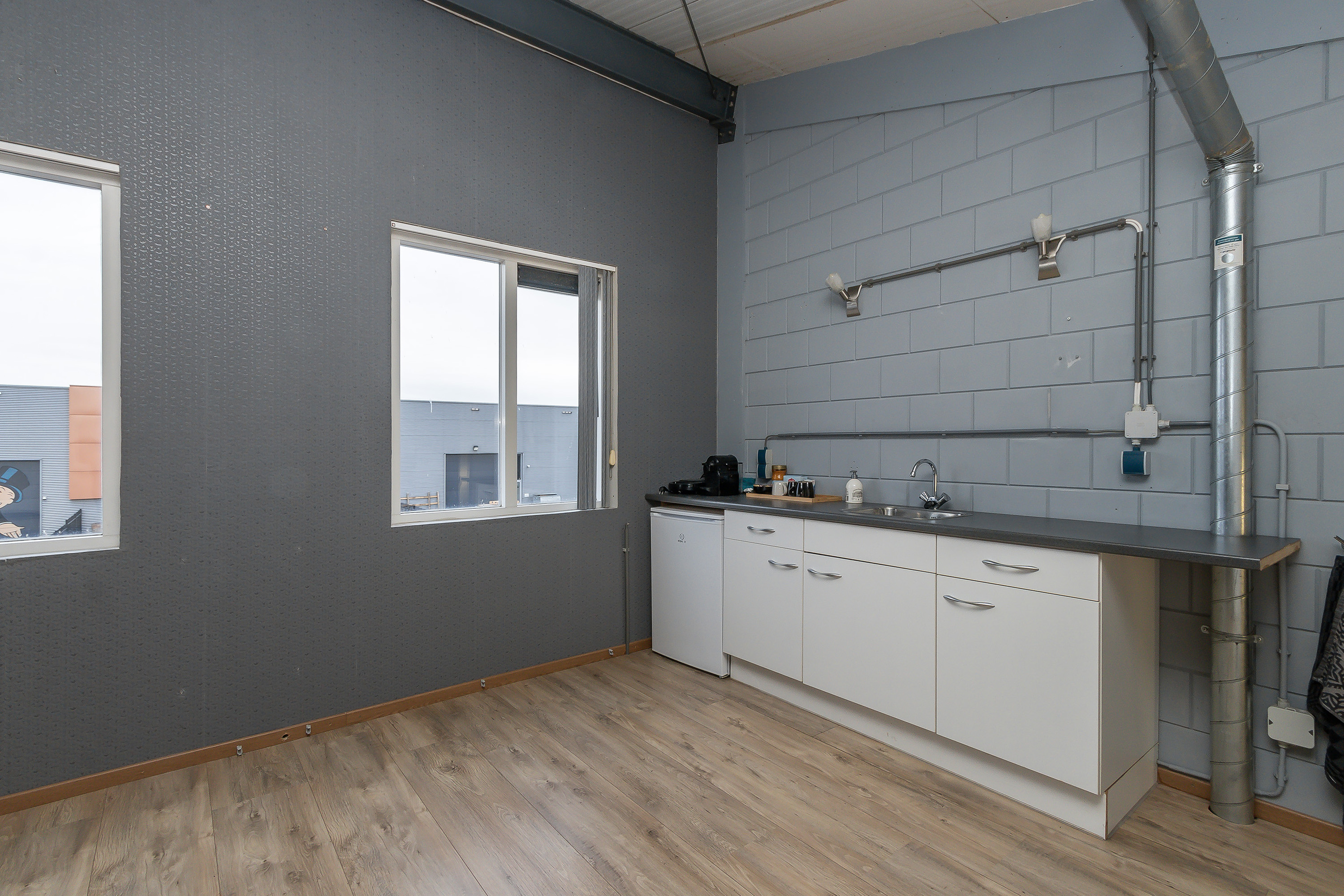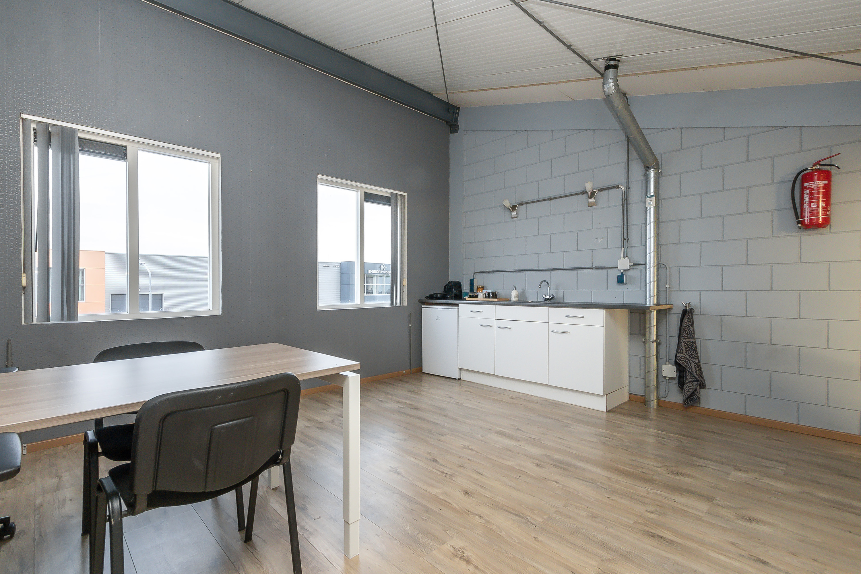 Kantoorruimte met 2 raamkozijnen aan de voorzijde en een keukenblokje.
