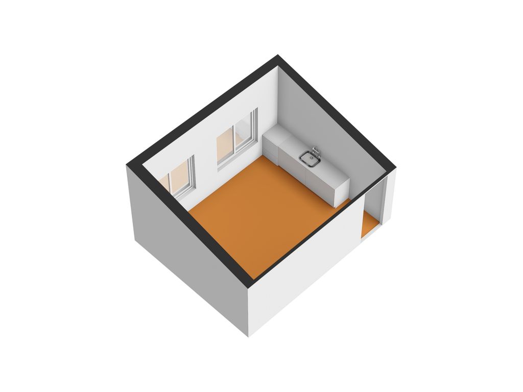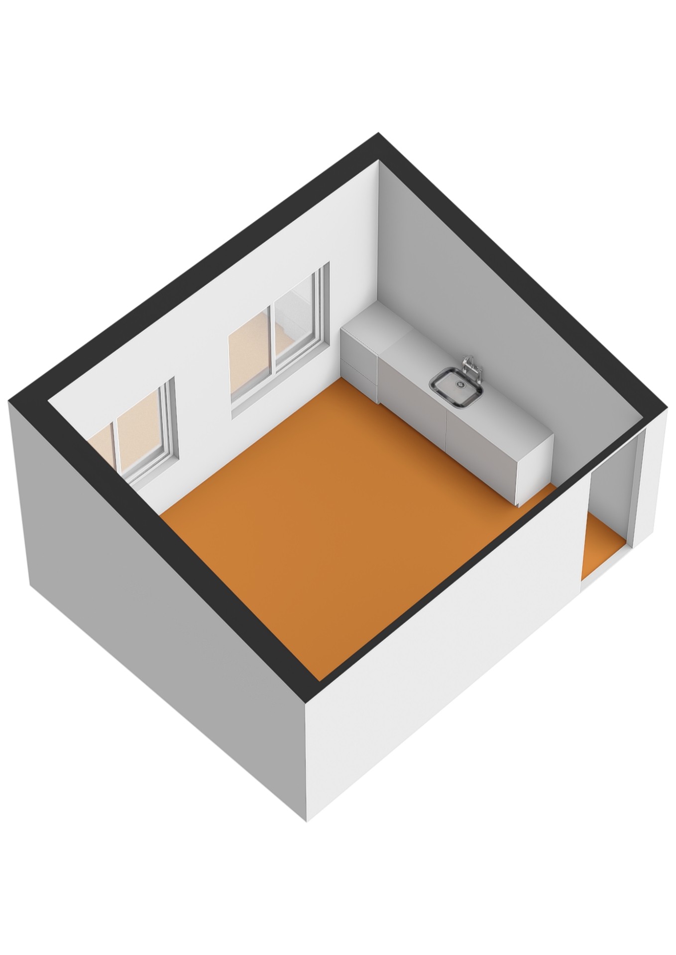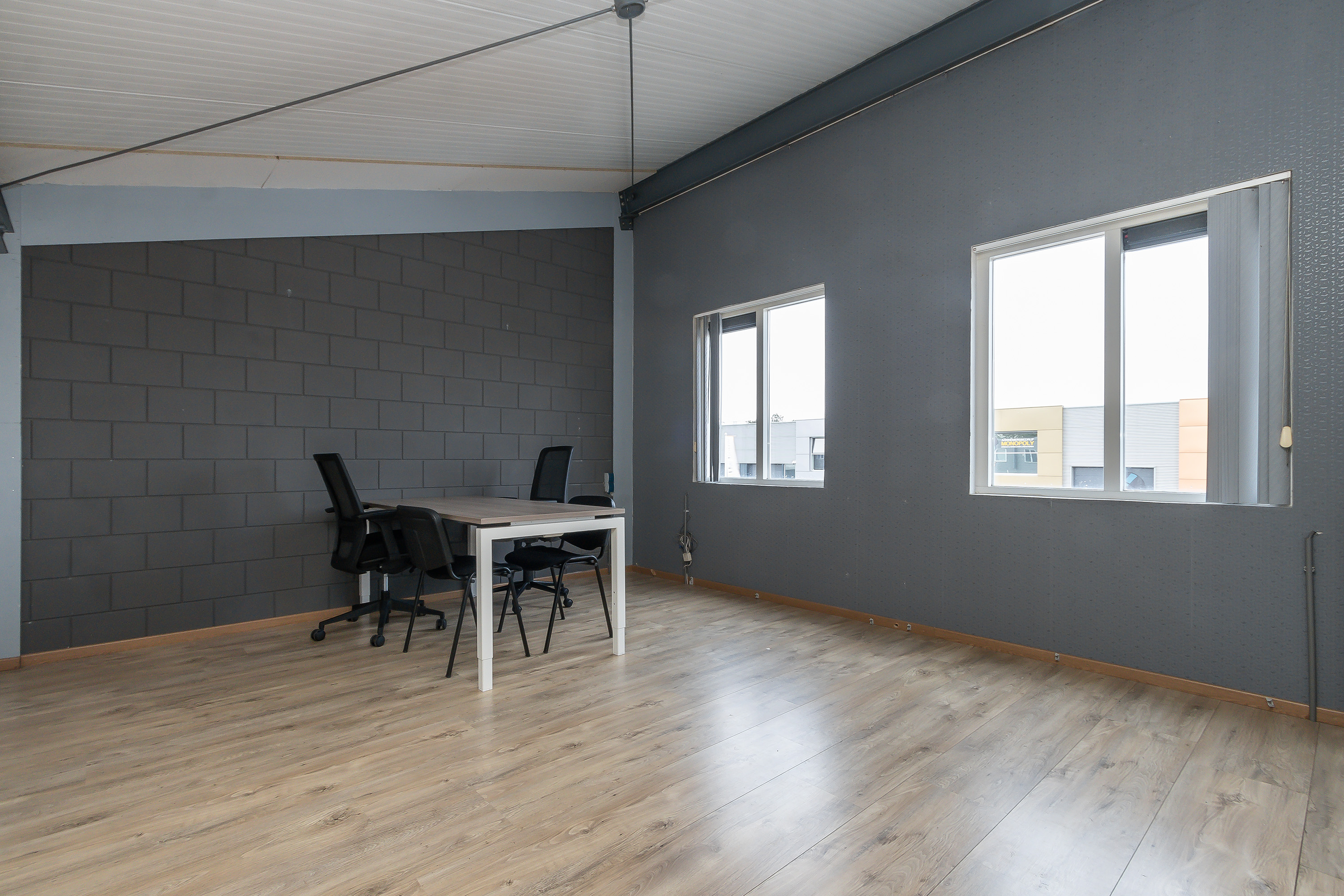 Kantoorruimte met 2 raamkozijnen aan de voorzijde en een keukenblokje.