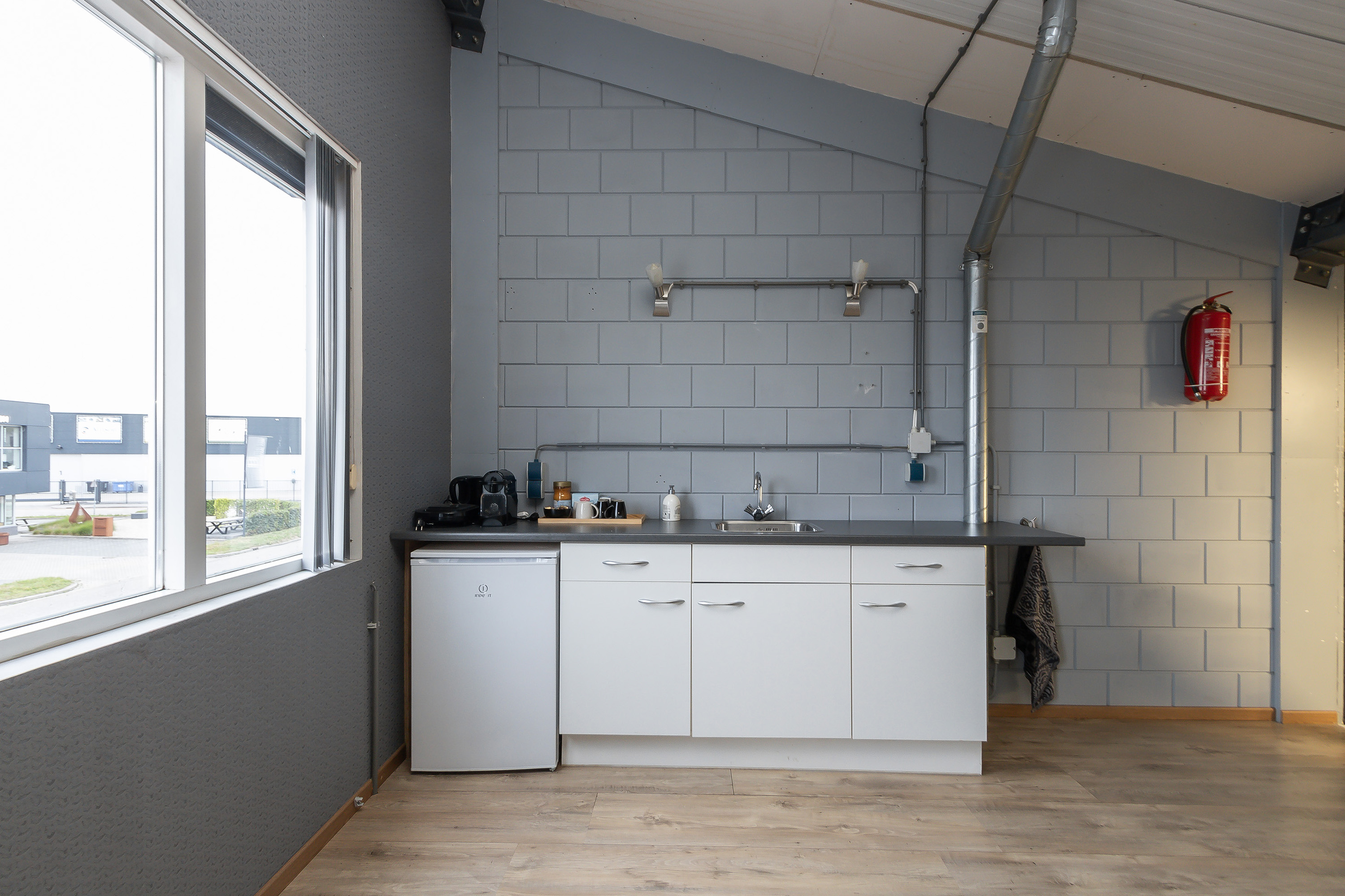 • Keukenblokje (wit) in kantoorgedeelte met enkele rvs spoelbak, 3 onderkastjes en een close-in boiler;